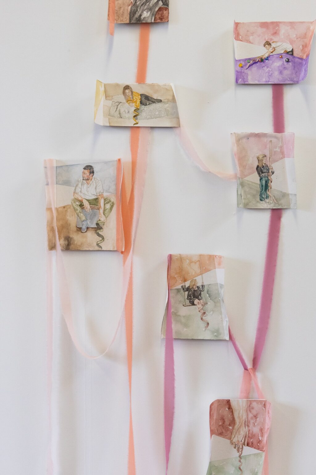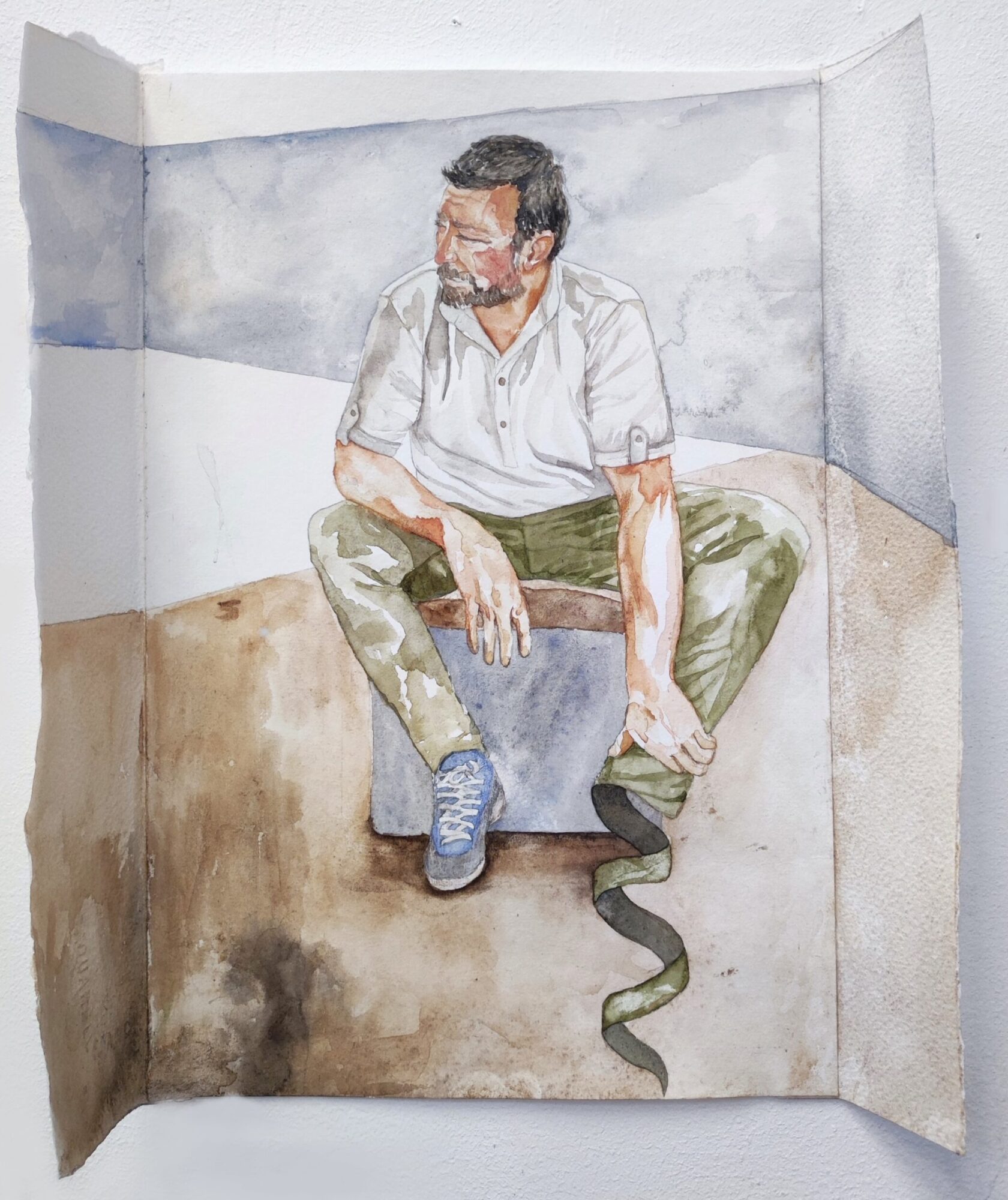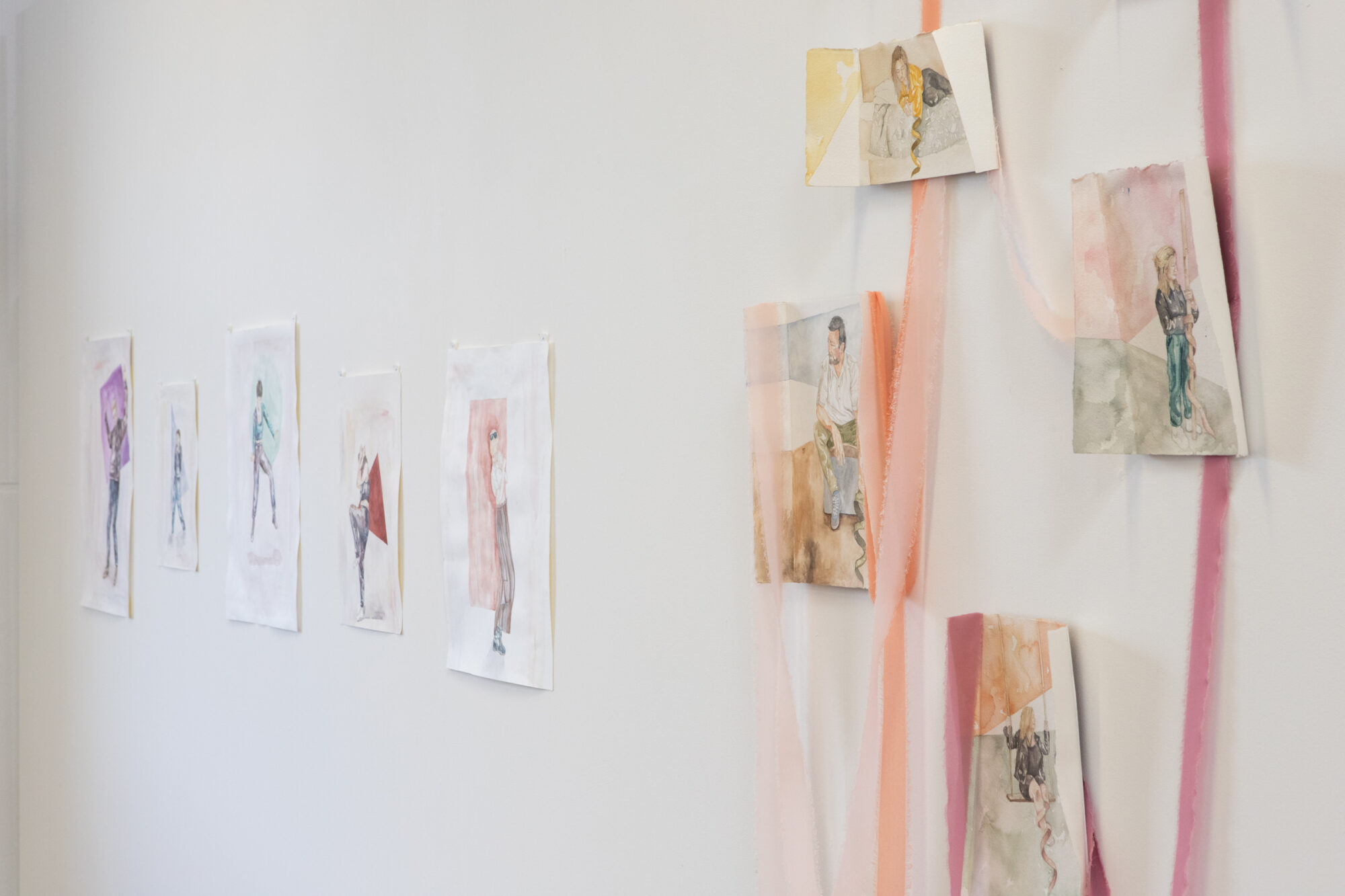 Cassie-Lee O’Rourke is a Wicklow-based artist whose main focus is representing figures and their vulnerability in relation to their environment. She uses people from her own life as references for the finished pieces. Her works has a sculptural element, with paper folded at different angles to enclose the figures. She uses simple lines, shapes and colours in the background to provide a spatial setting, without distracting from the figures. Her work aims to capture a sense of being exposed in the moment. Her work was exhibited in the show In the Making: Butter, in Pallas Project/Studios (2023).