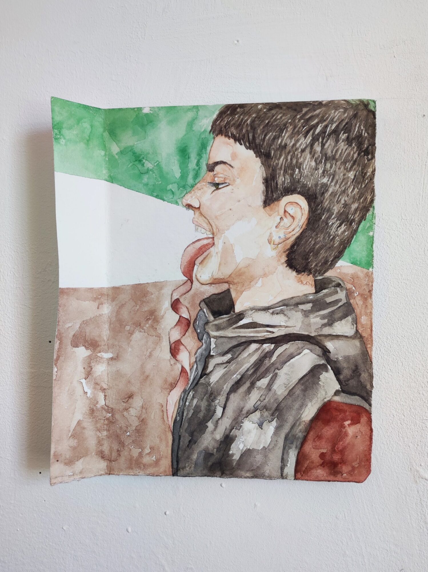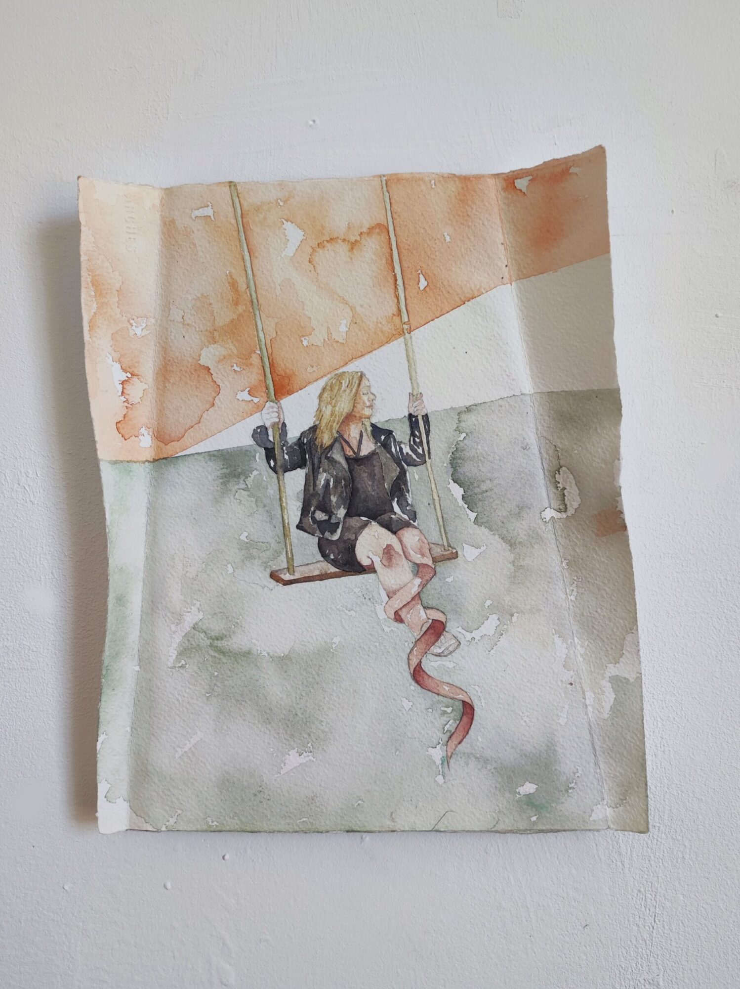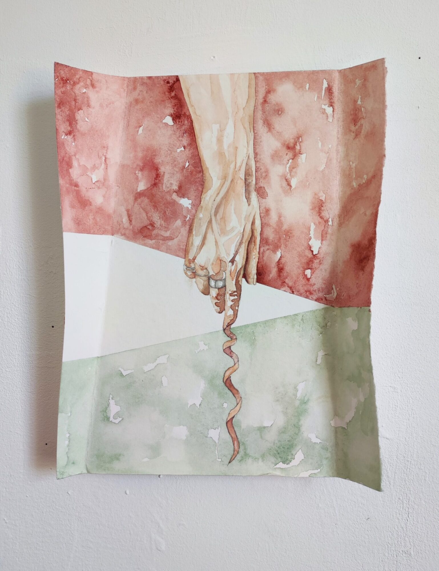 Cassie-Lee O’Rourke is a Wicklow-based artist whose main focus is representing figures and their vulnerability in relation to their environment. She uses people from her own life as references for the finished pieces. Her works has a sculptural element, with paper folded at different angles to enclose the figures. She uses simple lines, shapes and colours in the background to provide a spatial setting, without distracting from the figures. Her work aims to capture a sense of being exposed in the moment. Her work was exhibited in the show In the Making: Butter, in Pallas Project/Studios (2023).