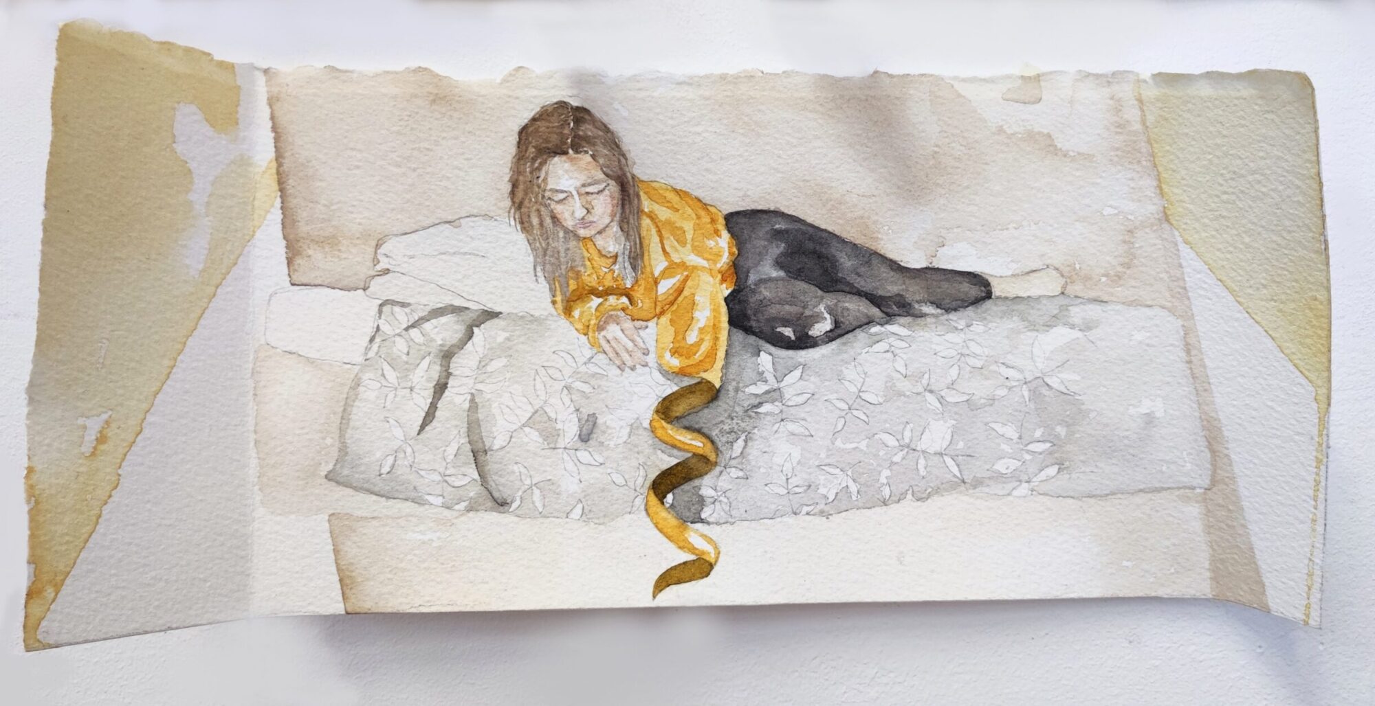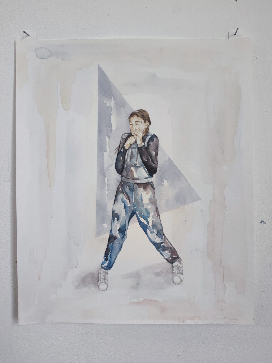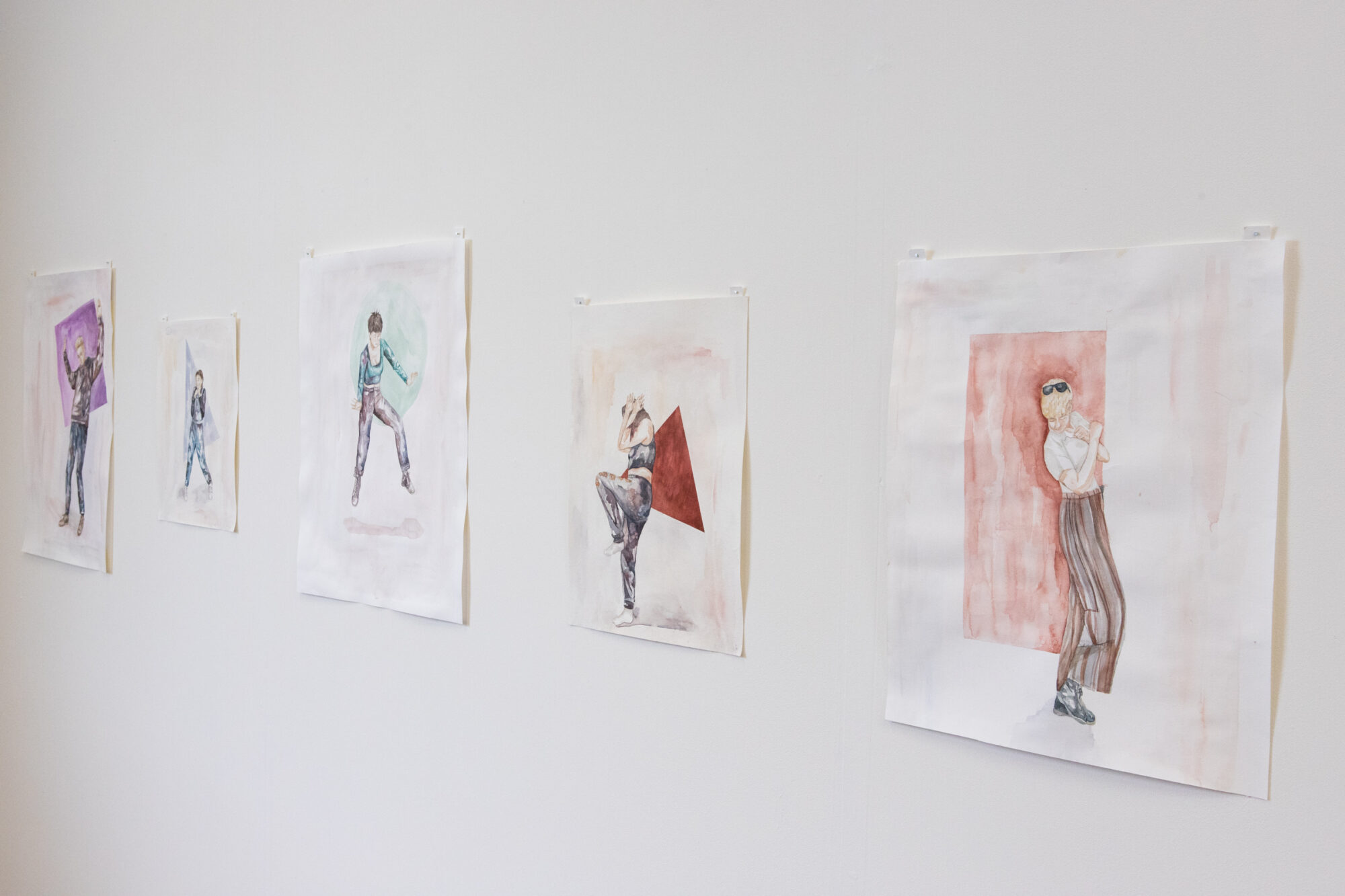 My project Sonder explores the realization that each random passer-by is living a life as vivid and complex as your own. I want the audience to experience sonder while viewing my work. My subjects are painted on watercolour paper with folded edges to create walls around the figure, giving the impression that they are unaware of the viewer's presence. These figures have body parts that are unravelling, suggesting a vulnerability that becomes evident when they believe themselves to be alone. Deflect is a more recent project, exploring a different type of vulnerable state. These figures are in danger rather than at peace within their own space. I recorded my subjects reacting when objects were thrown at them, often bending their bodies in visually interesting ways. I was interested in how every individual reacted differently to potential dangers as this showed a raw, unmasked side of each figure.