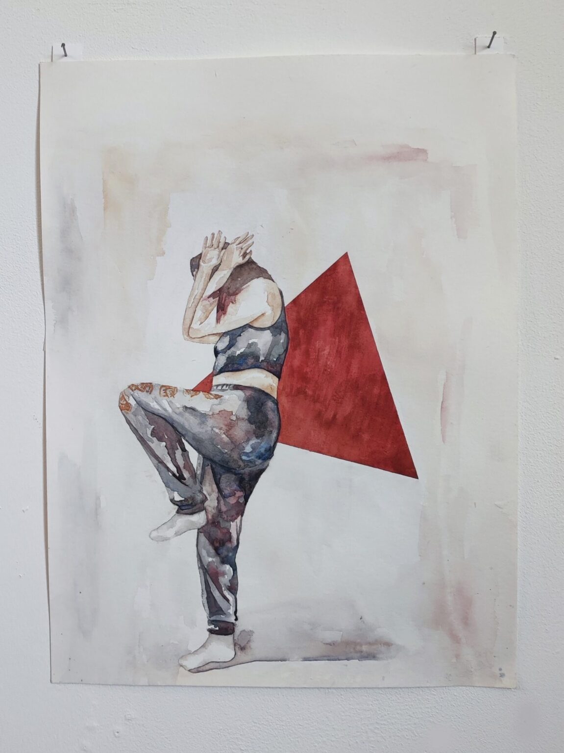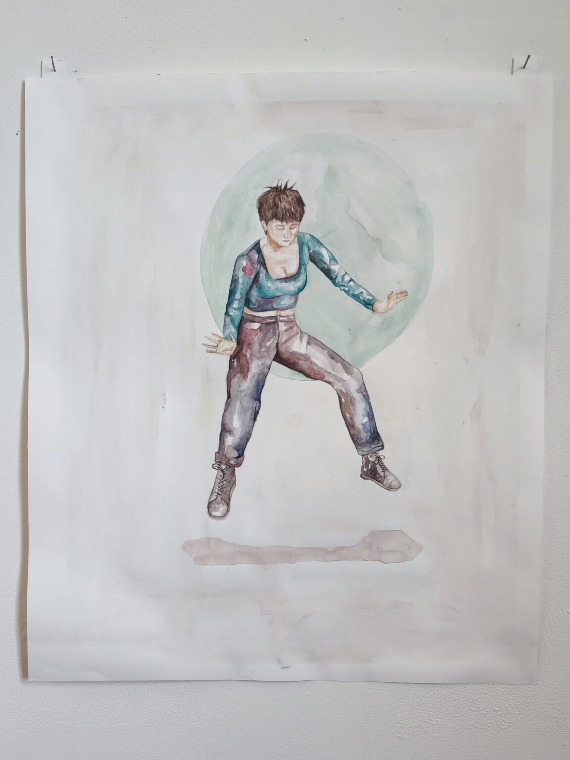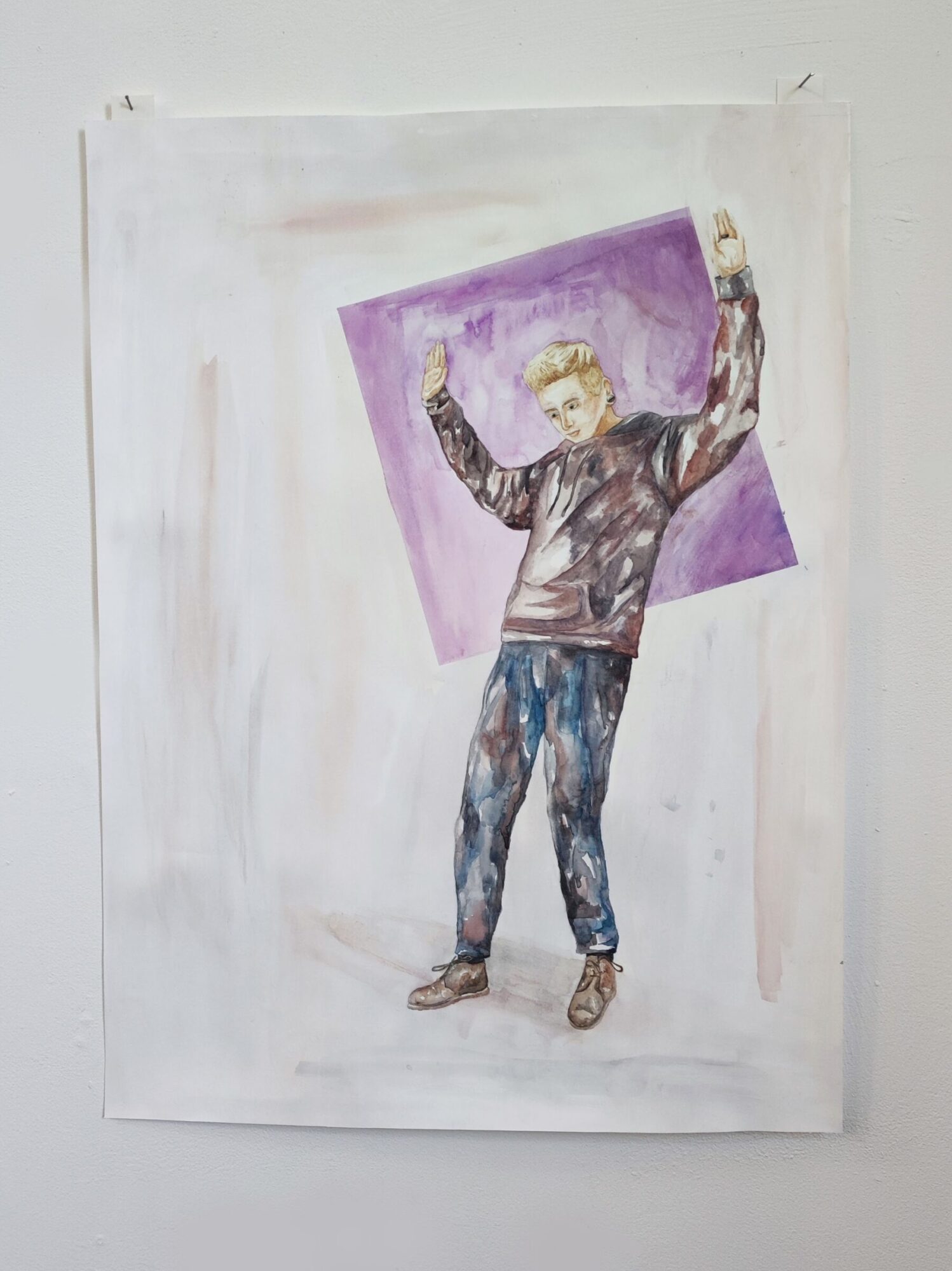 My project Sonder explores the realization that each random passer-by is living a life as vivid and complex as your own. I want the audience to experience sonder while viewing my work. My subjects are painted on watercolour paper with folded edges to create walls around the figure, giving the impression that they are unaware of the viewer's presence. These figures have body parts that are unravelling, suggesting a vulnerability that becomes evident when they believe themselves to be alone. Deflect is a more recent project, exploring a different type of vulnerable state. These figures are in danger rather than at peace within their own space. I recorded my subjects reacting when objects were thrown at them, often bending their bodies in visually interesting ways. I was interested in how every individual reacted differently to potential dangers as this showed a raw, unmasked side of each figure.