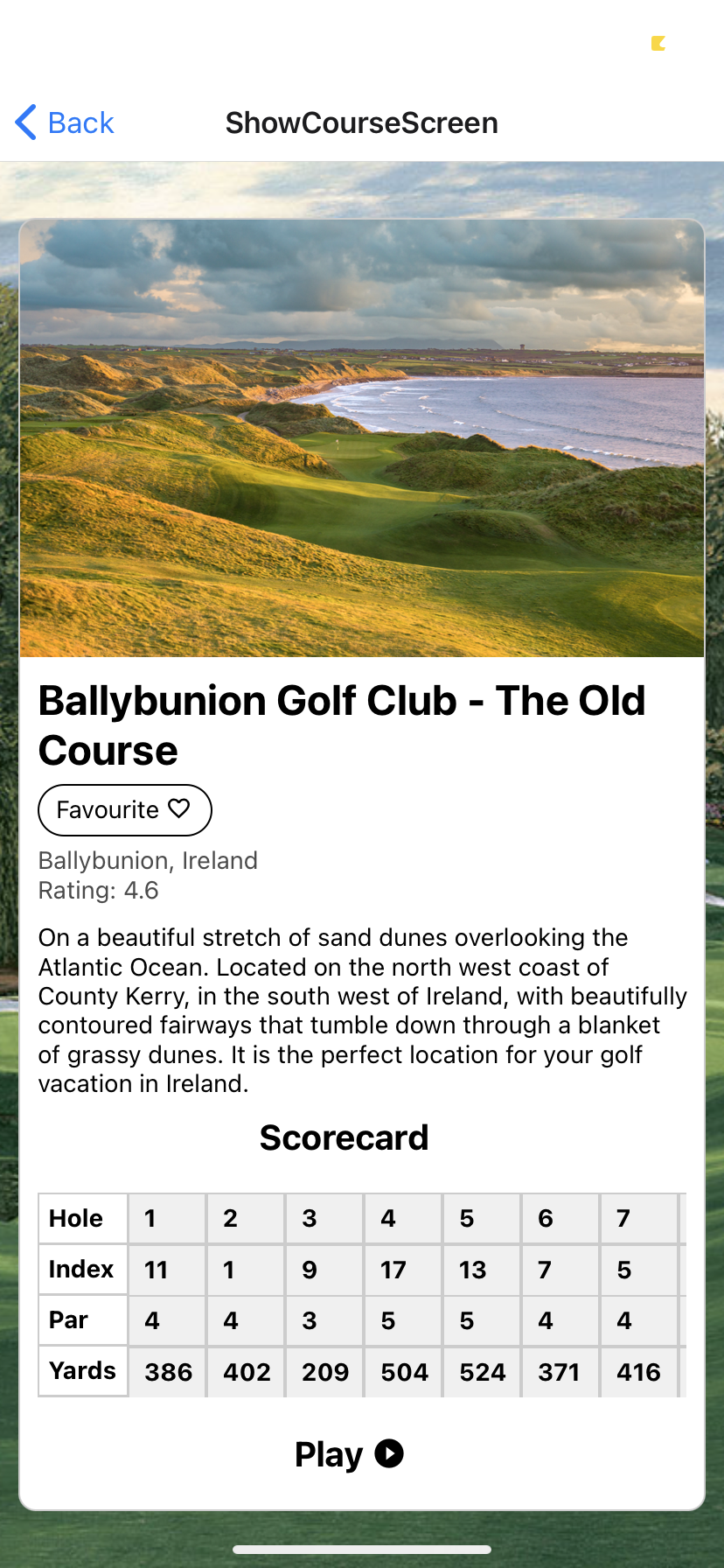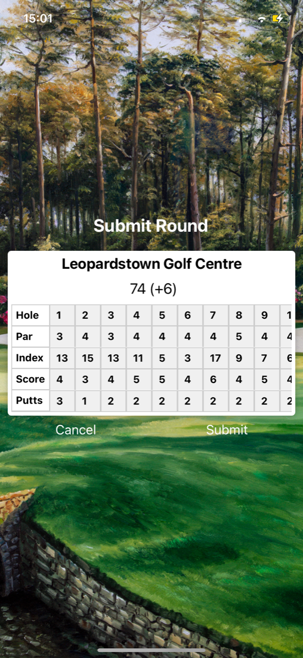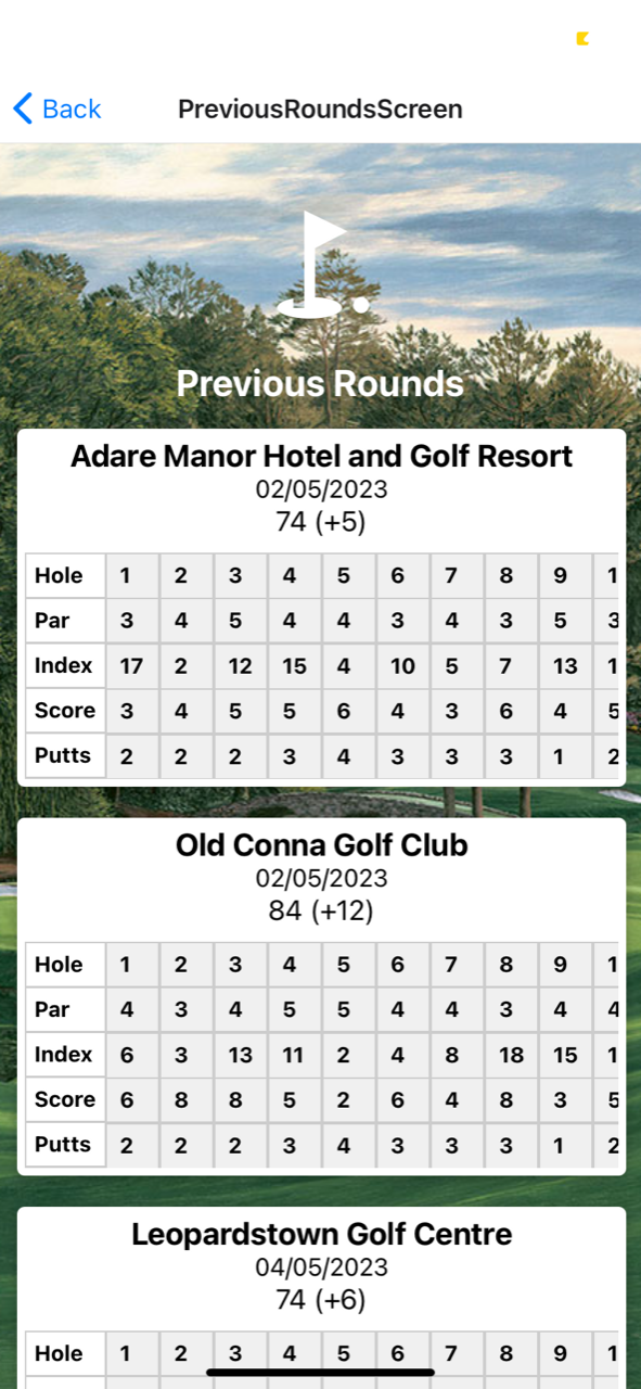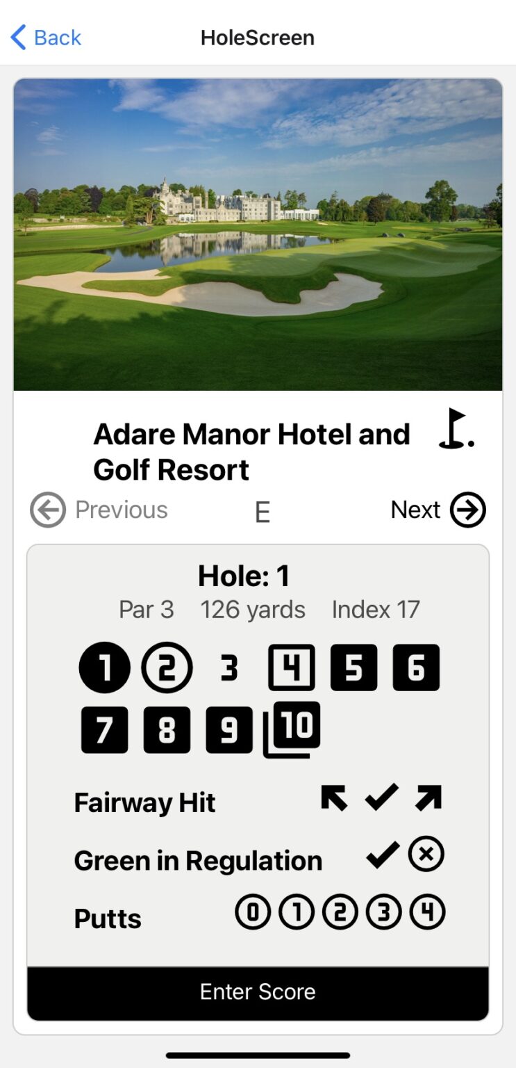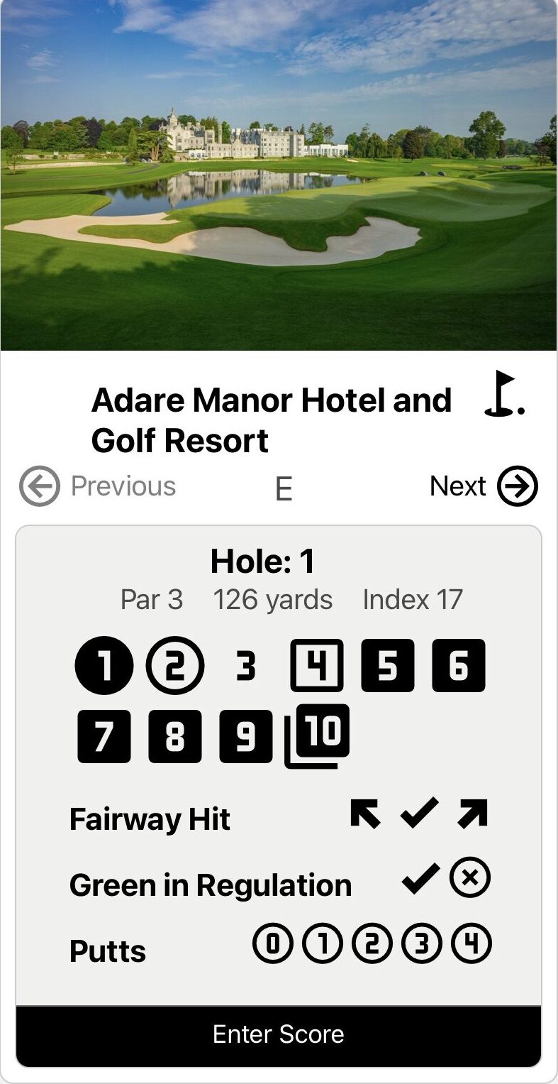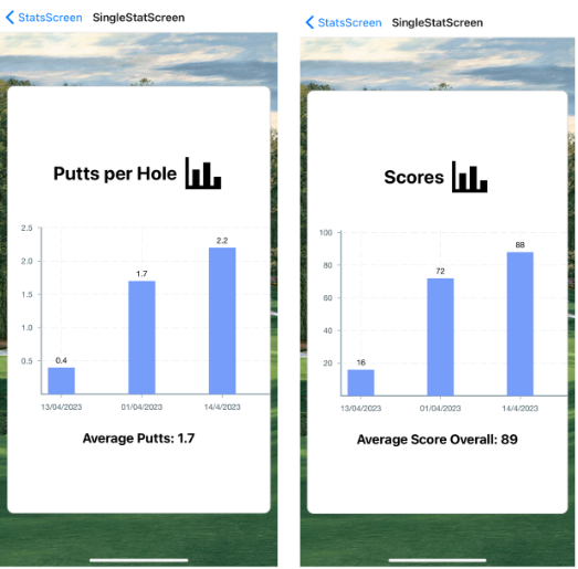 My project is a golf score tracking app where users can sign up, login and search through courses in Ireland. They can start a round at a course and track metrics for each hole they play. The round data can be saved and retrieved while a range of interactive graphics allow their performance over time to be visualised.