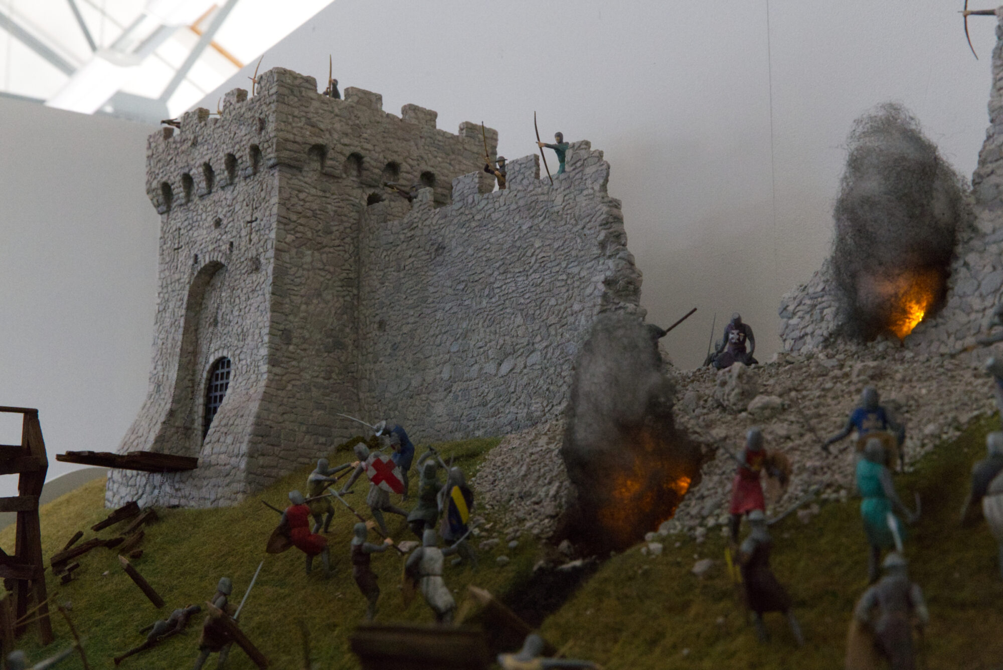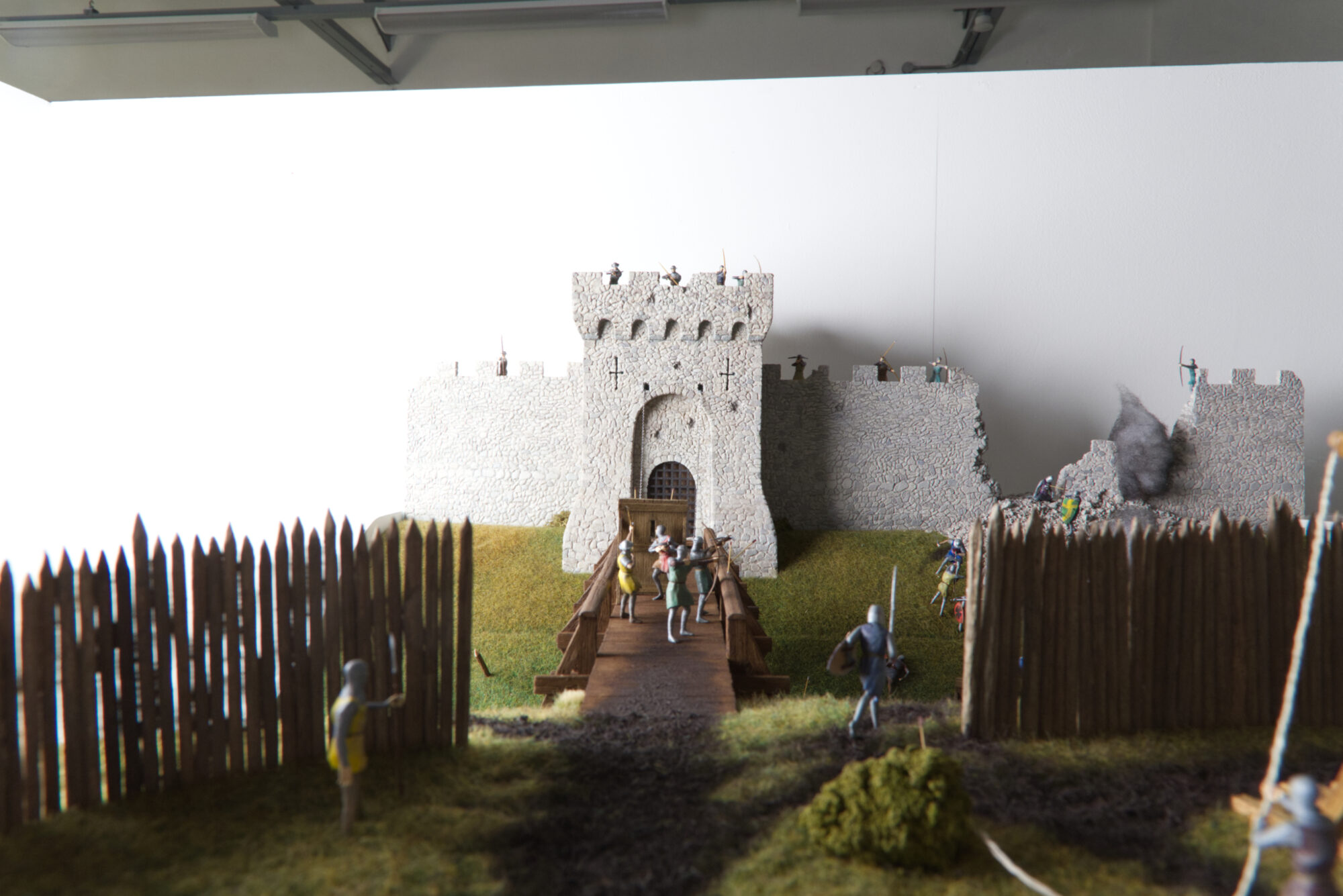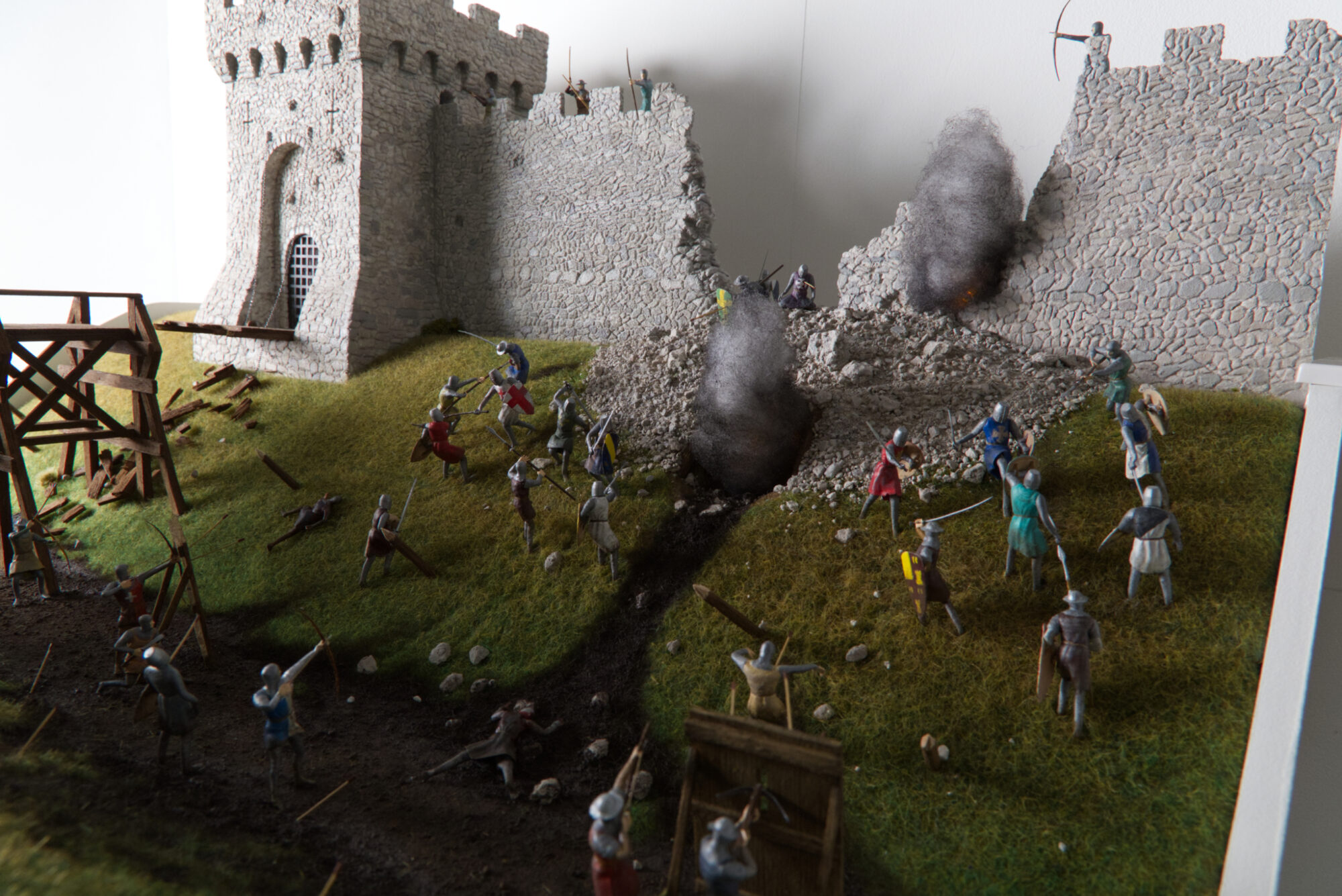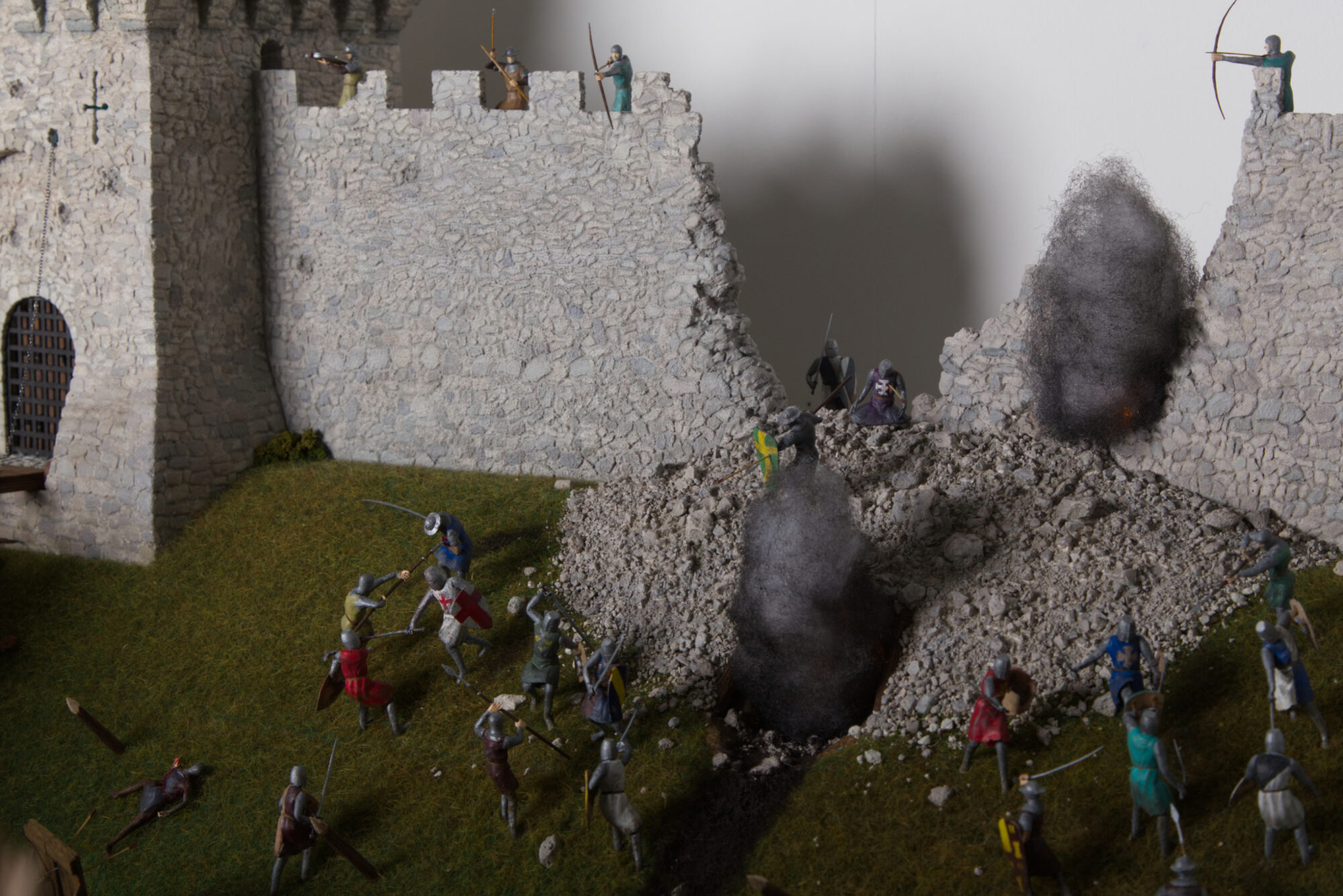 My project is a Diorama depicting the siege of Rochester 1215 CE. It is historically accurate and is intended to interest people into the methods and aesthetics of an early 13th century medieval siege. It is also meant to captivate viewers with the dynamic action within the diorama. It is a meter by meter in length and width and comes apart in three sections for transporting. The castle parts are made up of blue foam and all slotted together during fabrication, but are all glued now. The three sections of the base are also made of blue foam. Everything was plastered and then painted over and detailed. I digitally made the soldiers and 3D printed them. I also made use of LED lights for smoke and fire. I wanted to do a piece that incorporates much of what I learned from the course and also one that would expose me to more new things. I hope this may lead to the historic museum modelmaking business or just history in general in some way.