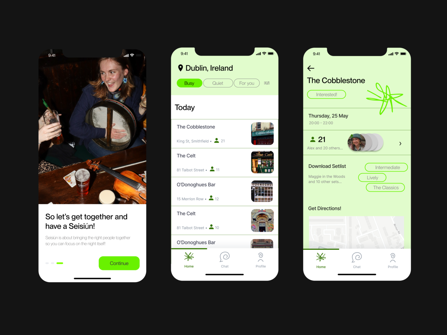 Seisiún is an app that encourages young musicians to return to and get involved in trad sessions. The “word of mouth” nature of trad nights is the biggest issue that new musicians face. Seisiún provides support through a schedule of events, setlists, and a network platform, making trad sessions more accessible.