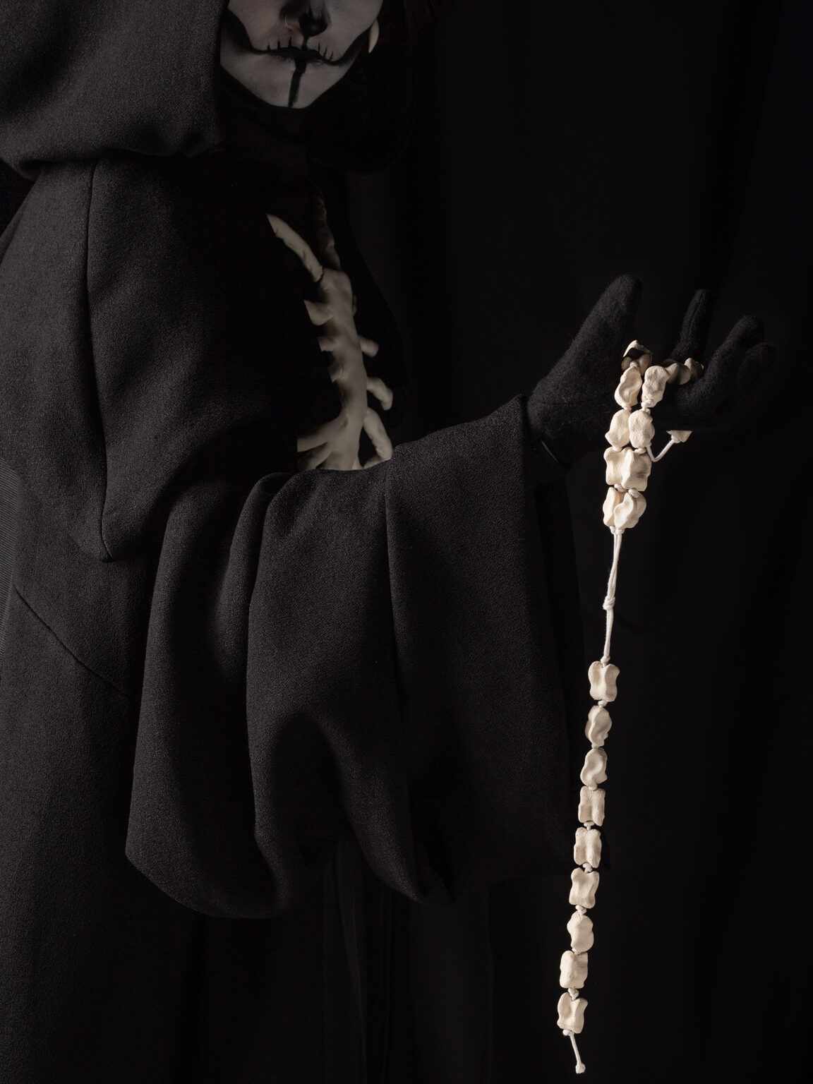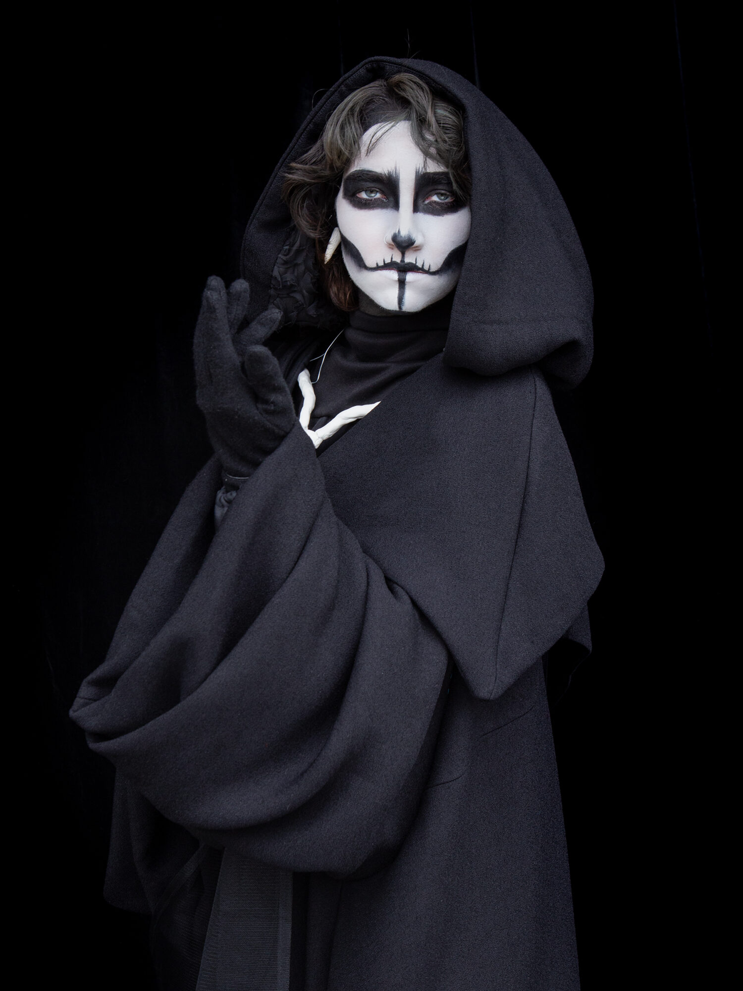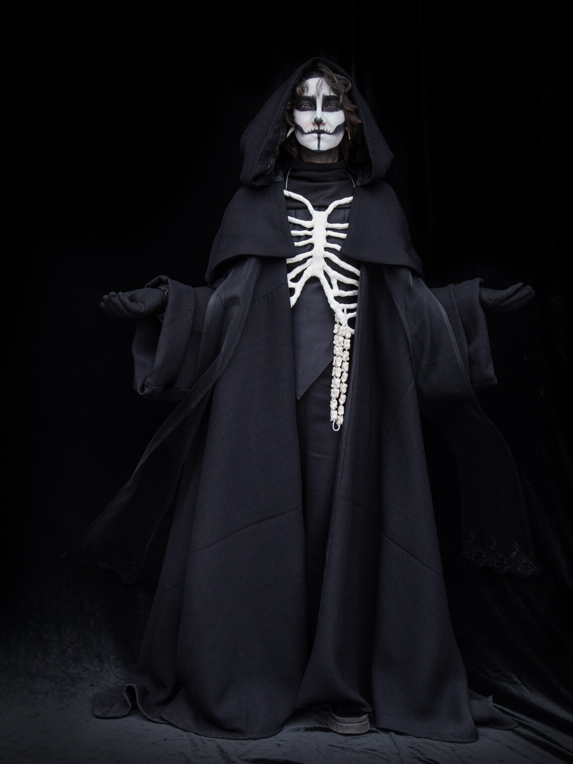 I chose this text for its rich visual language. The society’s division into nine major ‘Houses’ as well as into Necromancers and Cavaliers meant I could play with the variety of different clothing styles that would develop in separate cultures. The costume I chose to make, Harrowhark Nonagesimus, is a necromancer specialising in bone magic, and high priestess of a necromantic religion. As such, her costume reflects the weight of tradition placed upon her, as well her quiet but imposing power.