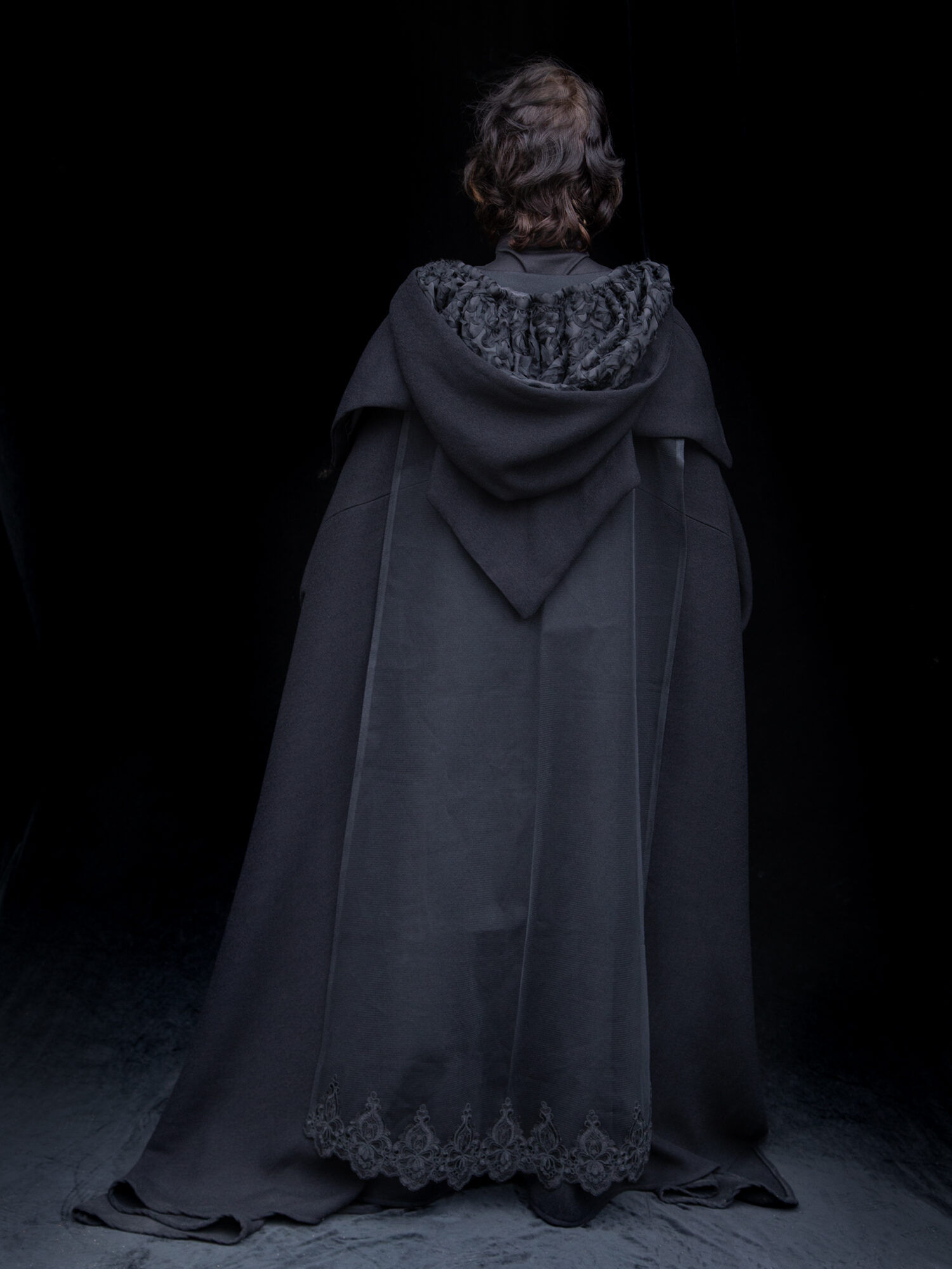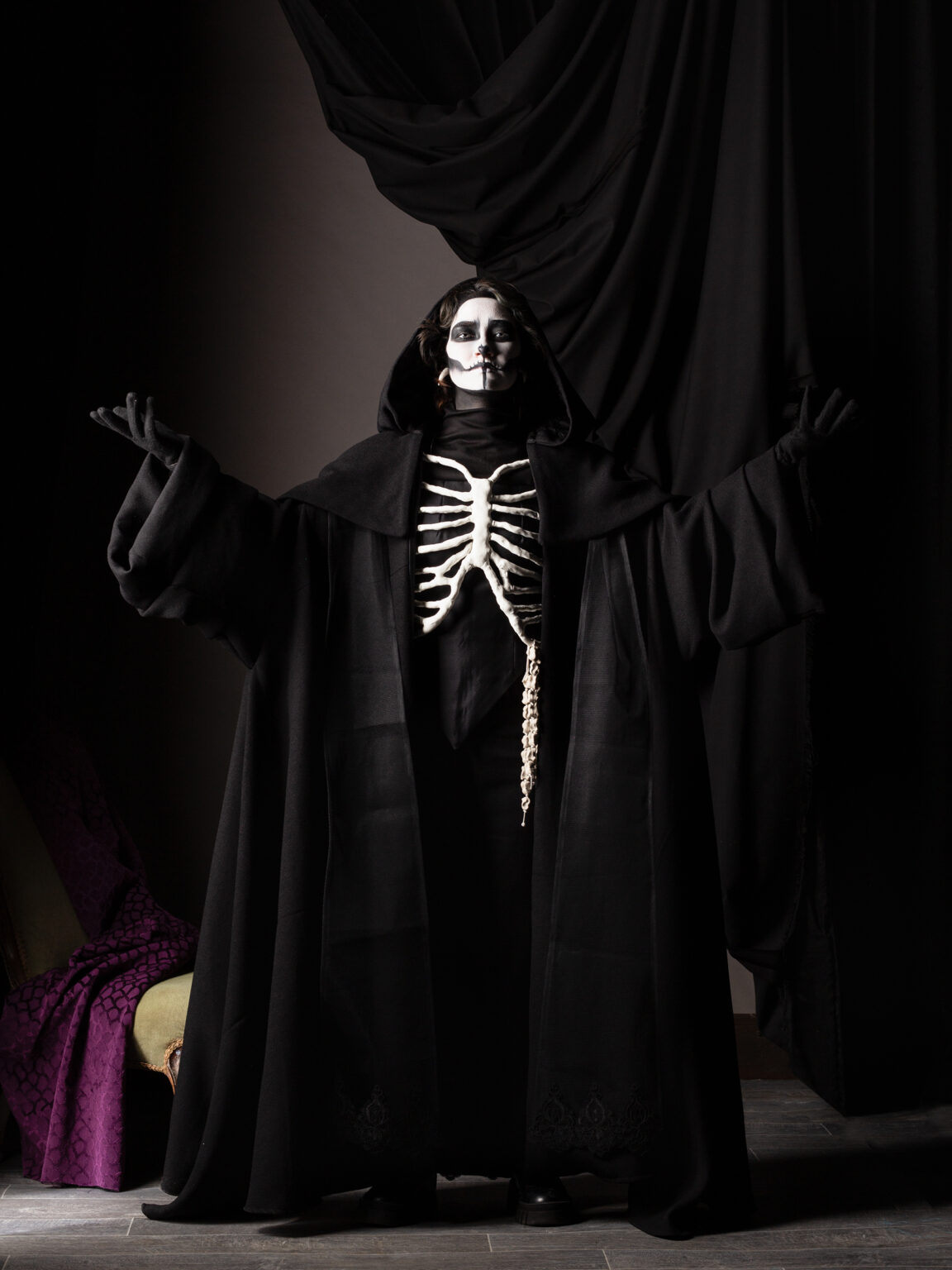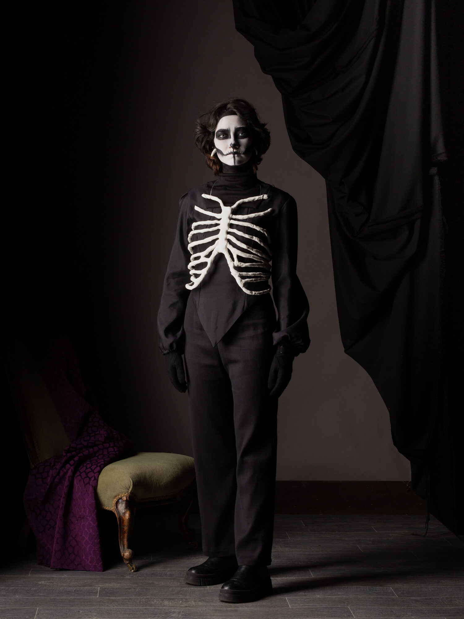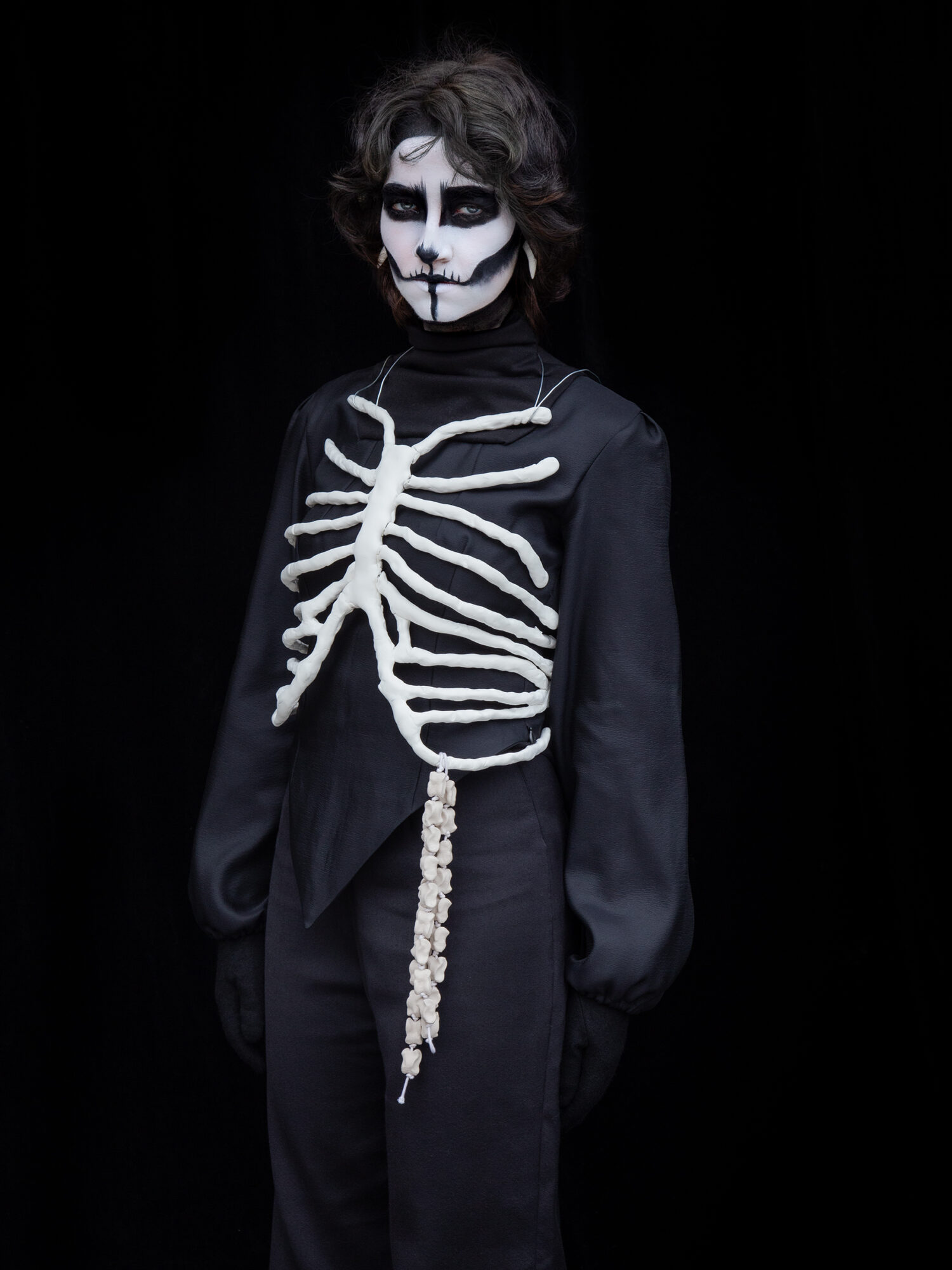 I chose this text for its rich visual language. The society’s division into nine major ‘Houses’ as well as into Necromancers and Cavaliers meant I could play with the variety of different clothing styles that would develop in separate cultures. The costume I chose to make, Harrowhark Nonagesimus, is a necromancer specialising in bone magic, and high priestess of a necromantic religion. As such, her costume reflects the weight of tradition placed upon her, as well her quiet but imposing power.