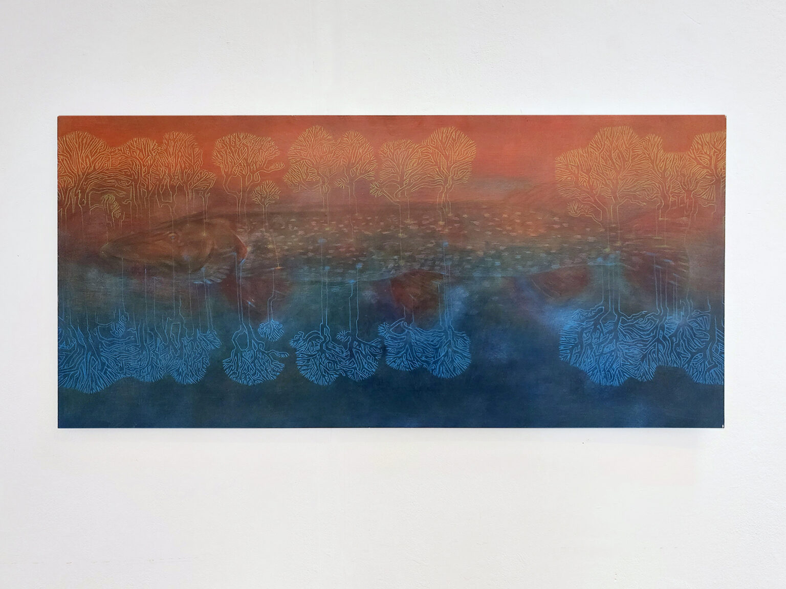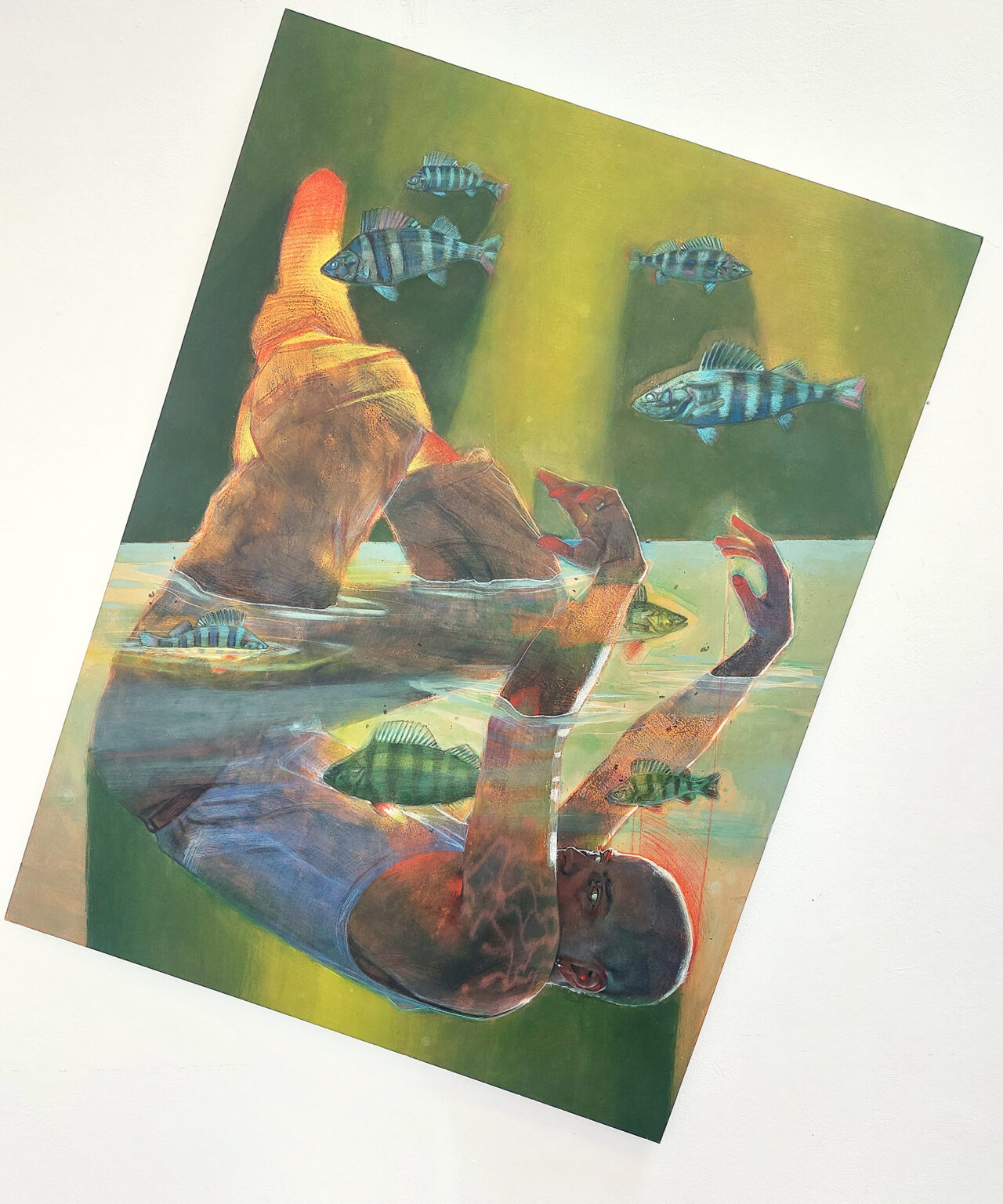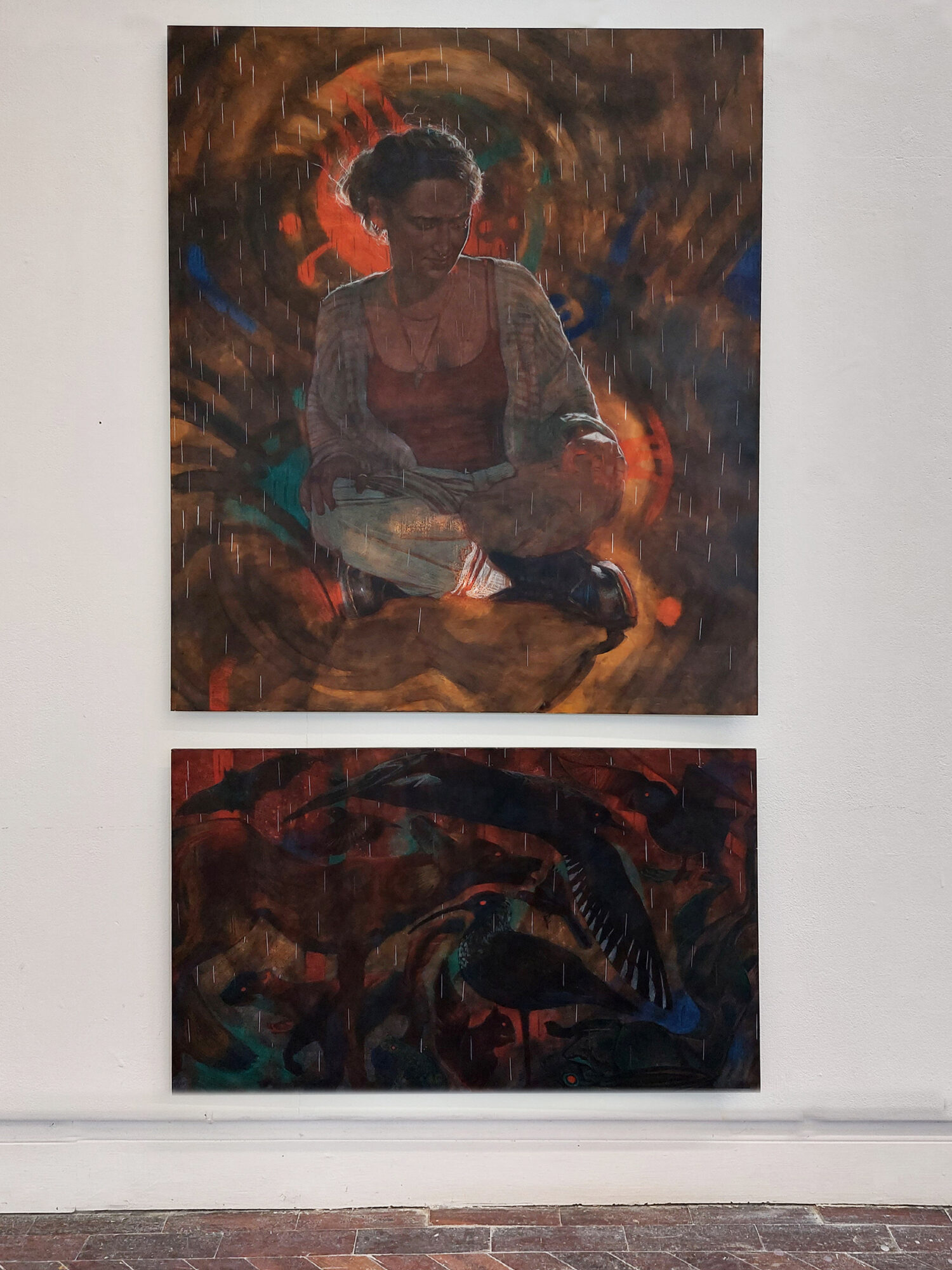 I aim to create believable scenes of connection between humans and wildlife, through careful lighting, constructed action, and layering of figures. I have chosen to focus on specific animals whose behaviour has been affected by the presence of humans. Some of these creatures have evolved around humans, who regard them as vermin, while others can survive only by avoiding humans. Each painting offers a hopeful experiential connection between human and wild animal. My style is partly influenced by representations of animals and people in older cultural forms such tarot cards or stained-glass windows, which suggest a history of connection between humans and wildlife in Ireland. My approach to colour is shaped by my interest in how animals perceive the world, specifically how they see differently from humans. I want to challenge the narrative of wildlife invading ‘human space’ and pose questions about how they can co-exist.