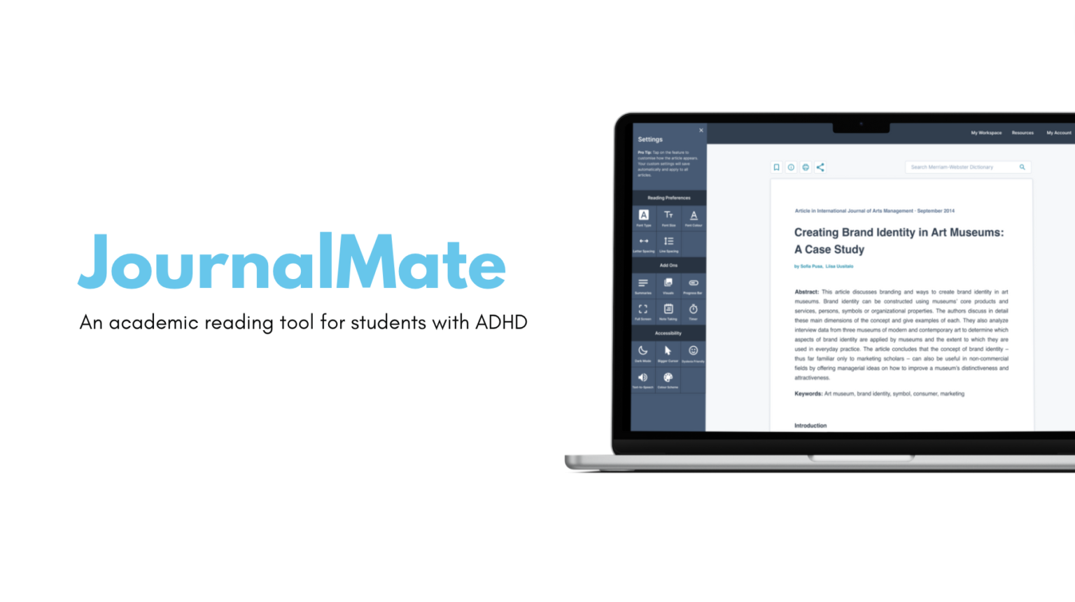 JournalMate is an accessible academic reading tool to support third-level students with attention-deficit hyperactivity disorder (ADHD). This research project was conducted in three phases using a user-centred design process. The initial research phase explored cognitive processing difficulties associated with ADHD, reading habits and user needs. A series of interviews with three subject matter experts and eight students with ADHD aimed to identify pain points and problems hindering users from carrying out academic reading efficiently and confidently. Phase two involved ideating solutions based on data collected in the first phase, focusing on developing a tool to assist with academic reading. Phase three concluded with the resulting prototyped solution being evaluated by 10 users. The data gathered during this evaluation provides insight into the performance of the application and will aid in any subsequent design iteration. The output of the study is an accessible academic reading tool, referred to as JournalMate, for third-level students with ADHD. Results provided additional data to build on previous study findings and existing theories. Future practical implications are discussed, along with limitations.