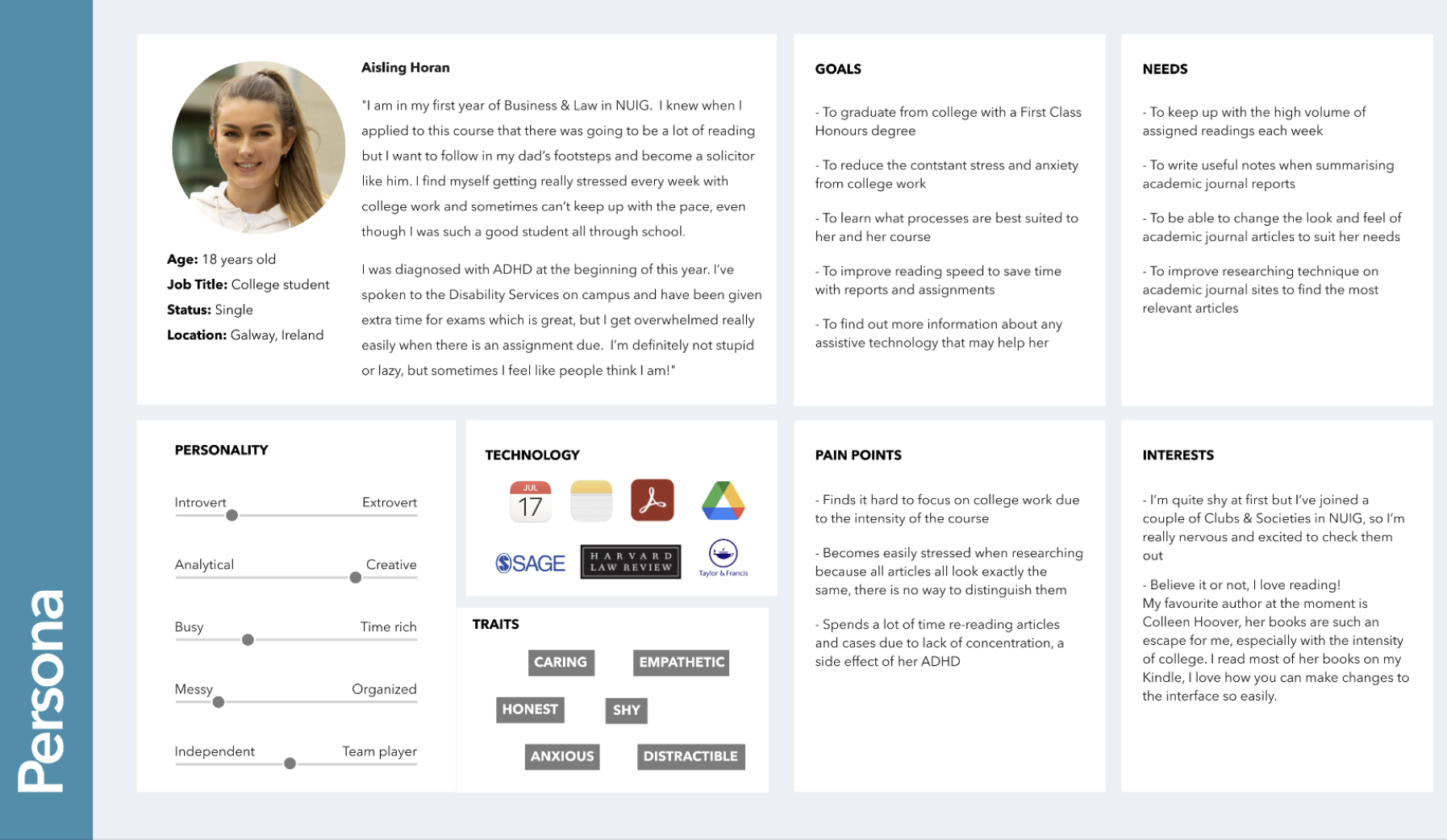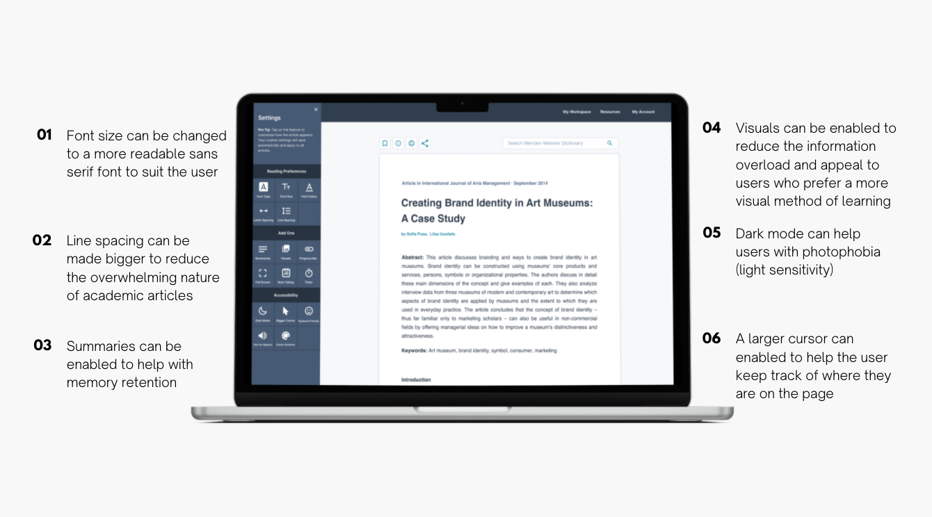 Hi, I'm Jen. I'm a Content Designer with a background in educational publishing. My research project explores how academic journal websites can be made more accessible, specifically for students with ADHD. You can see some highlights of my research project below and can check out my website for a more detailed look at the work I completed throughout the course.