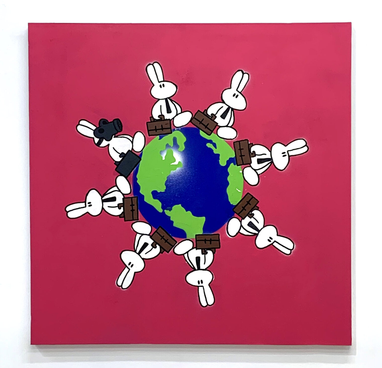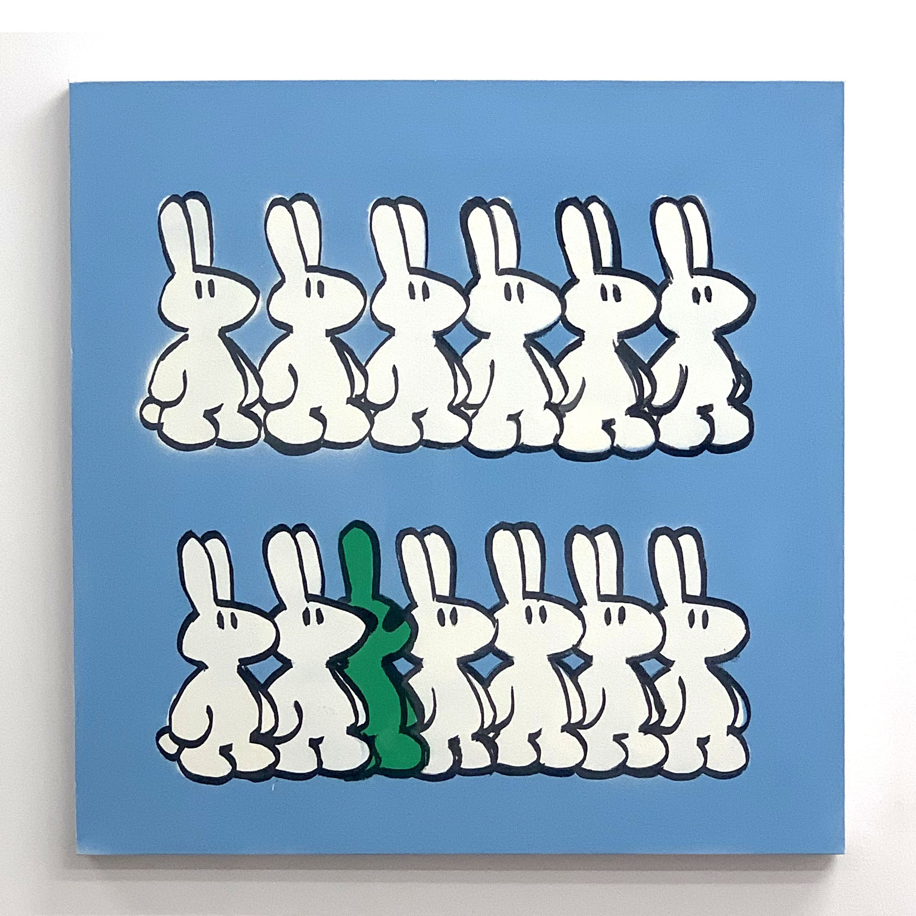 My project Rabbit Hole deals with issues around identity and the chaos of online or virtual spaces. I am interested in using a process of world-building to establish environments and characters which draw parallels to online spaces and the users within them. I have been fascinated for years now with the term “falling down an internet rabbit hole”. In my work, the recurring symbol of the white rabbit can represent not just an individual user, but rather a multiplicity or mass that exists within online spaces. Expanding on that idea of multiplicity, I also reproduce printed copies of my work. I am using my practice to create a level of interactivity which represents our connectedness within online spaces. I use a visual style which is intentionally evocative of digital art in the early age of the internet, implementing an element of personal nostalgia which is integral to the work.