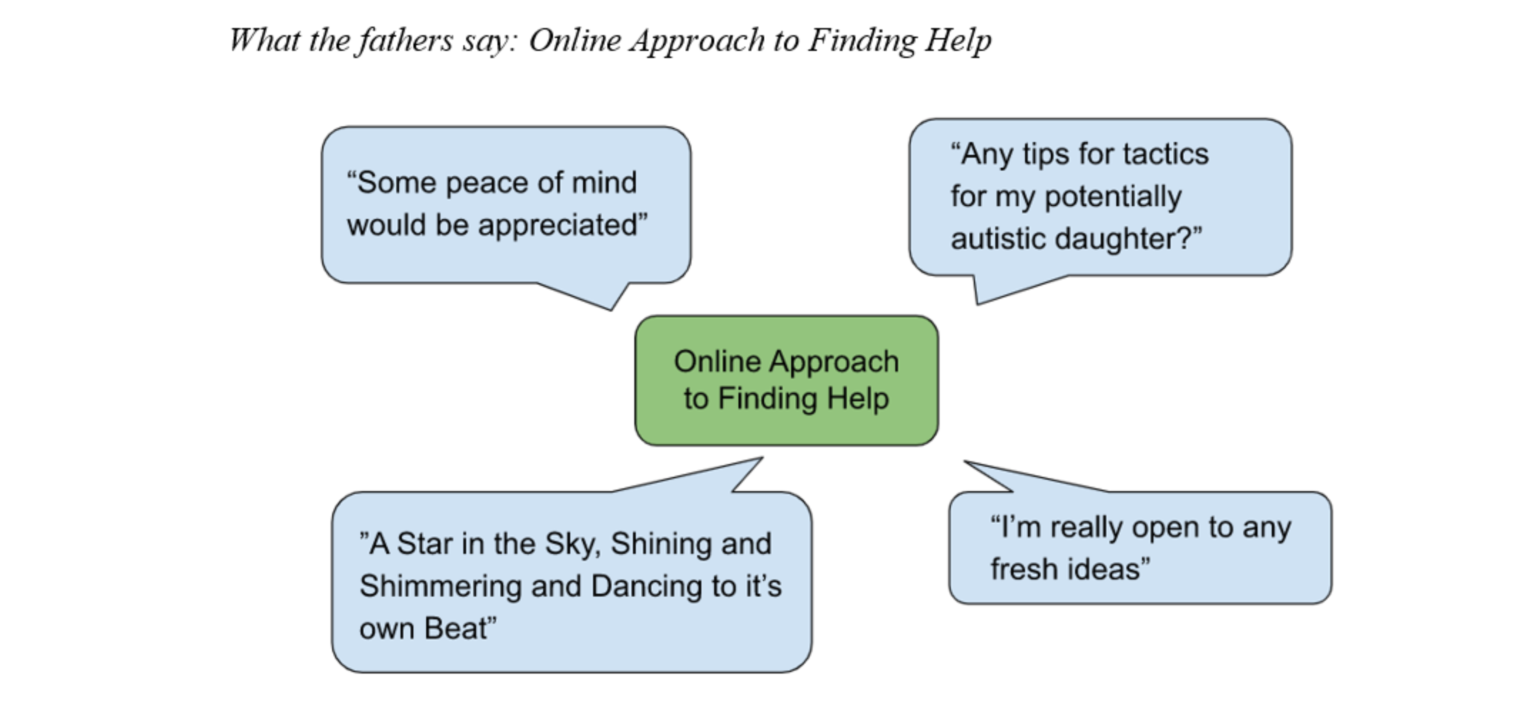 Despite their importance to rearing a child with Autistic Spectrum Disorder (ASD), fathers are often overlooked in research. Fathers reported similar reactions to their child’s diagnosis and problems as mothers, however the sources of stress can be different. In order to explore experiences of those who may not be connected to services, the current study used Reddit.com which is an anonymous forum. A reflexive thematic analysis on 30 posts was carried out. Results were largely as expected from prior research. Themes of negative emotions, positive emotions and obstacles to progress were seen. Online approaches to finding help included seeking support and seeking resources. Many children involved were not diagnosed. Unexpected themes included the joy in the father / child relationship. Children discussed in the data were younger than expected. Male to female ratio was higher than expected. Results supported the need for father-only interventions and father-to-father communication and mentoring.