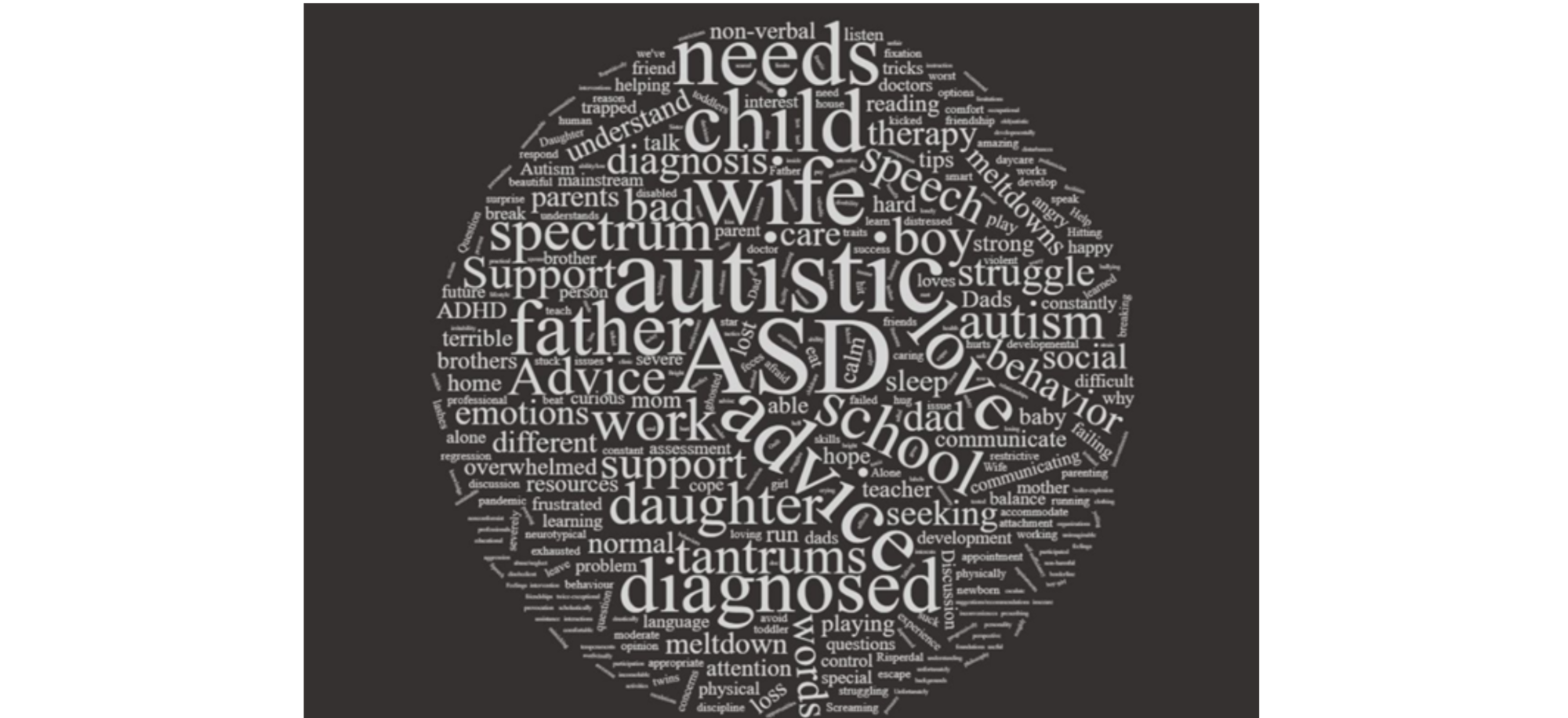 The theme seen of the positive aspects of the father child relationship is rarely seen in previous research. This data set showed a female to male ratio of 1:6 instead of the expected 1:2. Surprising aspects of the data included the omission of shutdowns (as opposed to meltdowns), the young ages of the children, and the fact that there was no mention of stigma associated with having an ASD child.