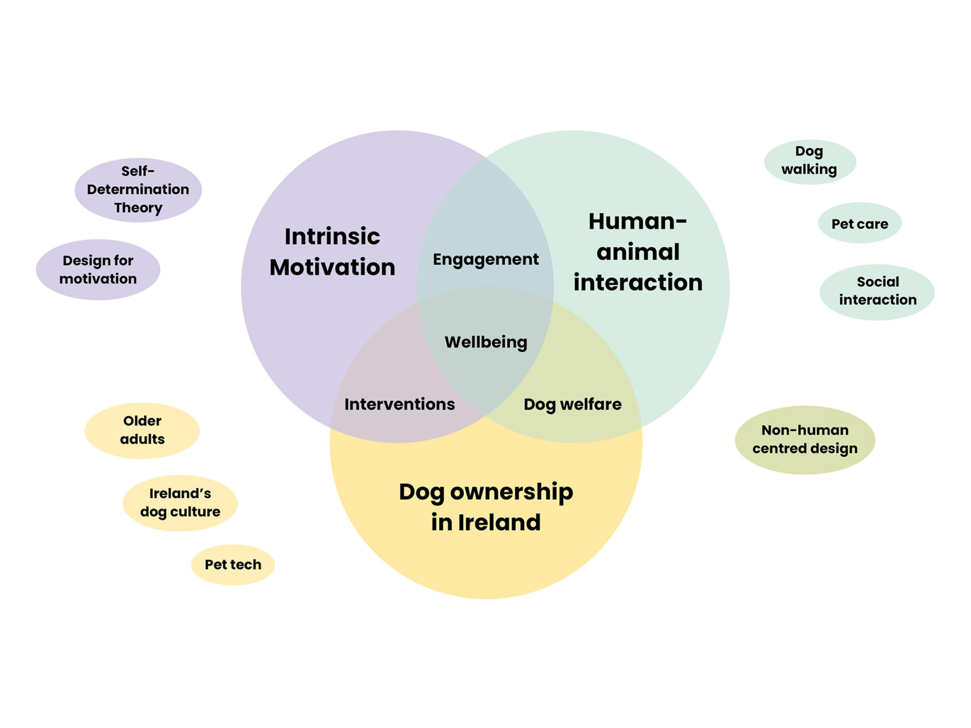 This study has indicated that the impact of design and technology on motivation and engagement, based on psychological needs satisfaction, could encourage flourishing by supporting human and animal wellbeing. Providing dog owners with a tool, such as an app, to aid pet-care management, can lead to their intent to increase dog walking and general engagement with their pet, and thereby ultimately benefit the dog, and the owner. Strong participation numbers throughout the study and positive feedback indicates that Irish dog owners are interested in an app of this nature, and there could be market demand. Of note is that most participants were of an older age demographic. This study’s actionable practice of wellbeing-supportive design, also promotes Positive Design, which, as supported by the literature review and the positive outcome to the research questions, is a desire to design for deeper meaning, happiness, and wellbeing.