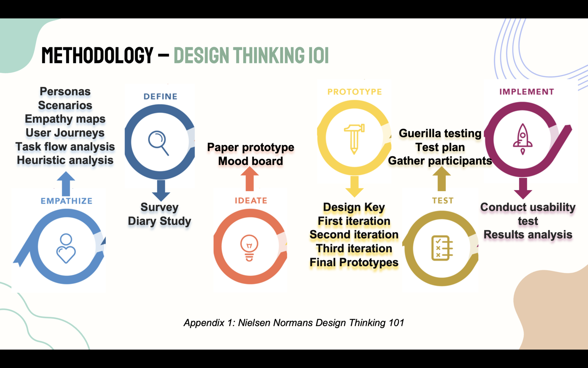 This study followed Nielsen Normans Design Thinking 101 design methodology. Here is an overview of the user research conducted in each phase of the design process.