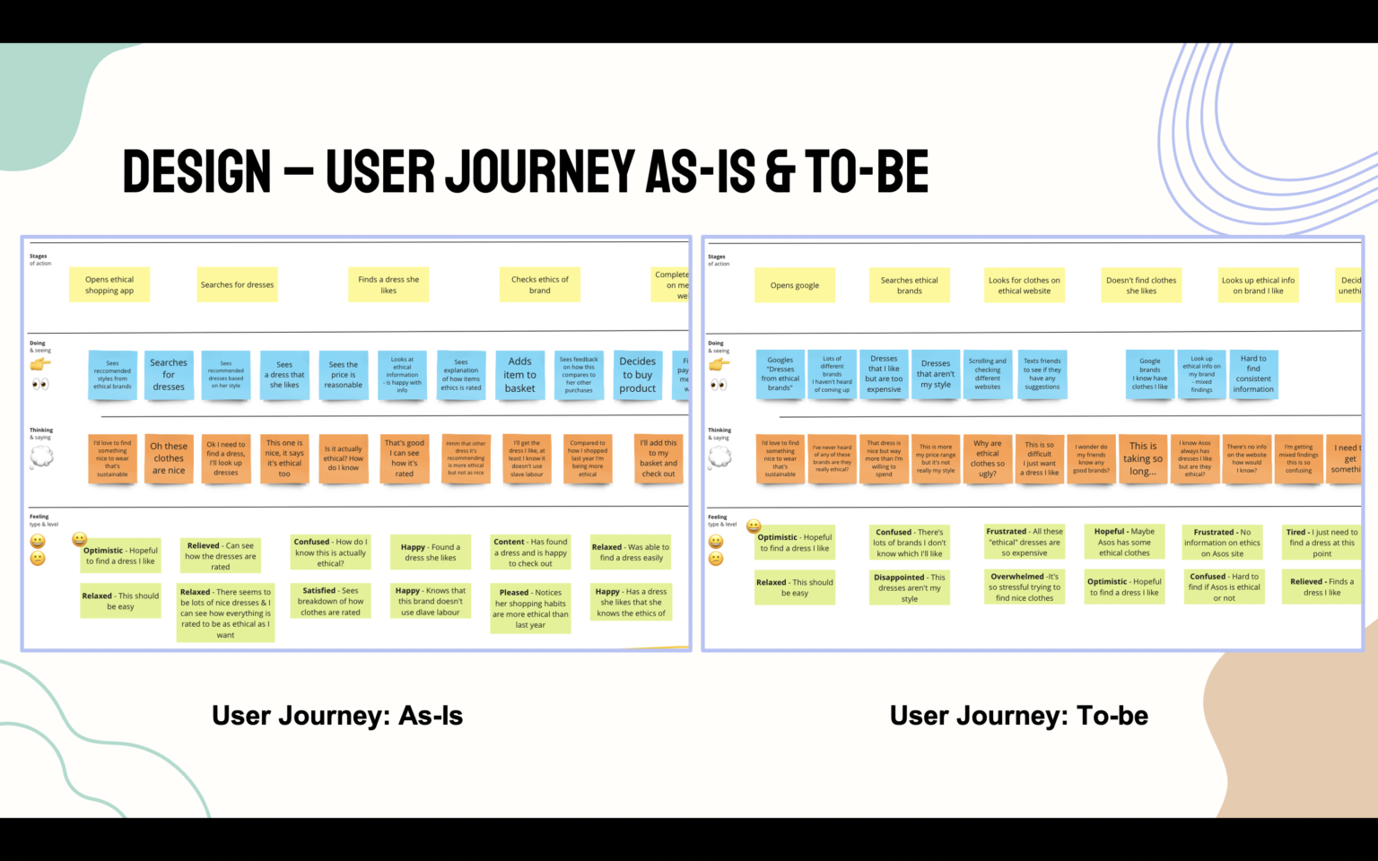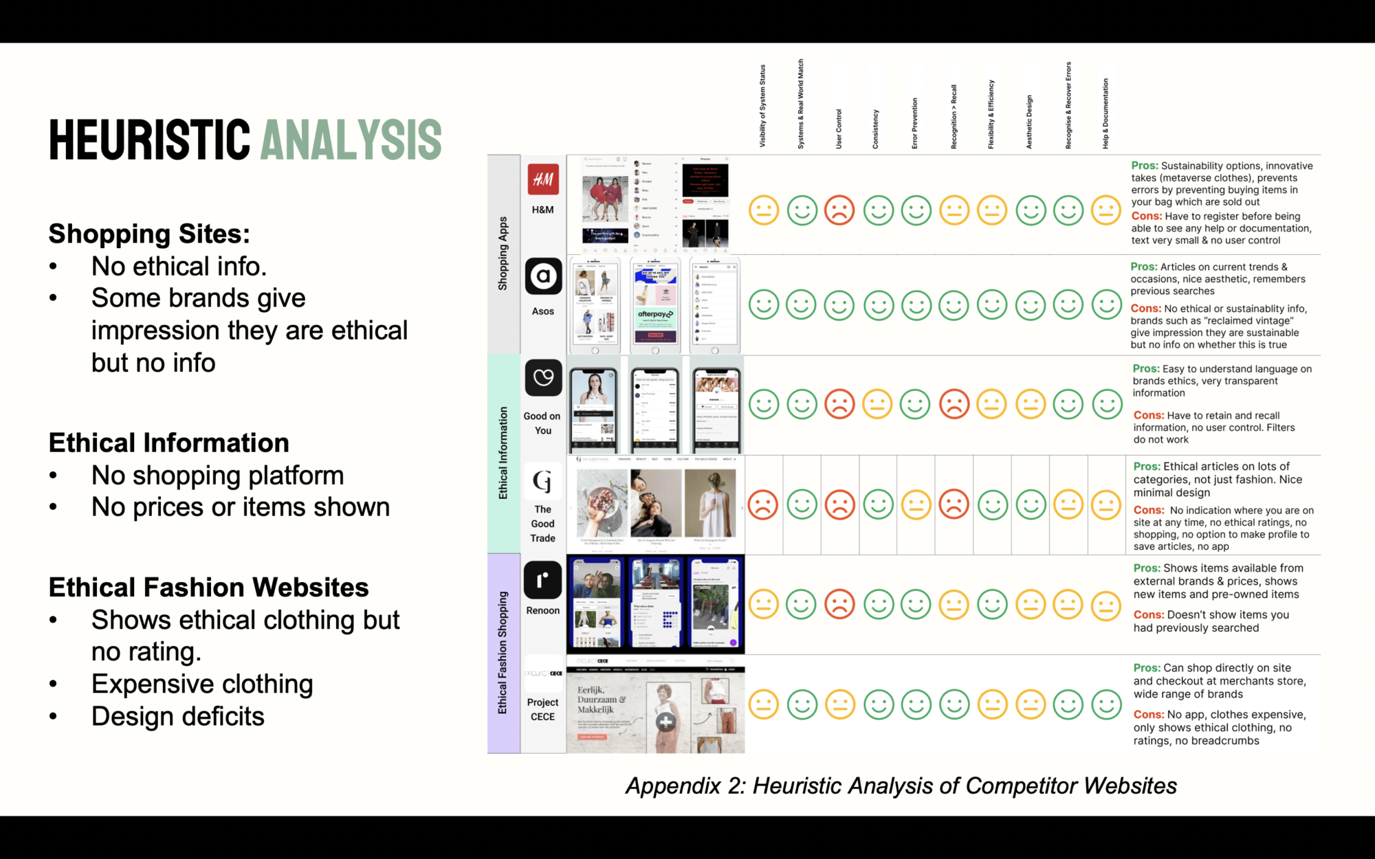A heuristic analysis was conducted across a number of websites such as e-commerce, ethical information, and ethical shopping websites. The main takeaways across the board were that popular shopping websites do not show ethical information, and when looking externally this information can be hard to find. Websites which provide ethical insights do not include prices or the ability to see items from that brand, meaning users have to retain that information as they continue to the merchants website. As studies have shown, if this information is not at the forefront it can lead to fast, automated deficit decisions