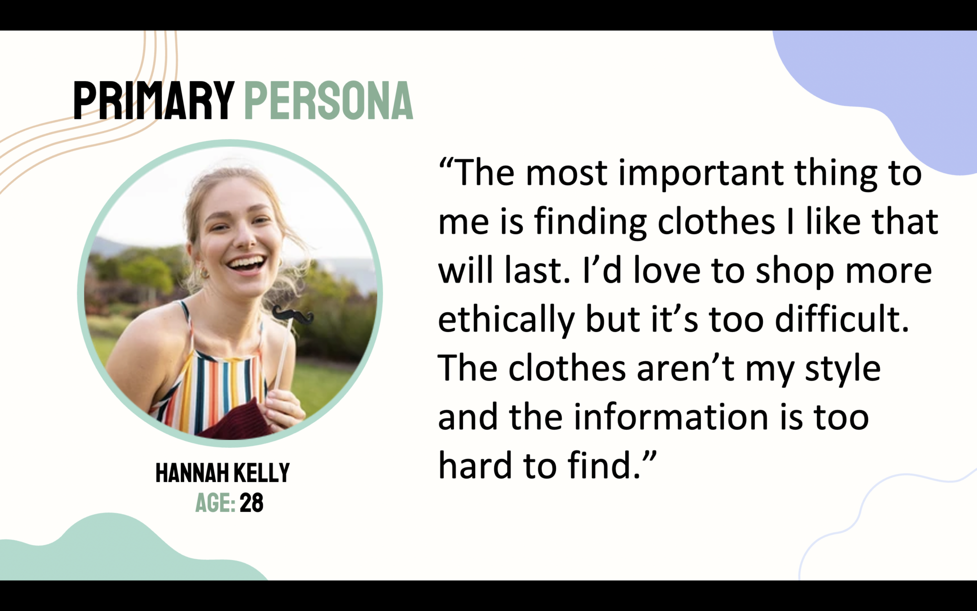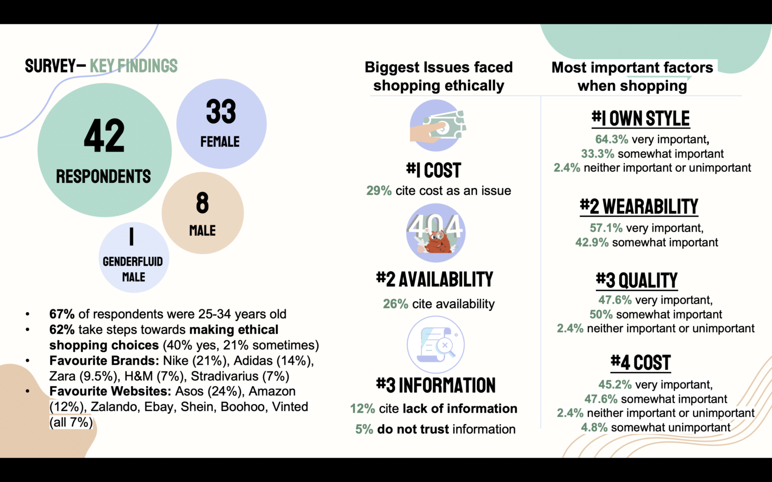 A survey was conducted to understand users attitudes towards ethical shopping. The survey gathered a total of 42 respondents, 33 female, 8 male, and 1 non-binary male. The majority of respondents were between the ages of 25-34, and 62% said they currently take steps towards making ethical choices. The biggest issues cited by respondents when shopping ethically are cost, availability, and information, either lack of information, or lack of trust in information. The most important factors when shopping for clothes are their own style, wearability, quality & cost.