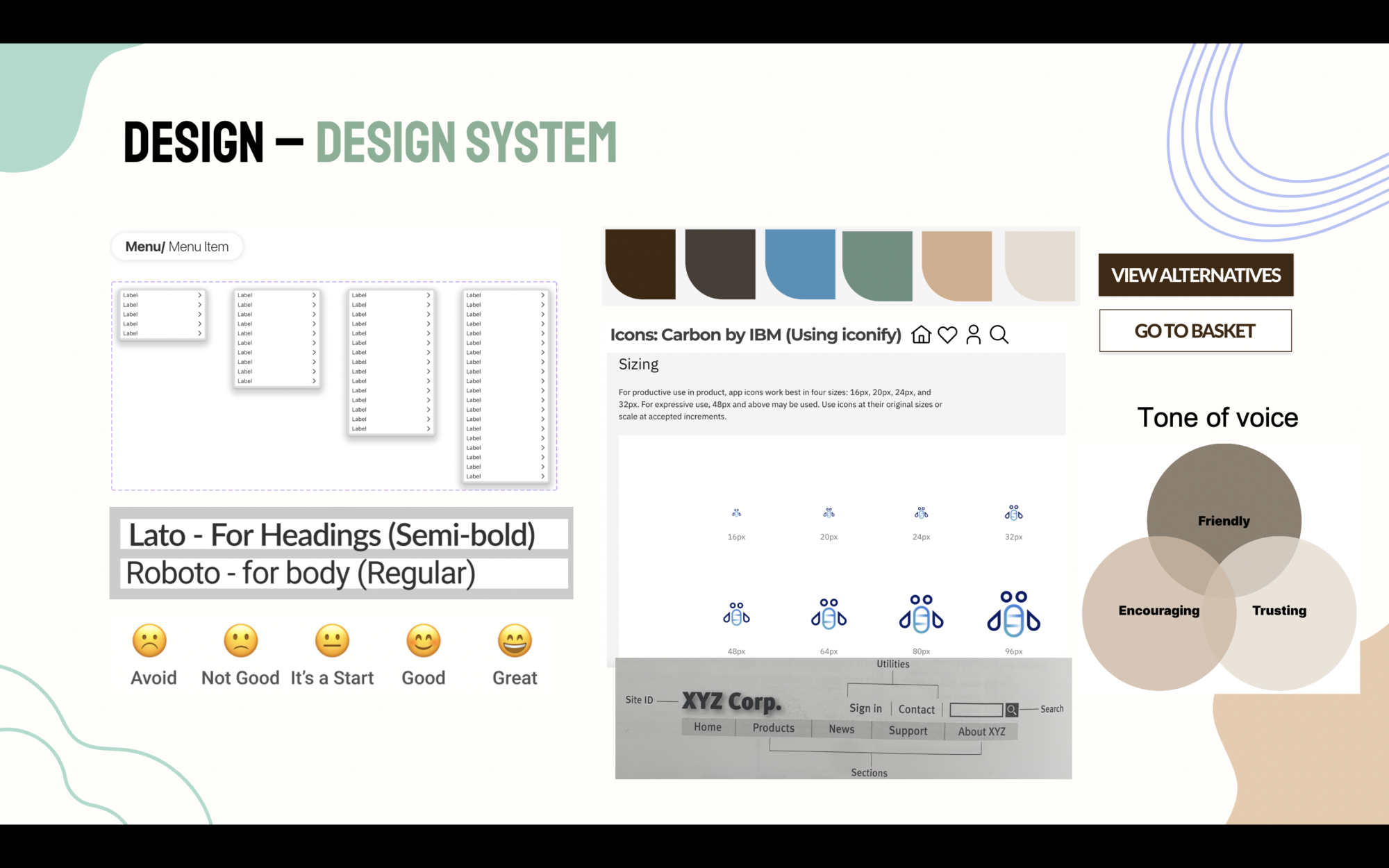 A design key was developed to ensure consistency across the prototypes. Consideration was given to TOV to ensure it was friendly, trusting & encouraging with our coming across too childlike. A neutral, earthy colour palette was chosen as it is said to work well when conveying emotions relating to the natural world. Carbon designs iconography was used through the design for call to action symbols, as they are accessible to all regardless of ability. IOS emojis were chosen for displaying non-actionable items as they are universally well know and understood, and visually more appealing than some other icons explored.