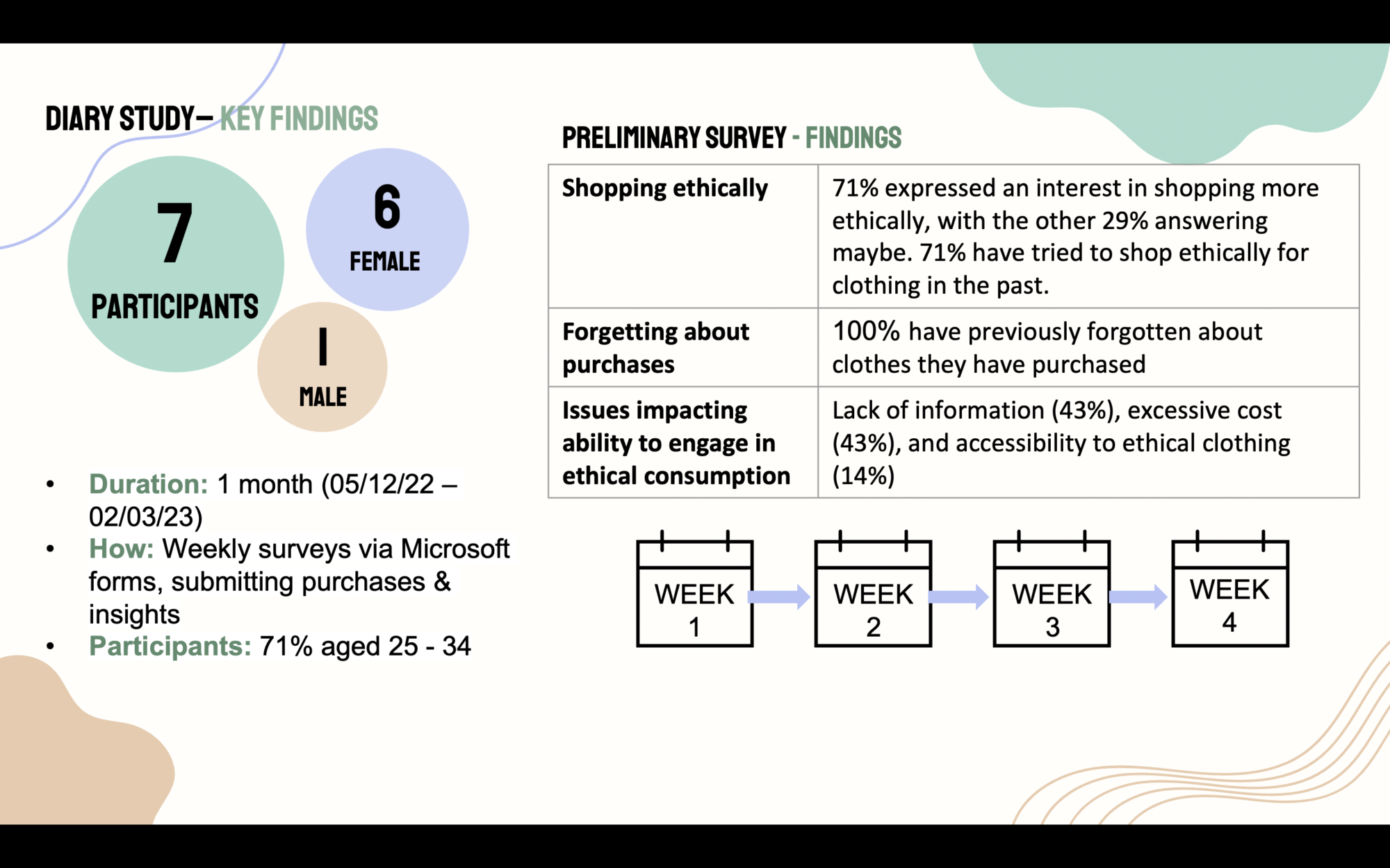 A diary study was conducted with 7 participants over the course of one month, with participants sending weekly quantative feedback on their purchases, how many items were bought, whether in-store or online, and other findings. Qualitative feedback on whether they made ethical shopping attempts, how they found this experience, and how they feel about the purchases they made. Consistent with research in literature review, 71% of participants expressed an interest in shopping more ethically, however this did not necessarily translate when observing their purchases. All participants have cited forgetting about purchases they had made in the past. Again, lack of information, cost, and accessibility were key issues impacting ethical shopping ability.