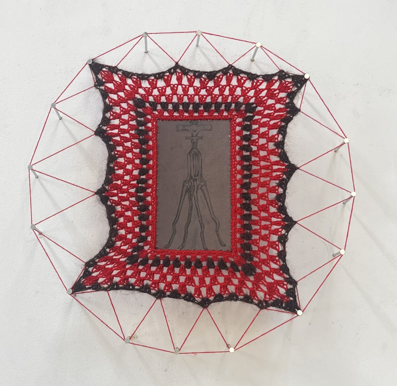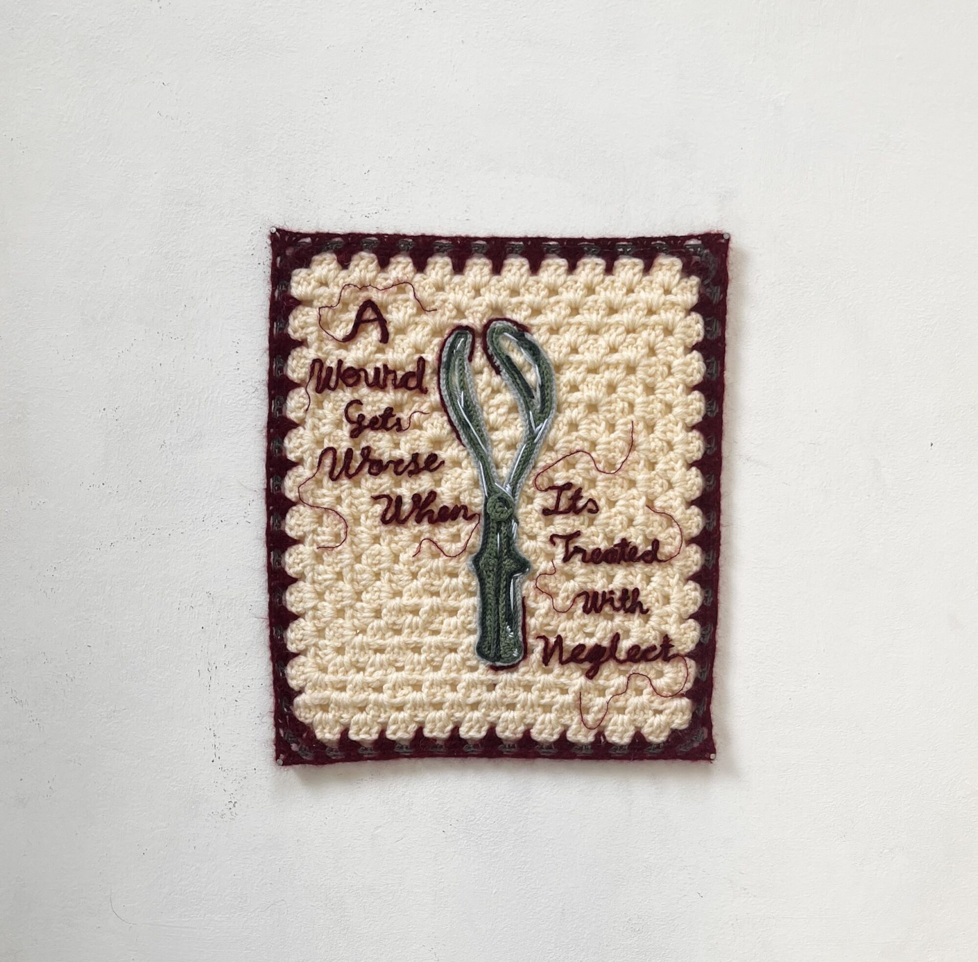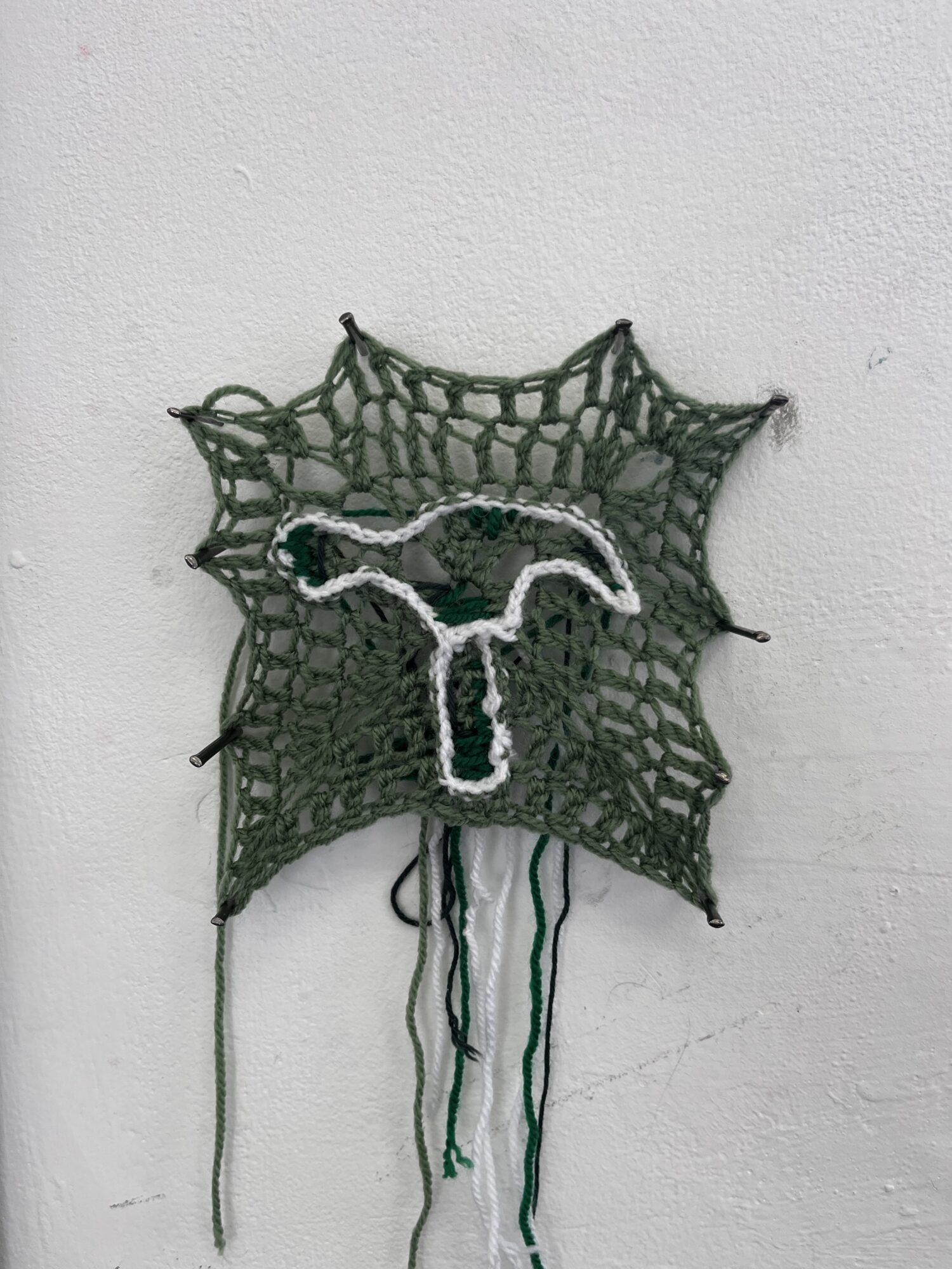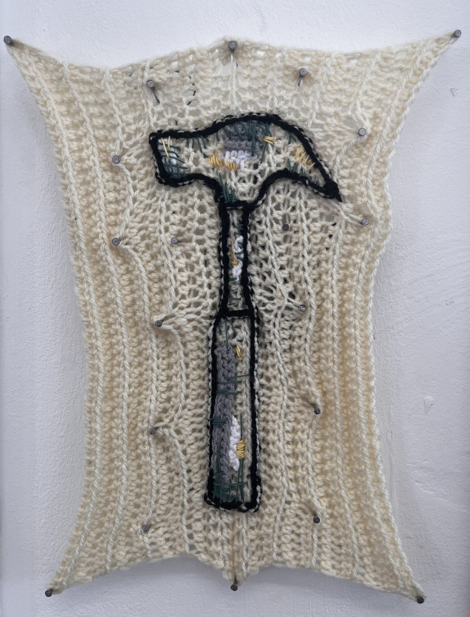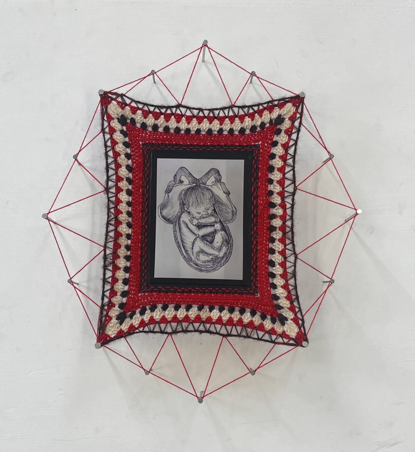 The art of crochet has been passed down through generations in my family. In my work, I want to bring attention to the dismissal of women's craft in art and the skill involved. Looking into the history of crochet, I discovered the origin of granny squares came from 1800’s Victorian times, They were a way for grandmothers to be involved in the birth of a child. Granny square blankets were a gift for the baby, even after miscarriages, Victorian childbirth had a high mortality rate due to the neglect by male doctors and instruments used. In this project I use skills in women's crafts using my great-grandmother's crochet hook with the theme of the neglect women suffered for years, focusing on the illustration of the tortuous presenting instruments used. I have been focusing on my presentation and framing of my work with long nails to bring my work away from being hung like traditional tapestries and more displayed like a work of art.