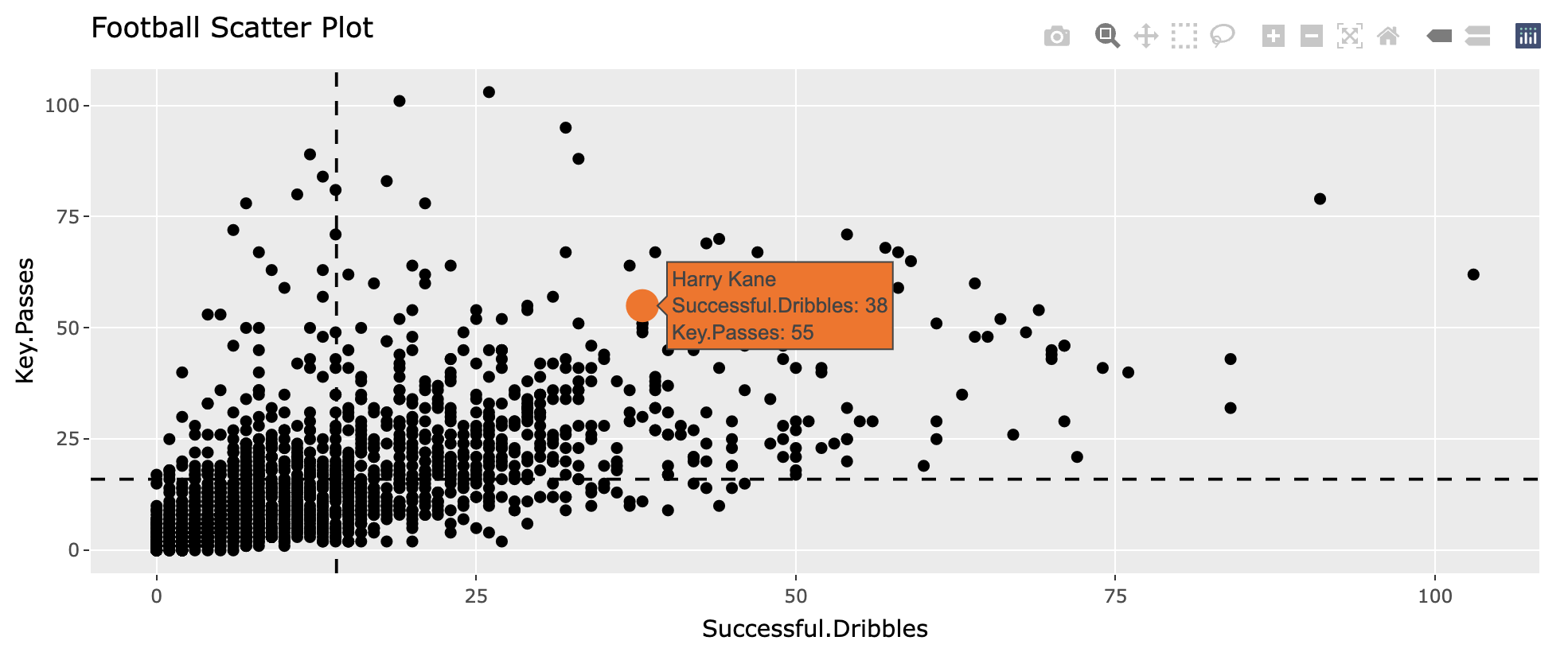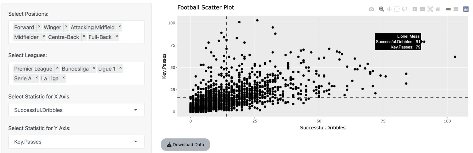 For my project I developed a Football Data Visualisation application using R and Shiny. The app allows users to view football player data and statistics as interactive data visualisations. The first feature allows users to view player data in a scatter plot, the second feature allows users to view a "Pizza Chart" which shows how well a player is performing across a number of metrics.
