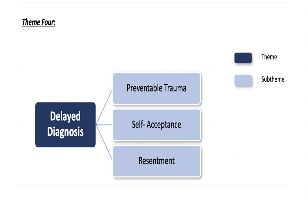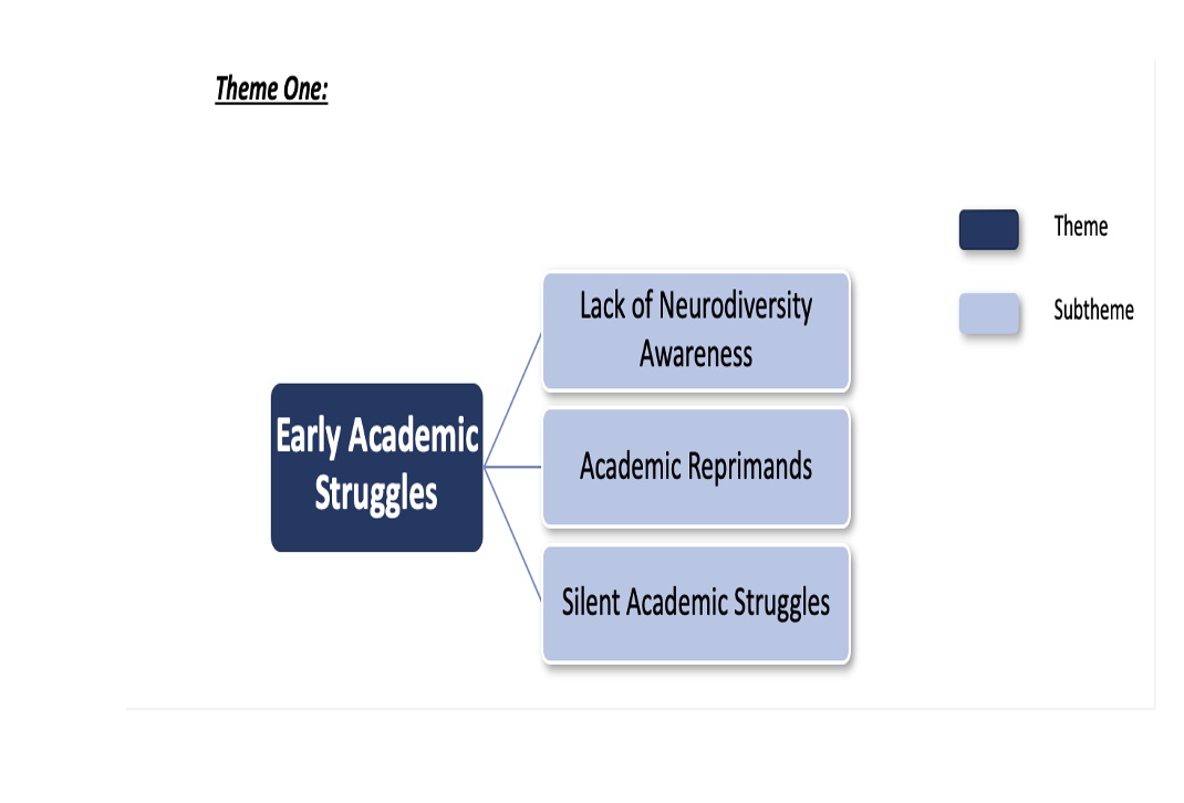 Braun & Clarke’s (2006; 2012) six-step thematic analysis method was utilised during the analysis. Four major themes evolved from the data, along with 10 accompanying subthemes. The four major themes included: 1) Early Academic Struggles; 2) Relationship Difficulties; 3) Maladaptive Coping Strategies; and 4) Delayed Diagnosis.