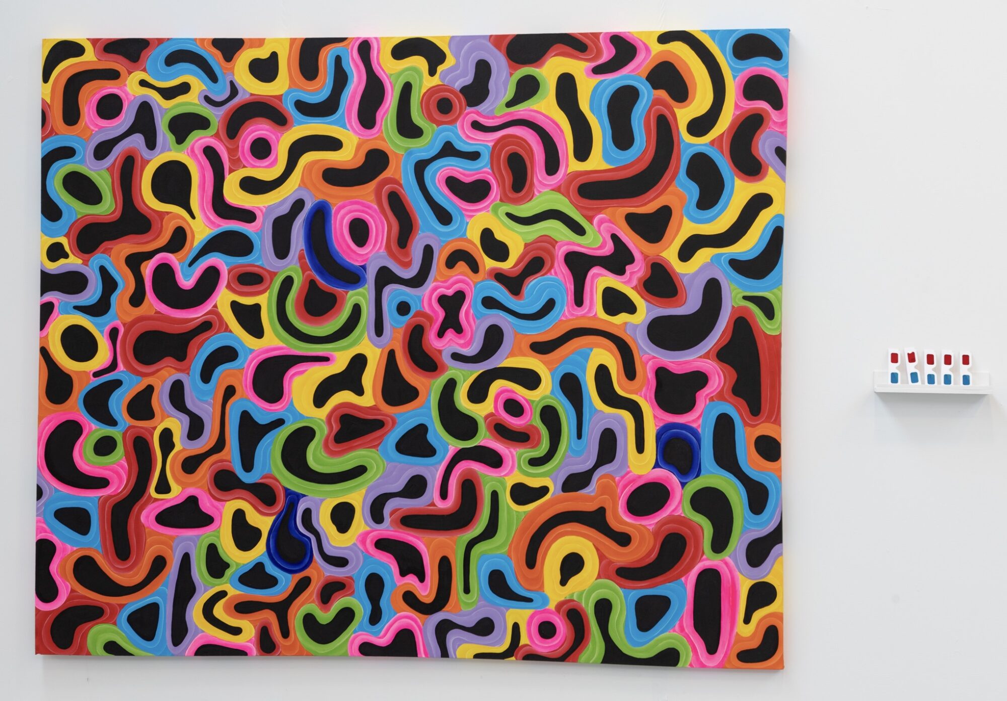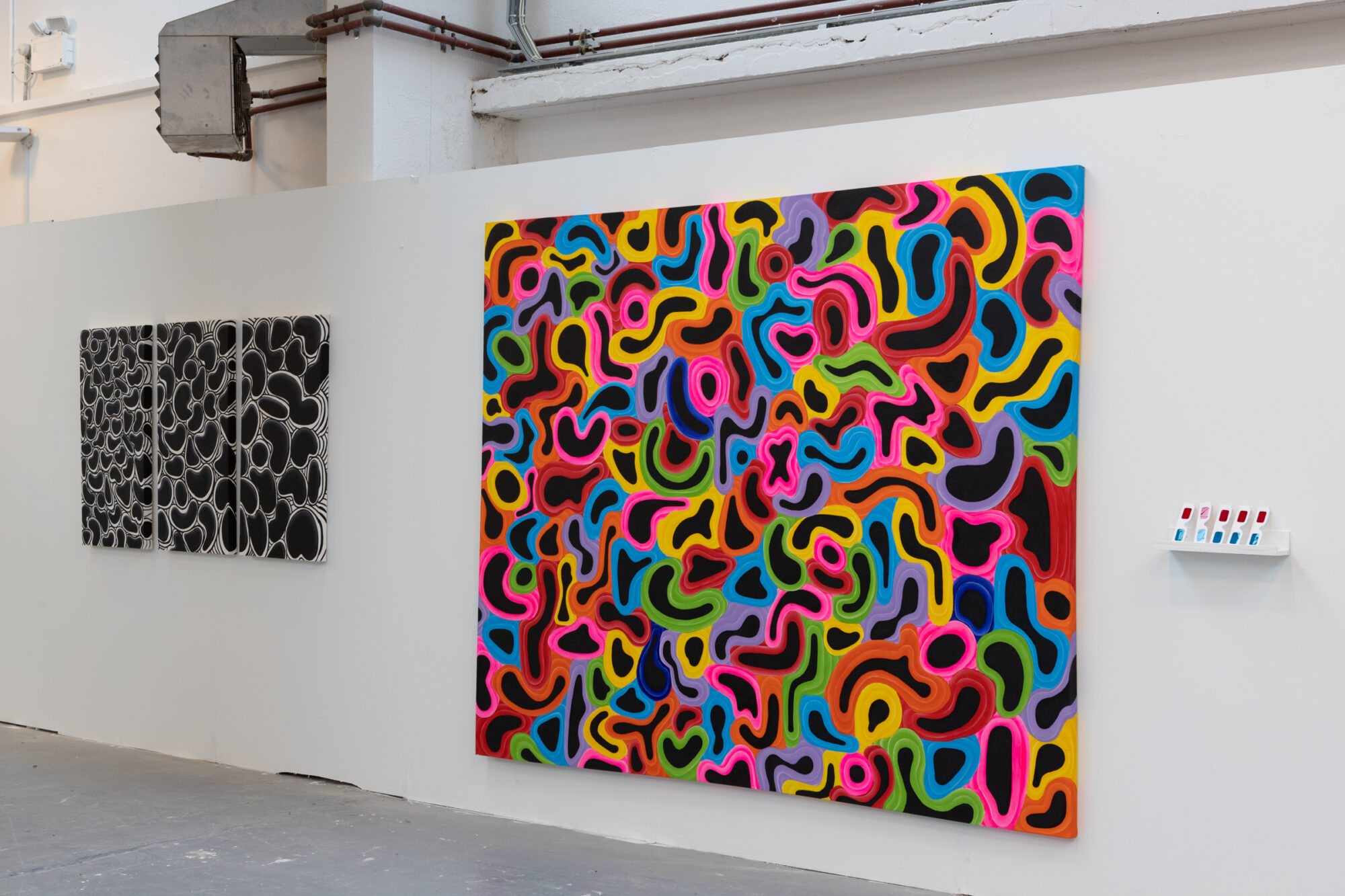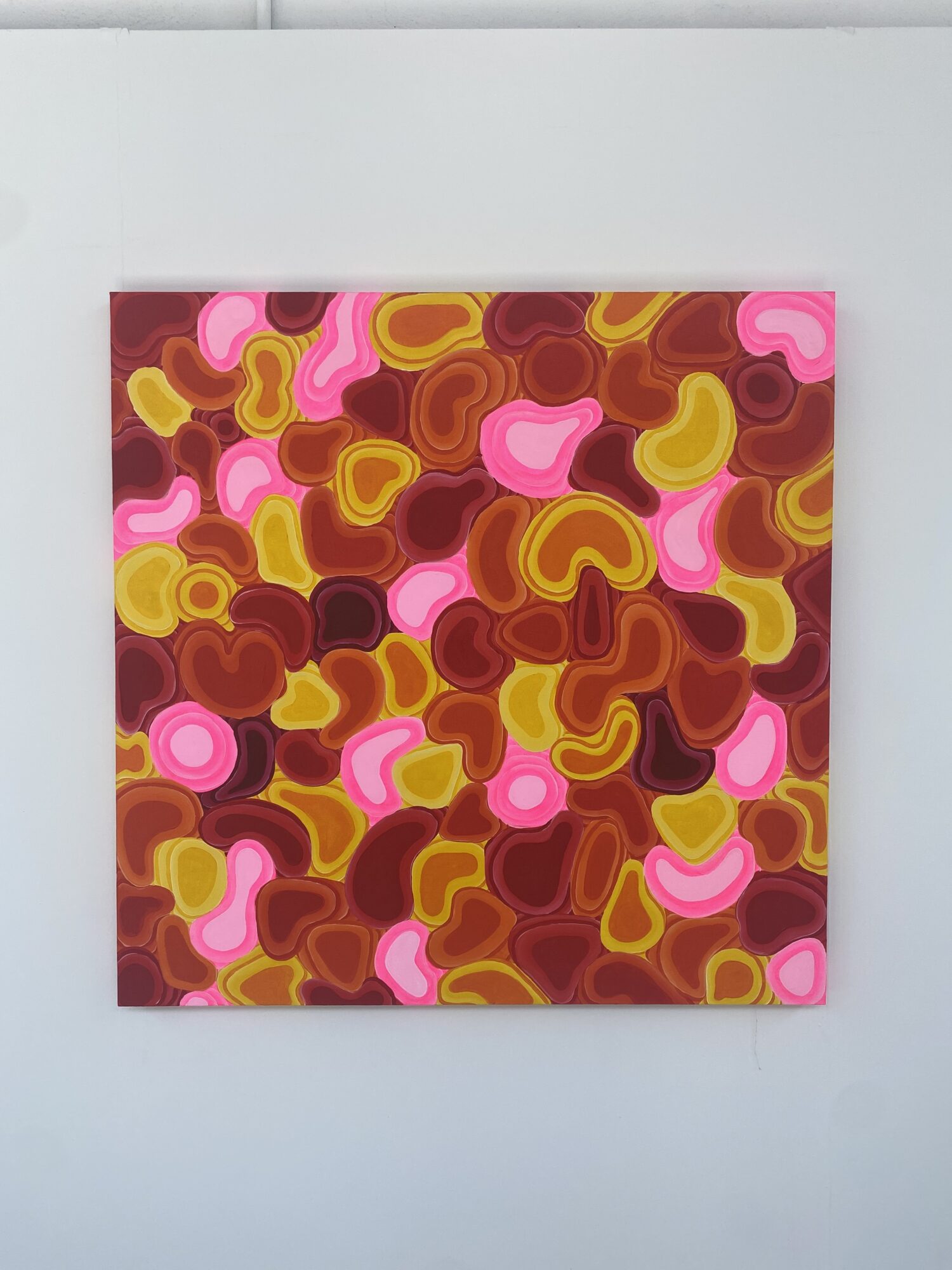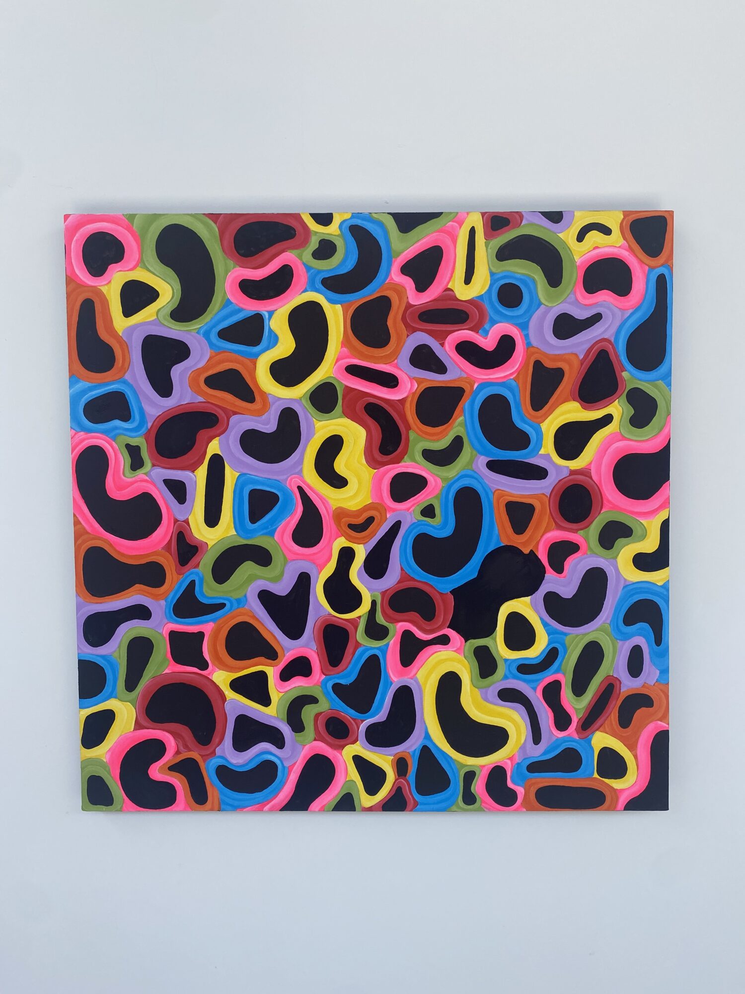 Caoimhe Farrell is a visual artist based in Dublin, Ireland. Colour theory has always been a driving force in her work. Caoimhe incorporates pattern and the idea of repetition while still using bold bright colour in abstraction. Ongoing themes found in her work are the brain, mental health and colour theory. In her current practise a recurring motif can be found relating back to the brain and the formation of memories. This is depicted in bold colour with black line work in acrylic paint. Caoimhe recently designed and painted an Elephant in the Room in collaboration with IADT. She participated in the IADT show *In the Making: Navel* at Pallas Projects (2024).