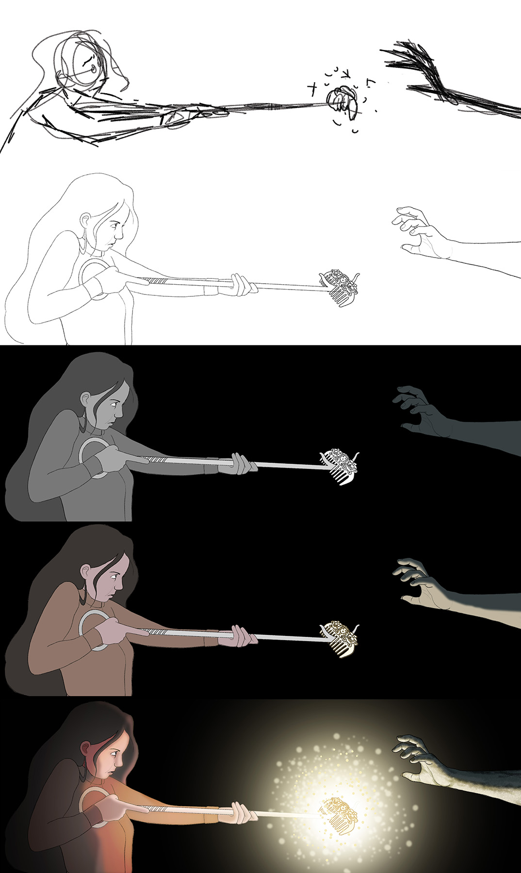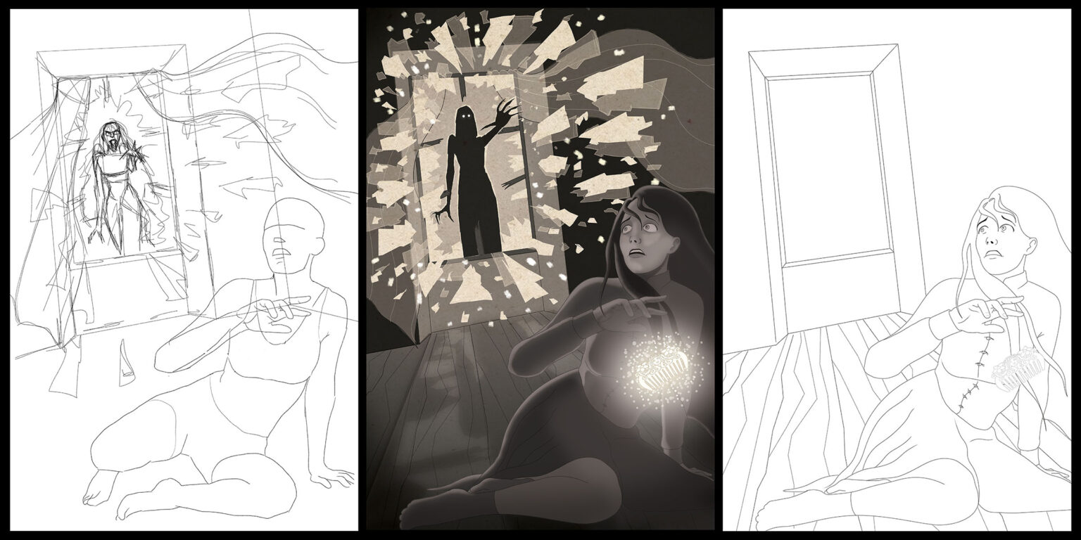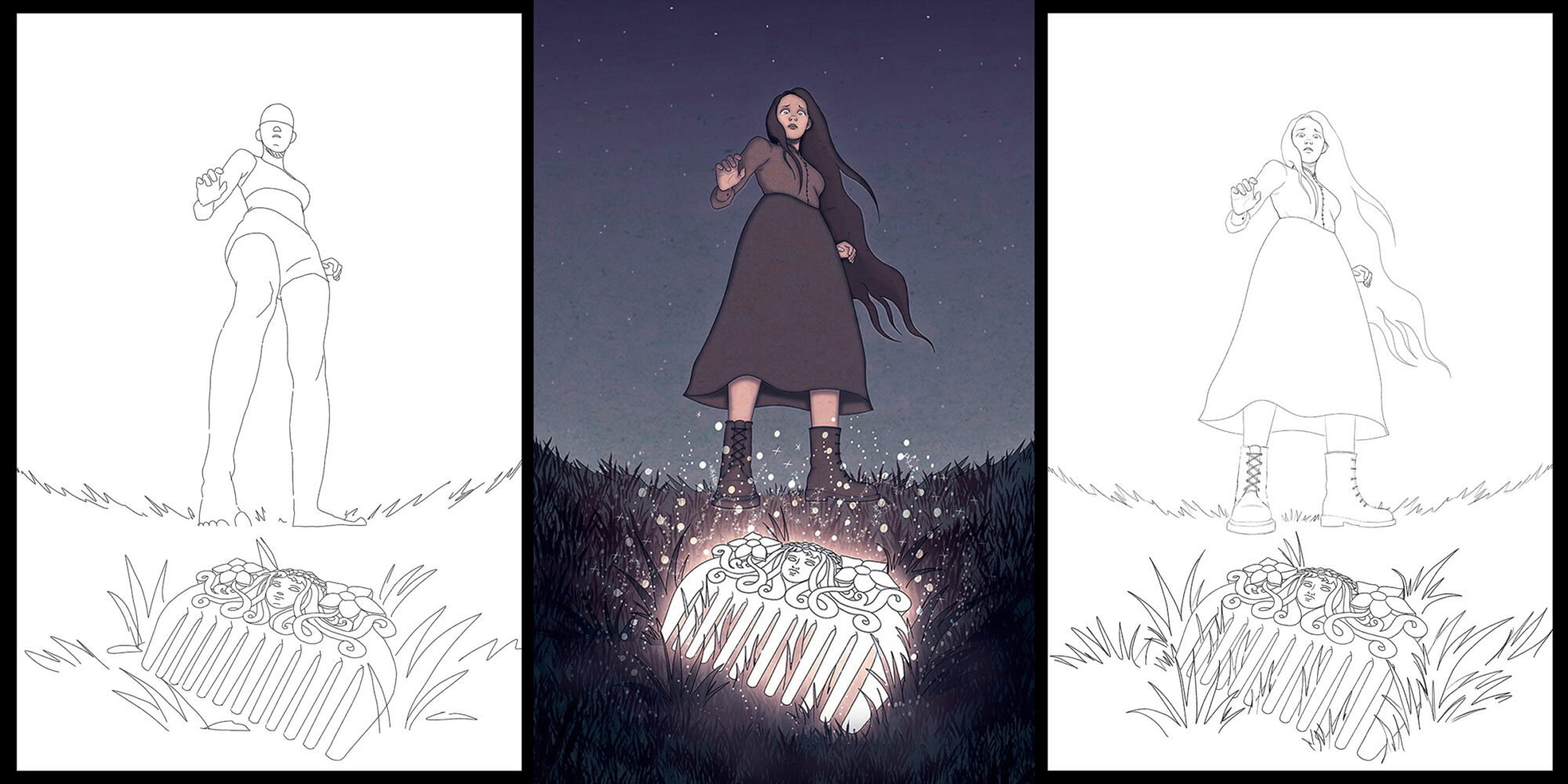 This series of artwork is inspired by a bit of mythology from where I live in County Wexford, particularly as collected in "The Folklore of Wexford" by Michael Fortune. As children growing up, we were taught to be wary of any lost or discarded combs we happened to find outside as we were told that they belonged to the legendary Banshee spirit. According to our local folklore, if someone was foolish enough to take a comb found outdoors The Banshee would follow them home, where she would scream and bang at their doors, walls, and windows until the comb was returned to her. The only way you could safely return the comb to The Banshee was to hand it to her on the end of a pair of iron fire tongs, otherwise she would rip your arm off along with the comb when she took it back. The above illustrations are my interpretation of this tale as a horror/thriller in which a naïve girl accidentally invokes the wrath of the Banshee after stealing her comb.