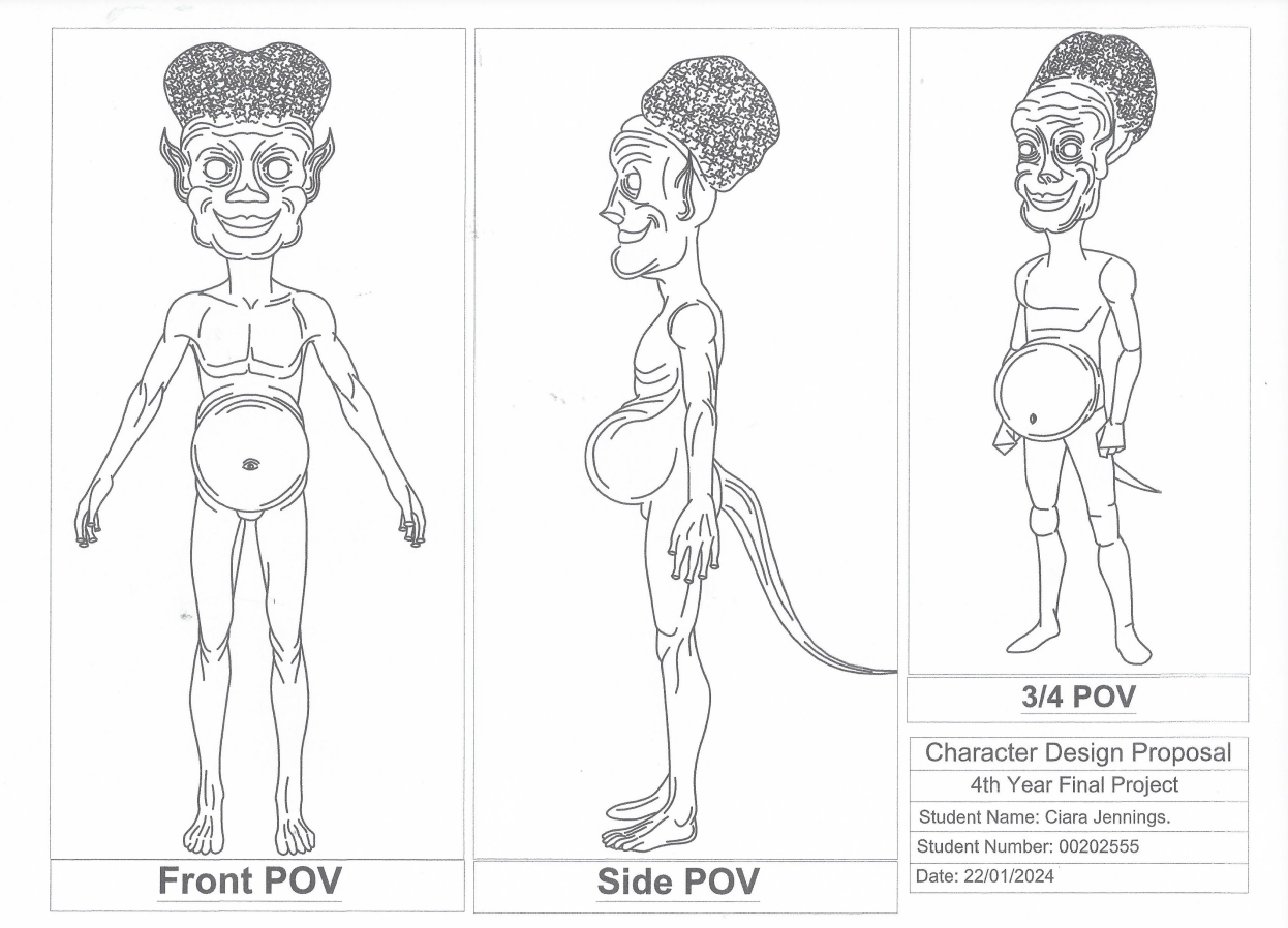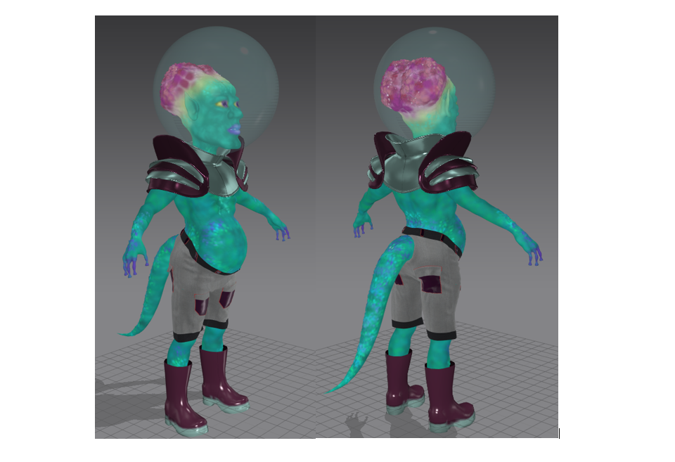 The use of leathery skin, big eyes, and small bodies with big heads, characteristic of these sources of inspiration, lends Gumbo a unique and memorable appearance. My incorporation of elements from these iconic characters' space suits and clothing styles adds an extra layer of detail and authenticity to Gumbo's attire, contributing to the overall cohesion and believability of his design.
