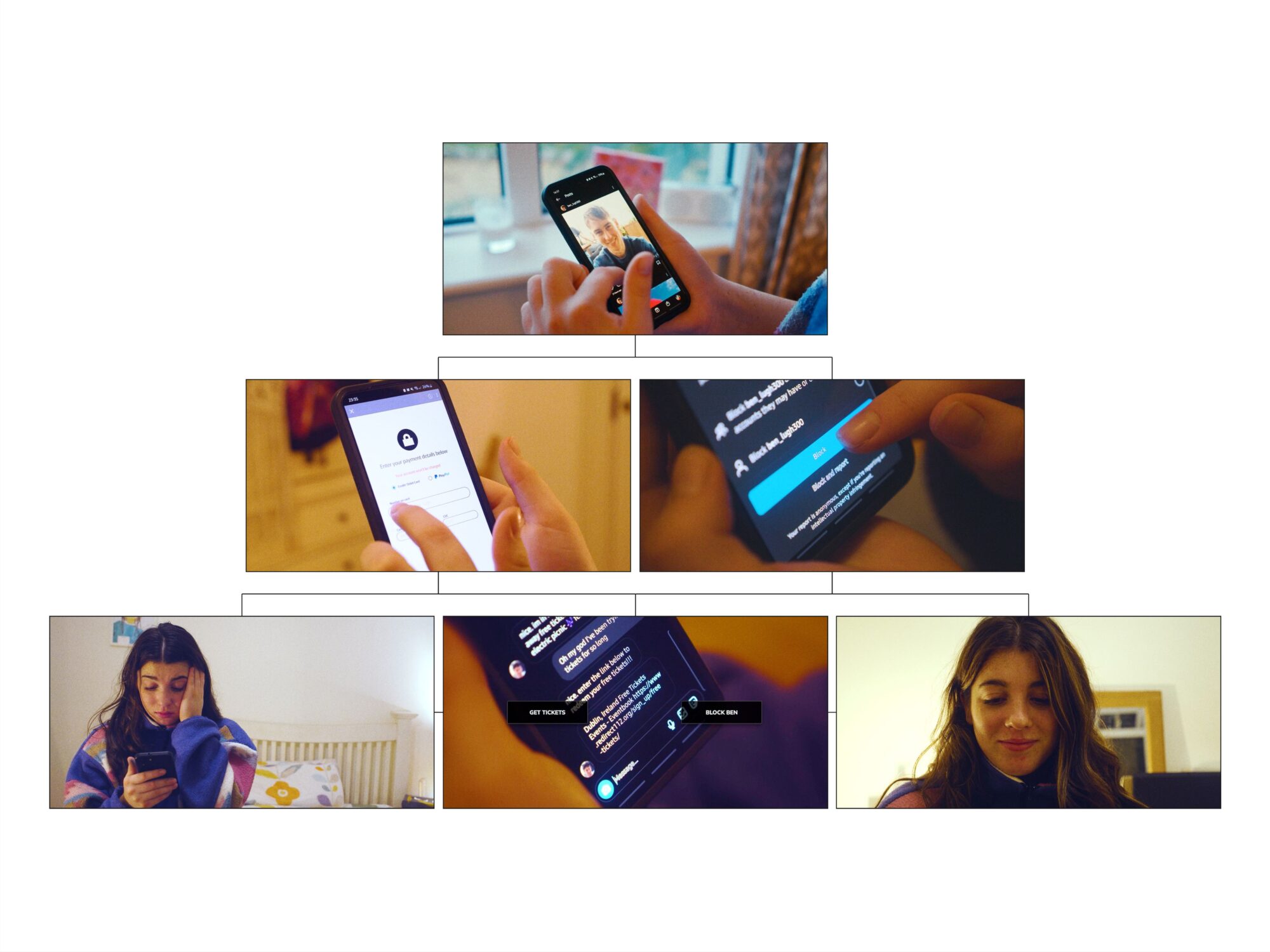 For the film intervention apparatus, an educational interactive short film, “Cat and the Phish”, was produced by the researcher. The short film was designed as an accessible narrative to promote cyber safety on social media, featuring a character choosing how to respond to a catfish (fraudulent) user on Instagram. The experimental groups viewed the interactive film vignette, and the control groups viewed a linear (non-interactive) version of the film. Positive and negative reinforcement was also measured using alternative film endings. The participant responses were recorded using the State Empathy Scale and the User Engagement Scale.