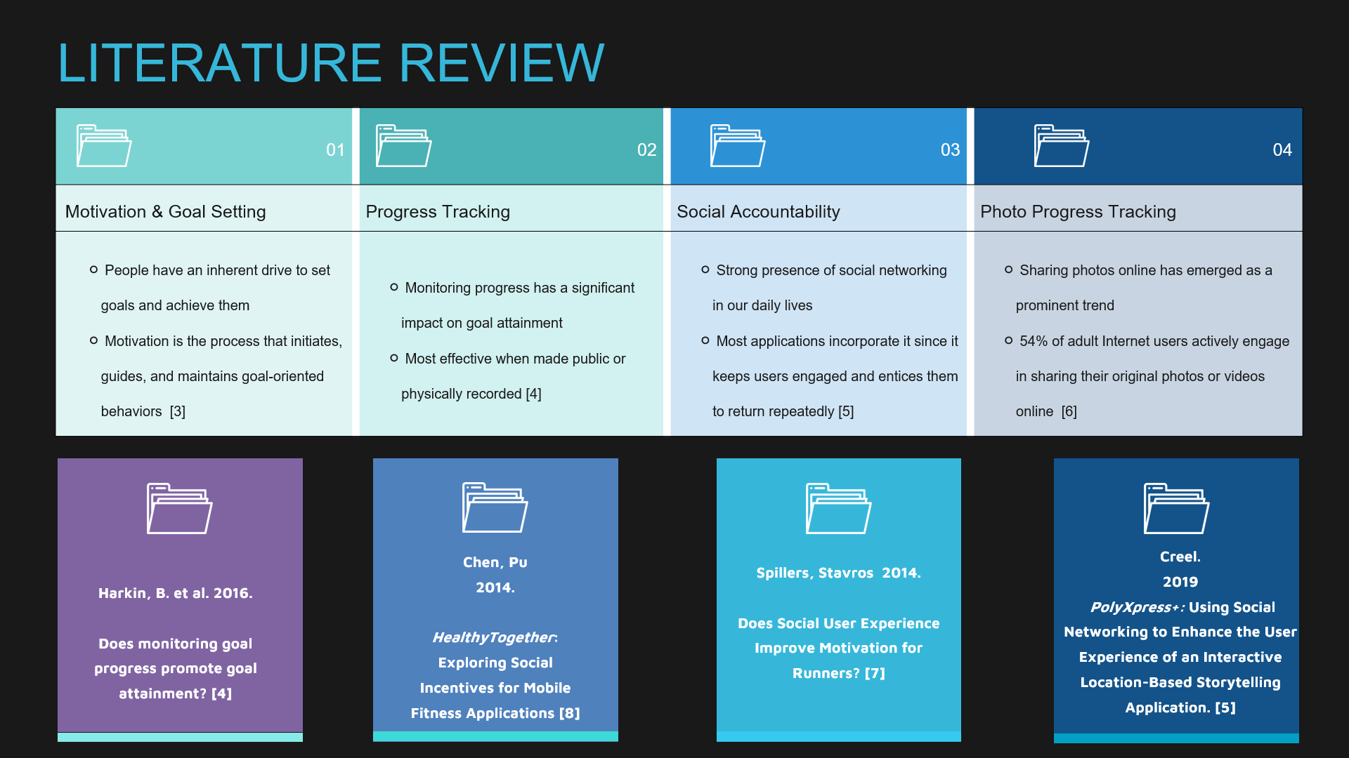 Literature review addresses research gaps on topics of interest to this study, focusing on research on motivation and effective goal setting, progress tracking, social aspect, and progress tracking with photographs. Although existing literature acknowledges the effectiveness of social features, there is a lack of direct research specifically investigating their impact on users' motivation and retention within progress tracking applications.