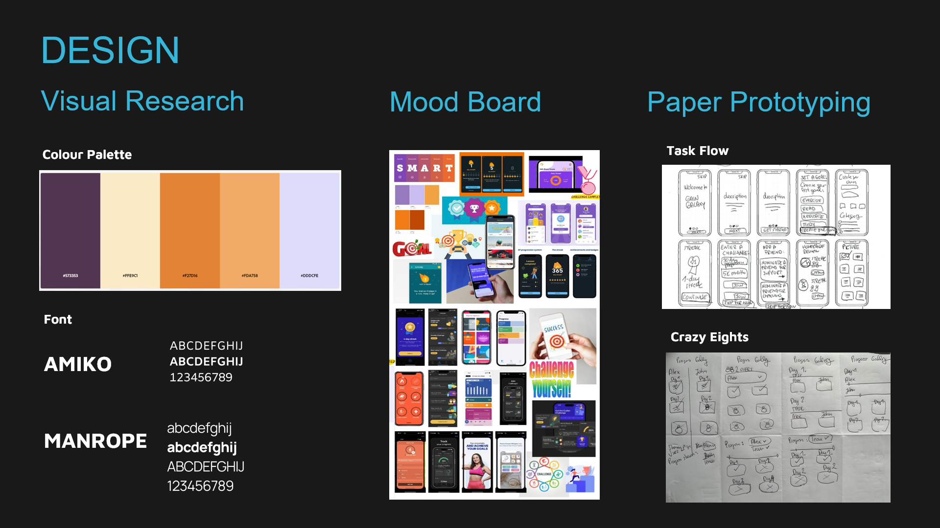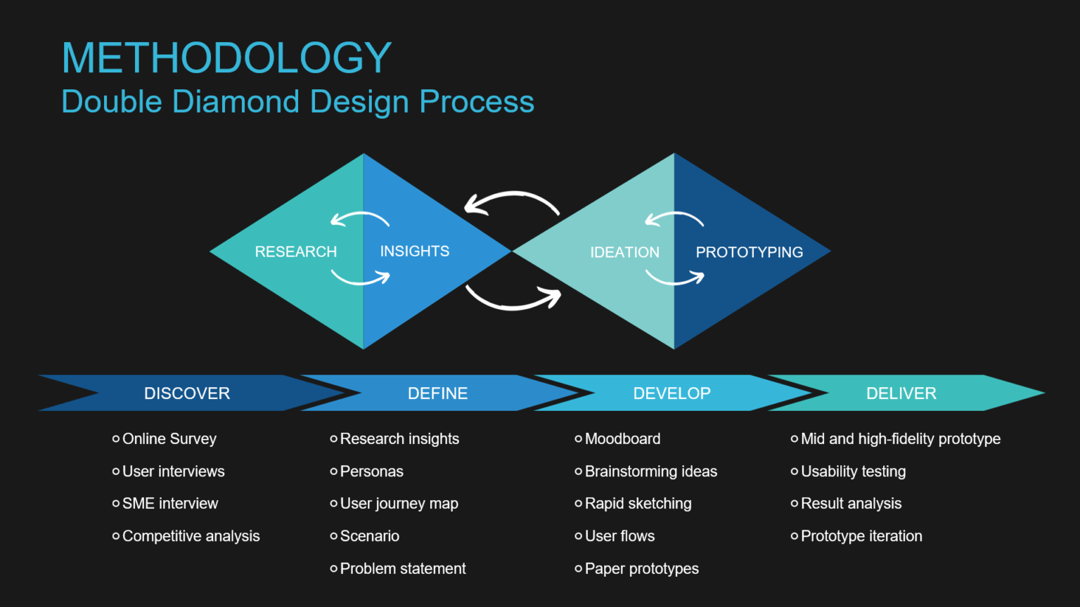 The project used the Double Diamond design process to examine the problem and develop a digital product. With a number of progress tracking applications that already exist, the objective was to focus on creating a unique and innovative design. This process adopts an iterative approach where all ideas generated in response to the design challenge are tested and modelled, and only the most relevant ideas are retained, resulting in a more refined solution finding process.