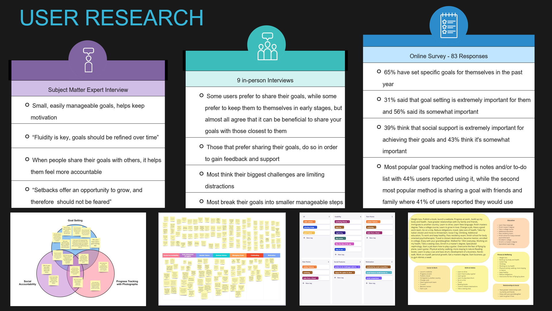 User research was conducted in order to investigate the user experiences and behaviors around progress tracking. Research consists of a mixed-methods approach, combining qualitative and quantitative techniques to gather insights into user perspectives and behaviors. The research methods include an online survey, user interviews and an SME interview.