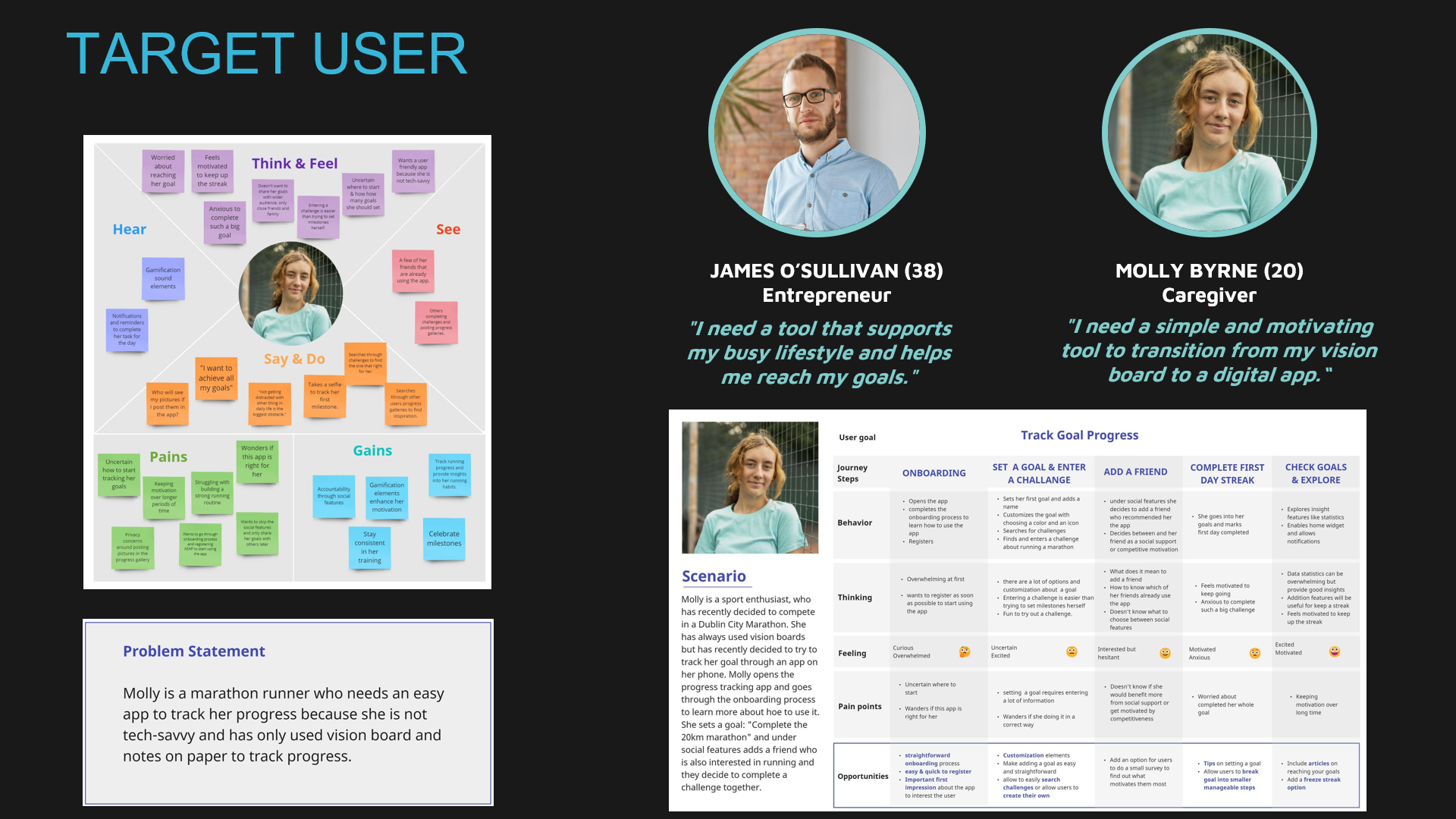 Creating a concrete definition of a target user, helped to guide the design process by ensuring that the users remain the central focus in decision making. Collected data from the user interviews and survey helped facilitate and guide the development of a target user. A primary and secondary persona was developed, following by a journey map, scenario and finally a problem statement.