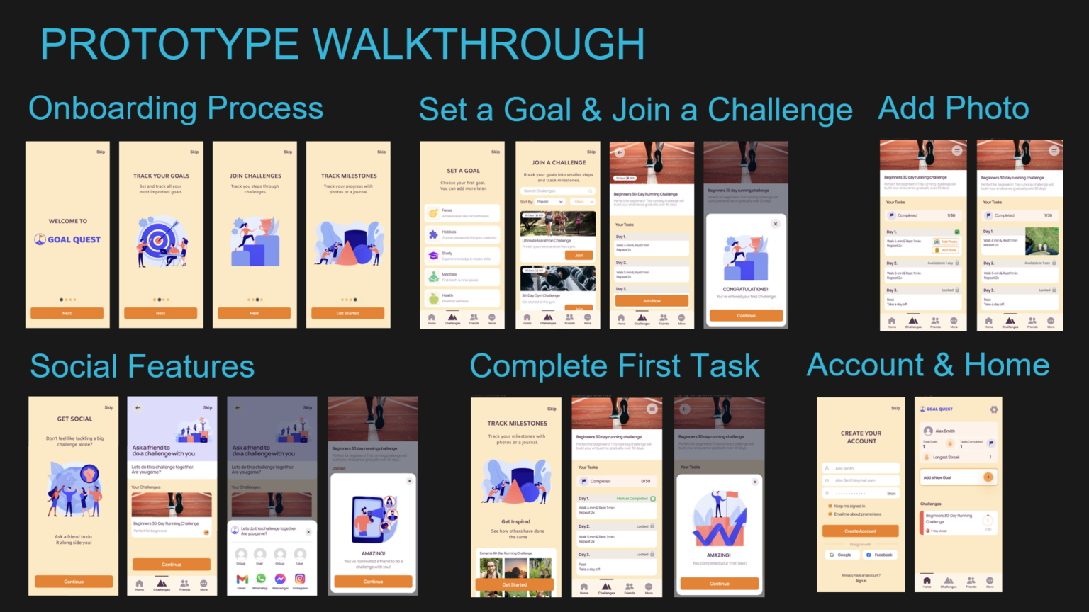 Two prototypes were developed. Prototype A is without any social features. Users set a goal, join a challenge, and track the progress with the use of photographs or personal notes. Prototype B encompasses social features, it follows the same process as prototype A, only now users are able to invite peers to do a challenge with them, and both parties have insight into each other’s progress.