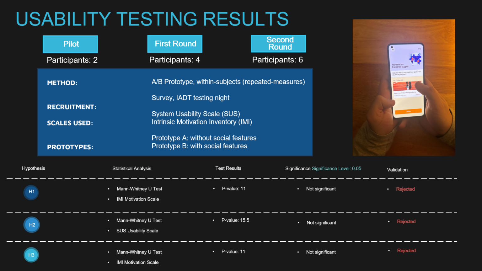 To validate or challenge the hypotheses, data analysis was conducted on the collected research insights. Which were obtained from qualitative and quantitative sources based on results from usability testing. A/B Prototype testing within-subjects was conducted in order to gather statistical data. Results were measured using SUS (System Usability Scale) and IMI (Intrinsic Motivation Inventory) scale. While qualitative analysis, based on post-interview questions, was analyzed through systematic content analysis.