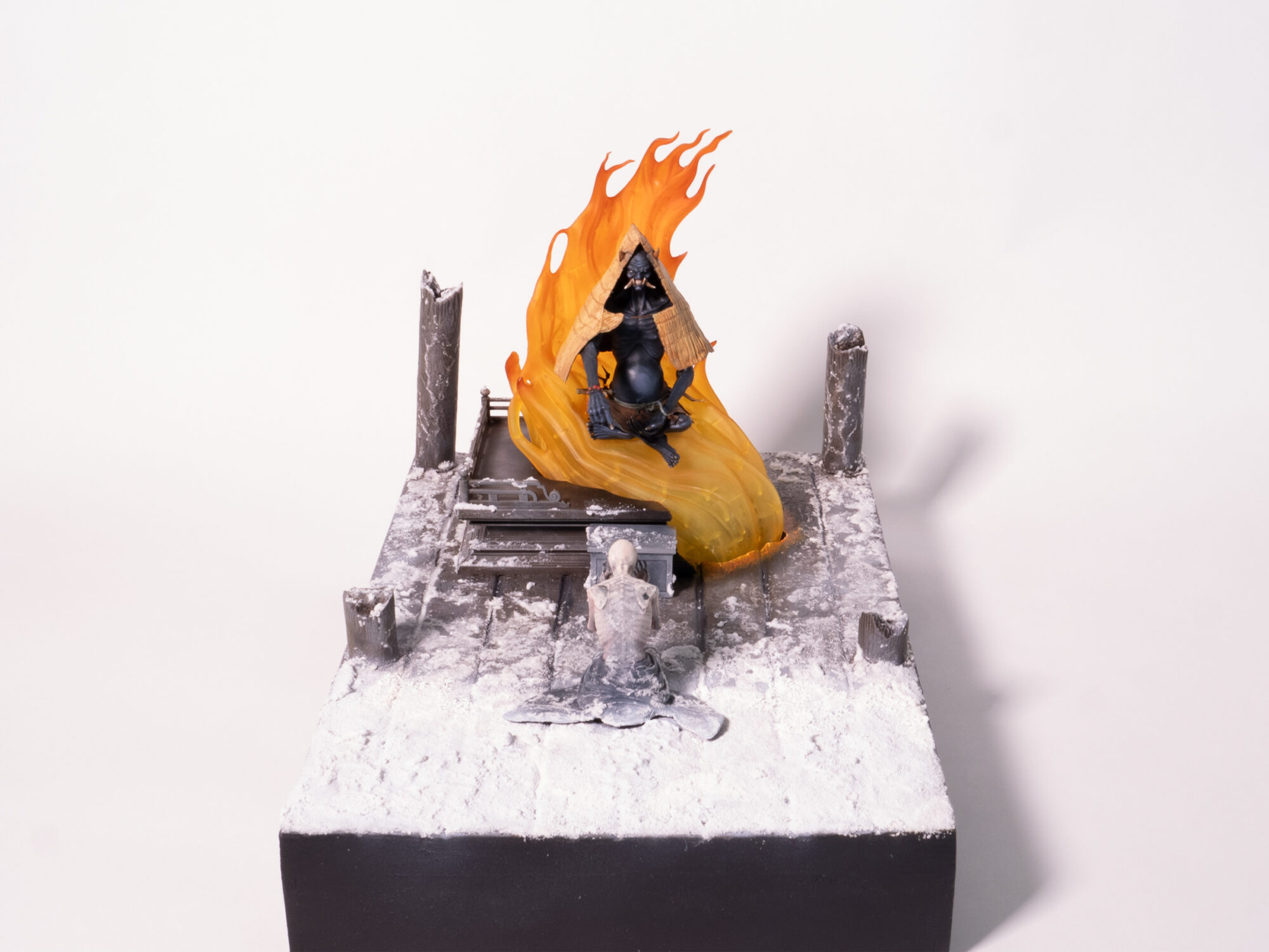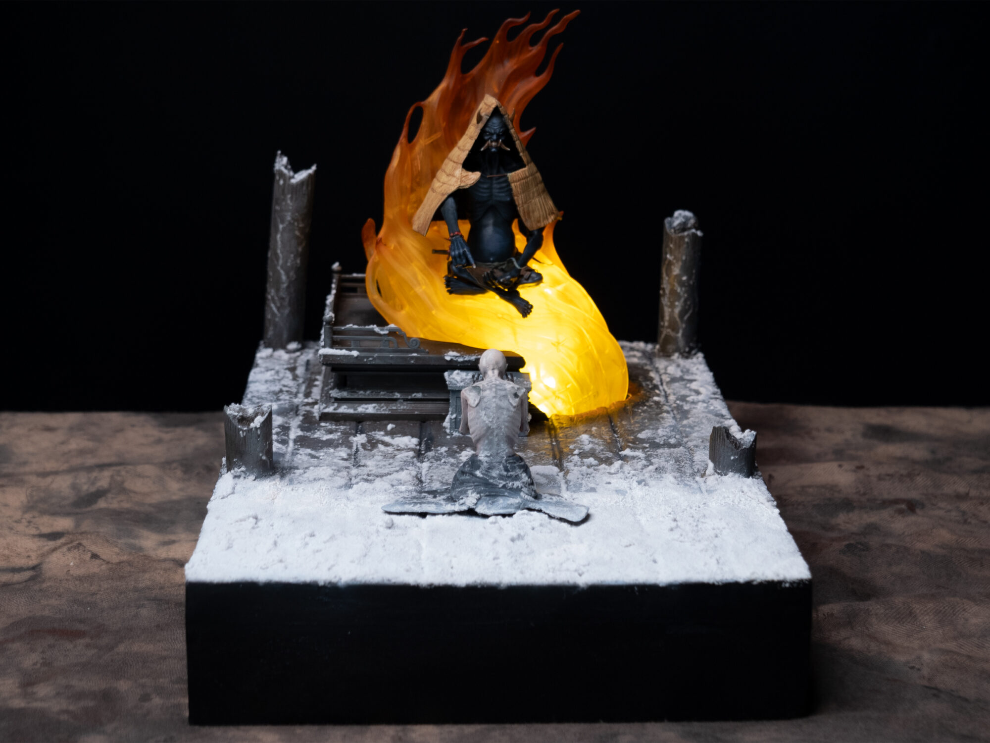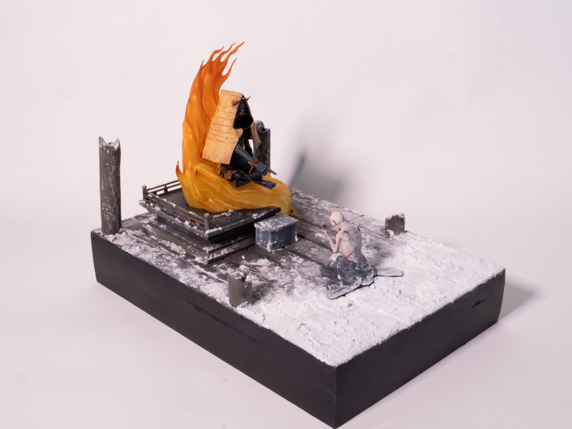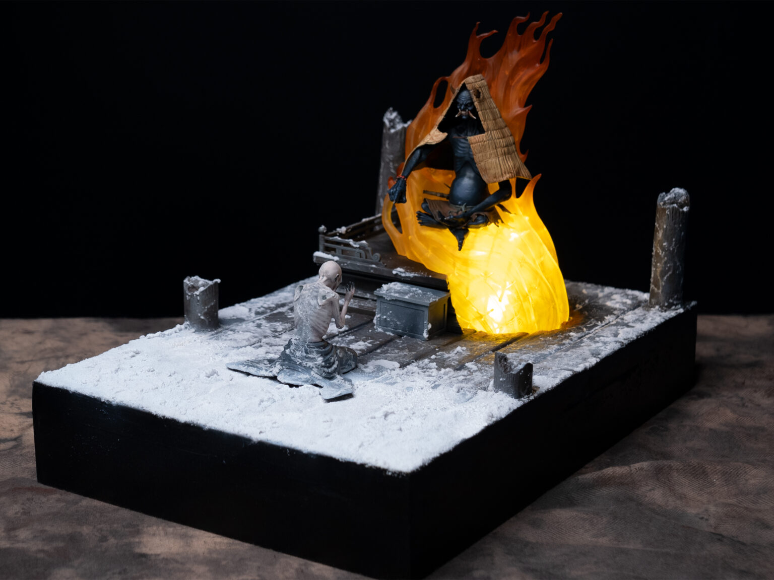 A 3D printed model kit of a scene inspired by Japanese mythology. The kit depicts a confrontation between a Buddhist monk and a Black Oni, a creature from Japanese mythology. The kit comes with an illustrated cover sleeve and booklet, containg assembly instructions and a quick overview of how the kit was created.