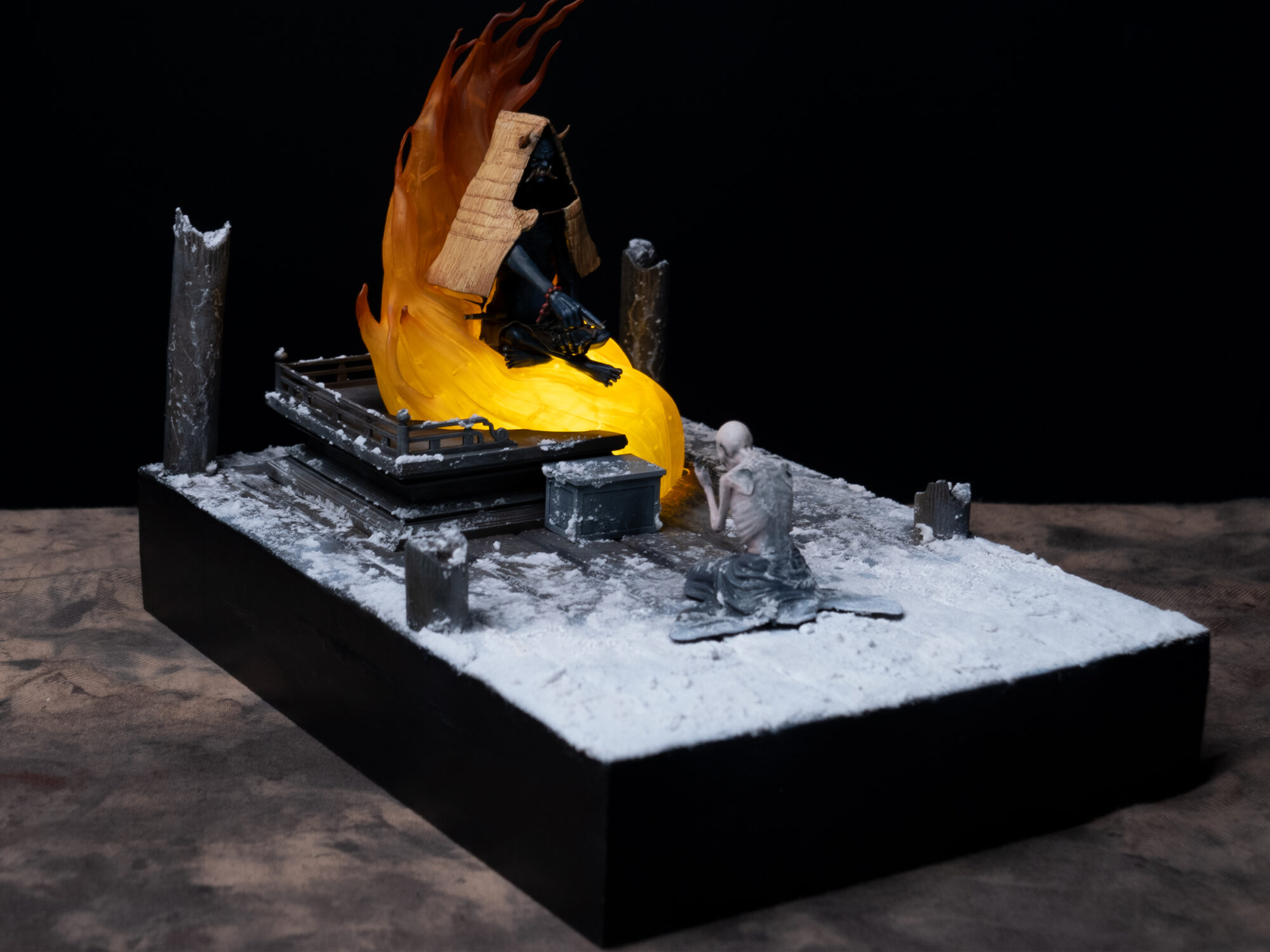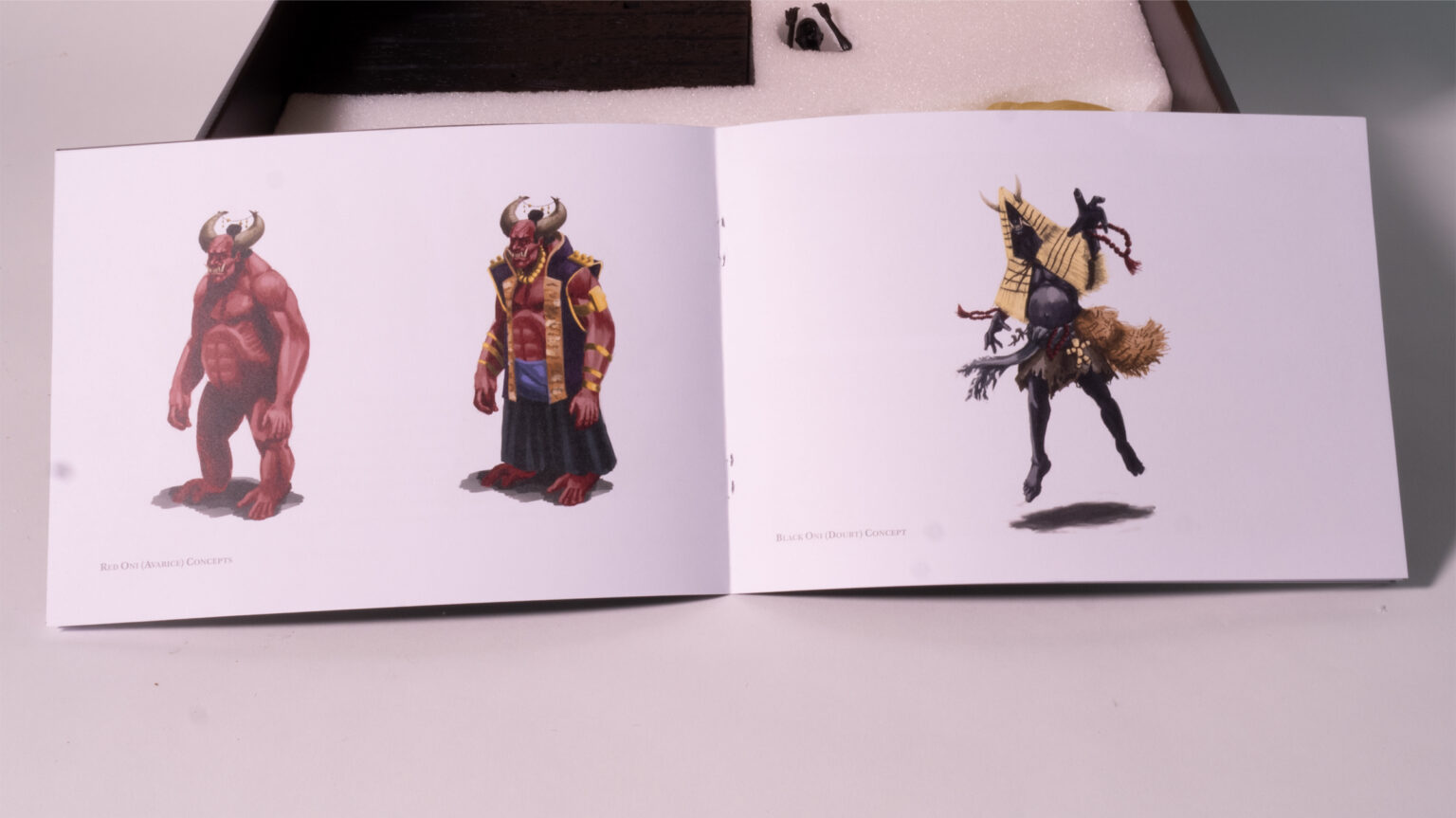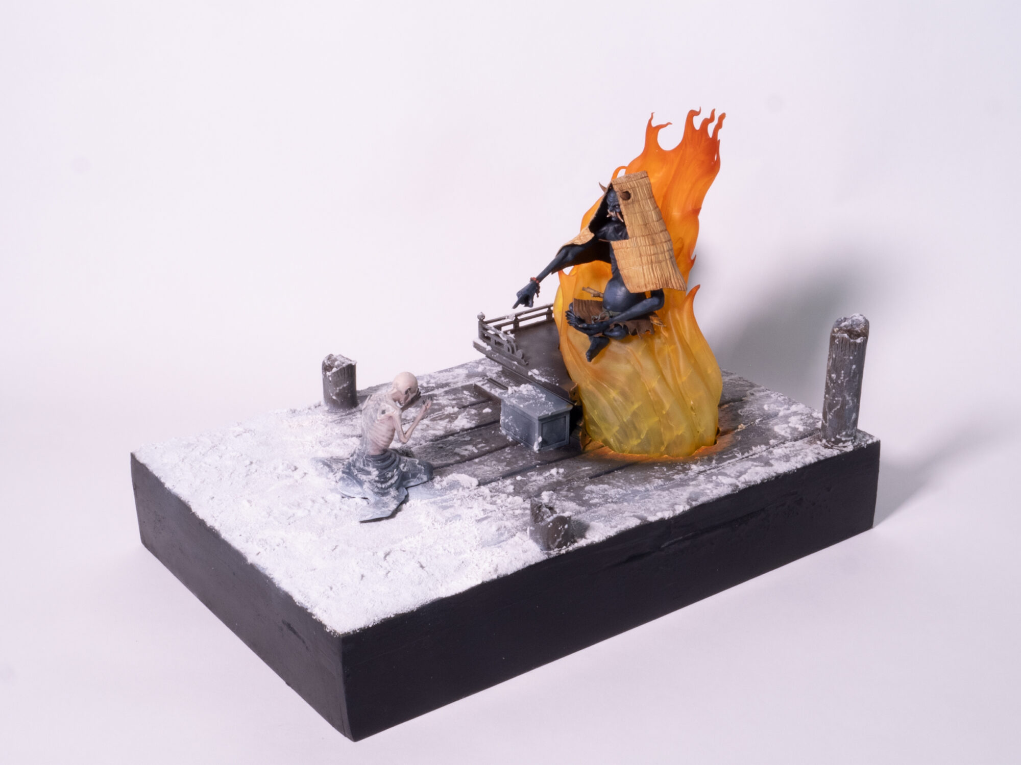 A 3D printed model kit of a scene inspired by Japanese mythology. The kit depicts a confrontation between a Buddhist monk and a Black Oni, a creature from Japanese mythology. The kit comes with an illustrated cover sleeve and booklet, containg assembly instructions and a quick overview of how the kit was created.