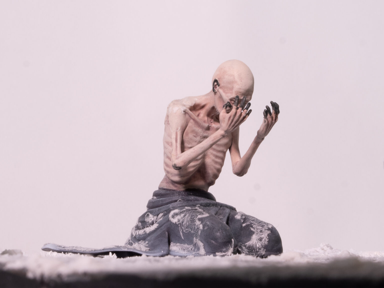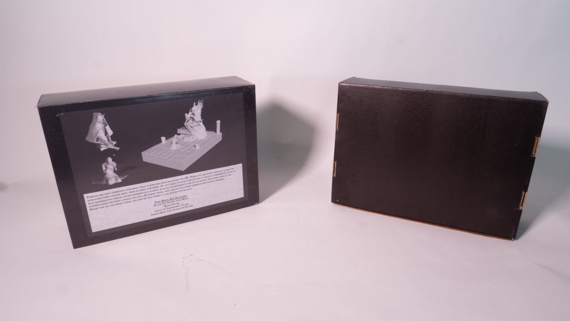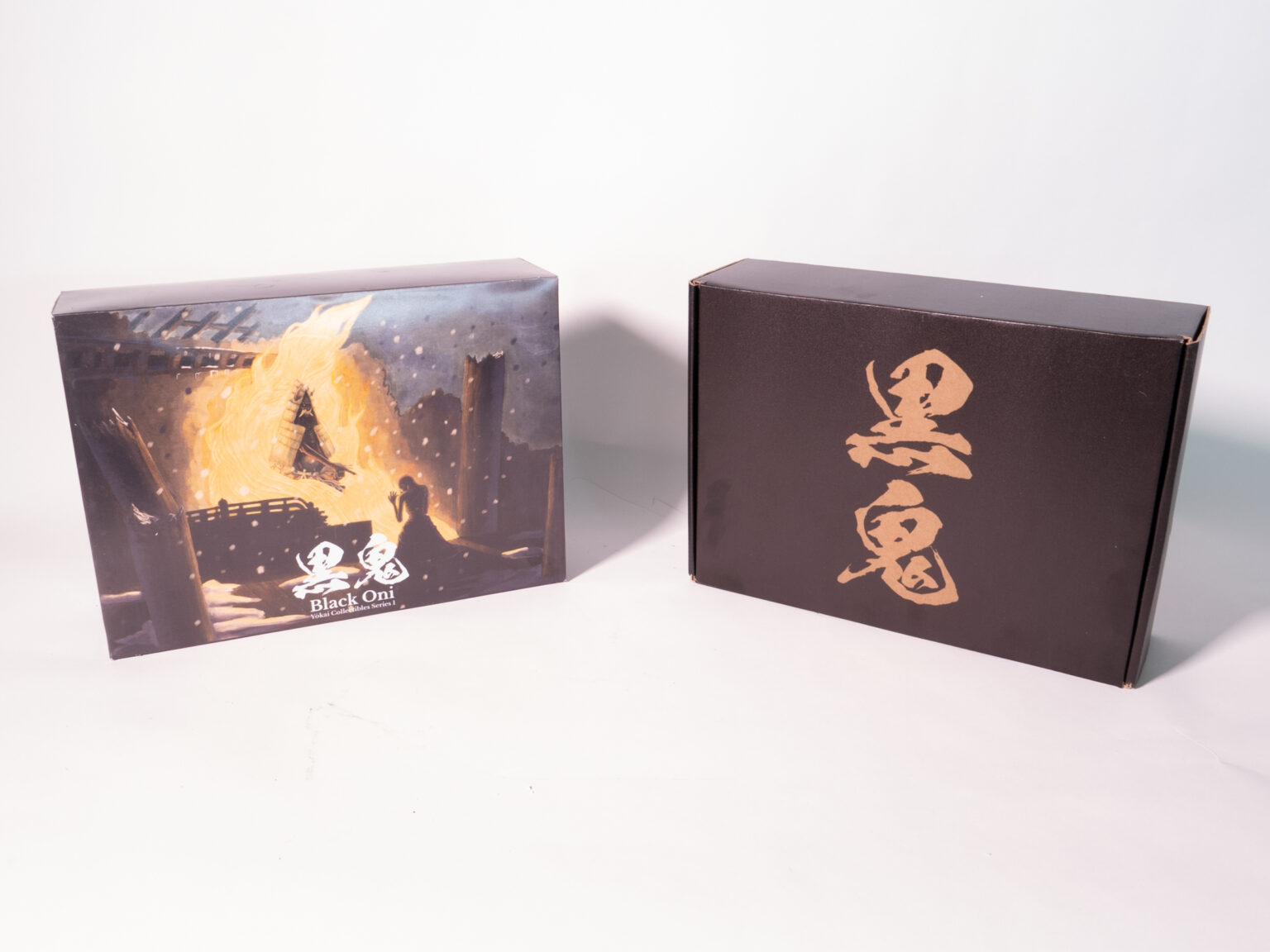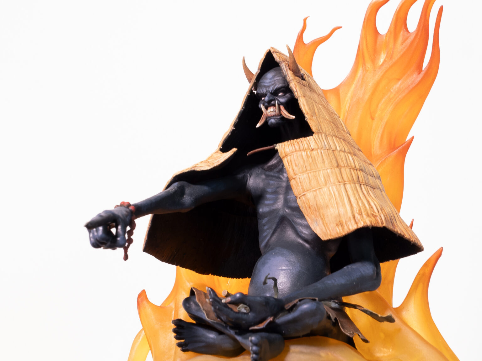 A 3D printed model kit of a scene inspired by Japanese mythology. The kit depicts a confrontation between a Buddhist monk and a Black Oni, a creature from Japanese mythology. The kit comes with an illustrated cover sleeve and booklet, containg assembly instructions and a quick overview of how the kit was created.