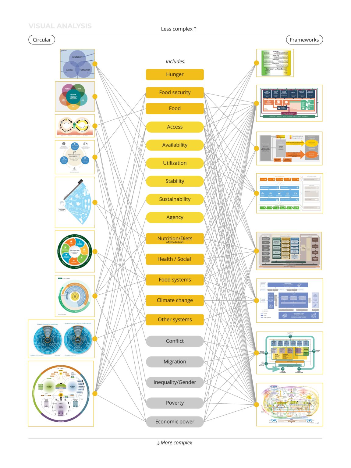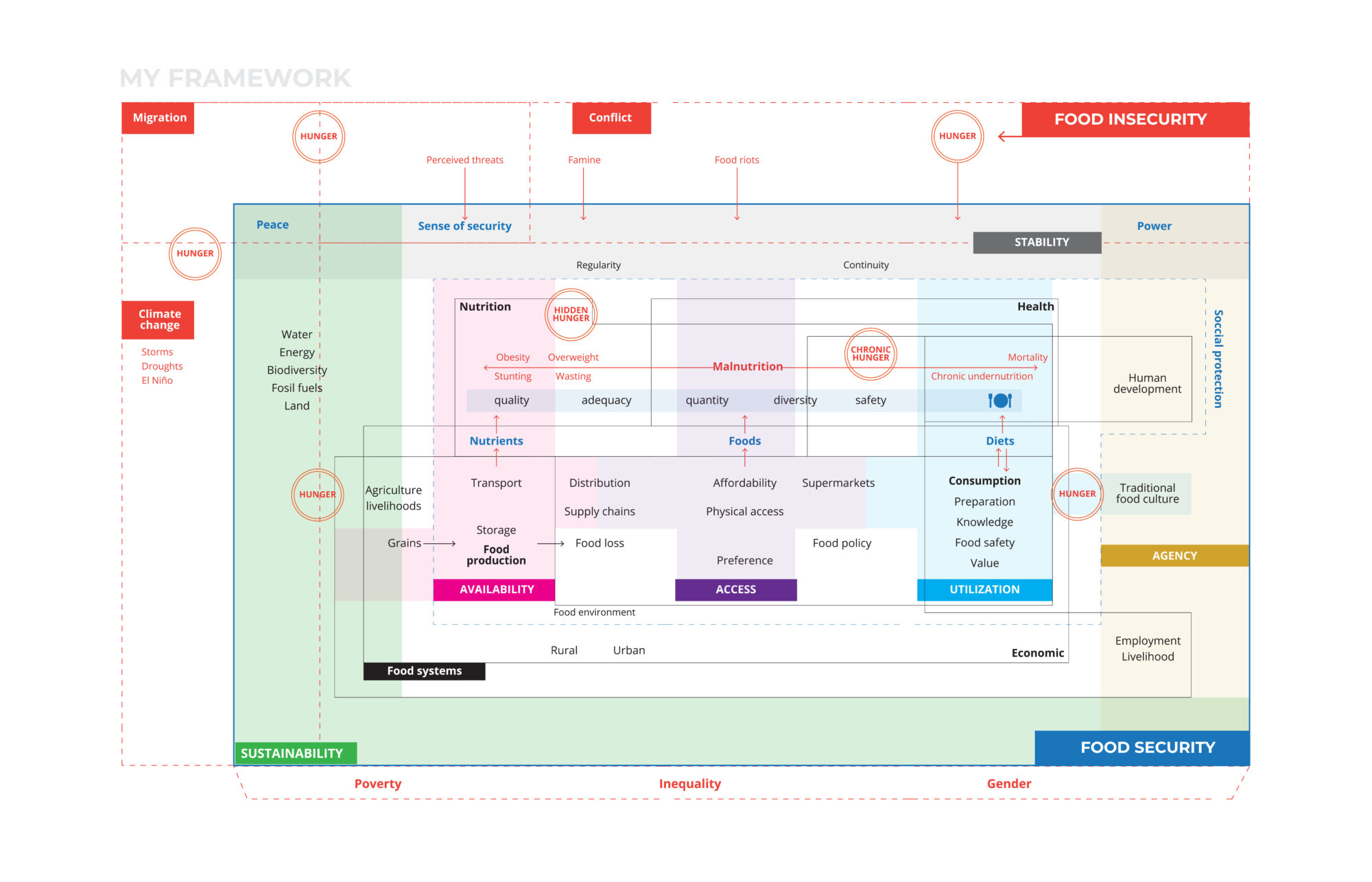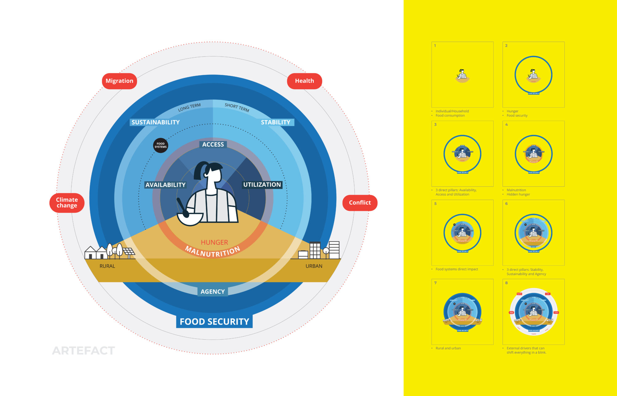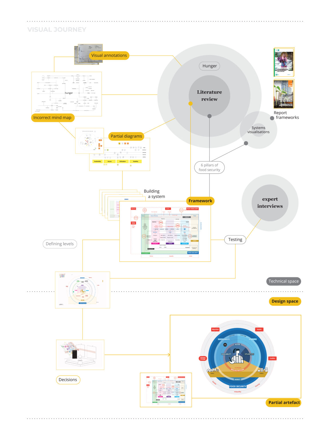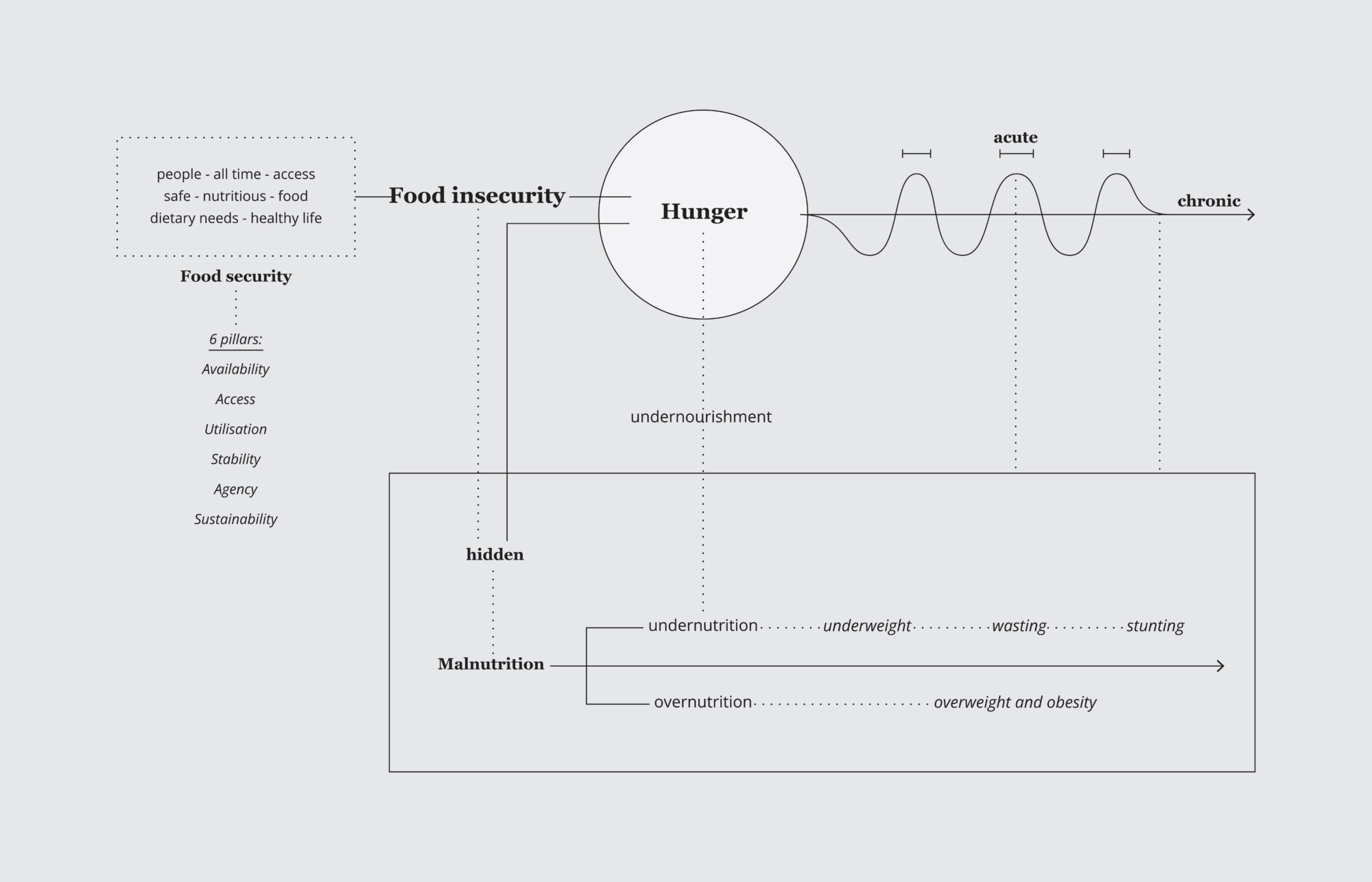 The research emphasizes systemic hunger and the need to connect drivers and components between conflict, climate change, migration, food systems, and nutrition. Moreover, there is a lack of visual literature on hunger for those outside the humanitarian world, or it exists within highly technical reports, making it challenging for a broader audience. This research concludes with a first attempt visual artefact to connect key aspects of the food security system.