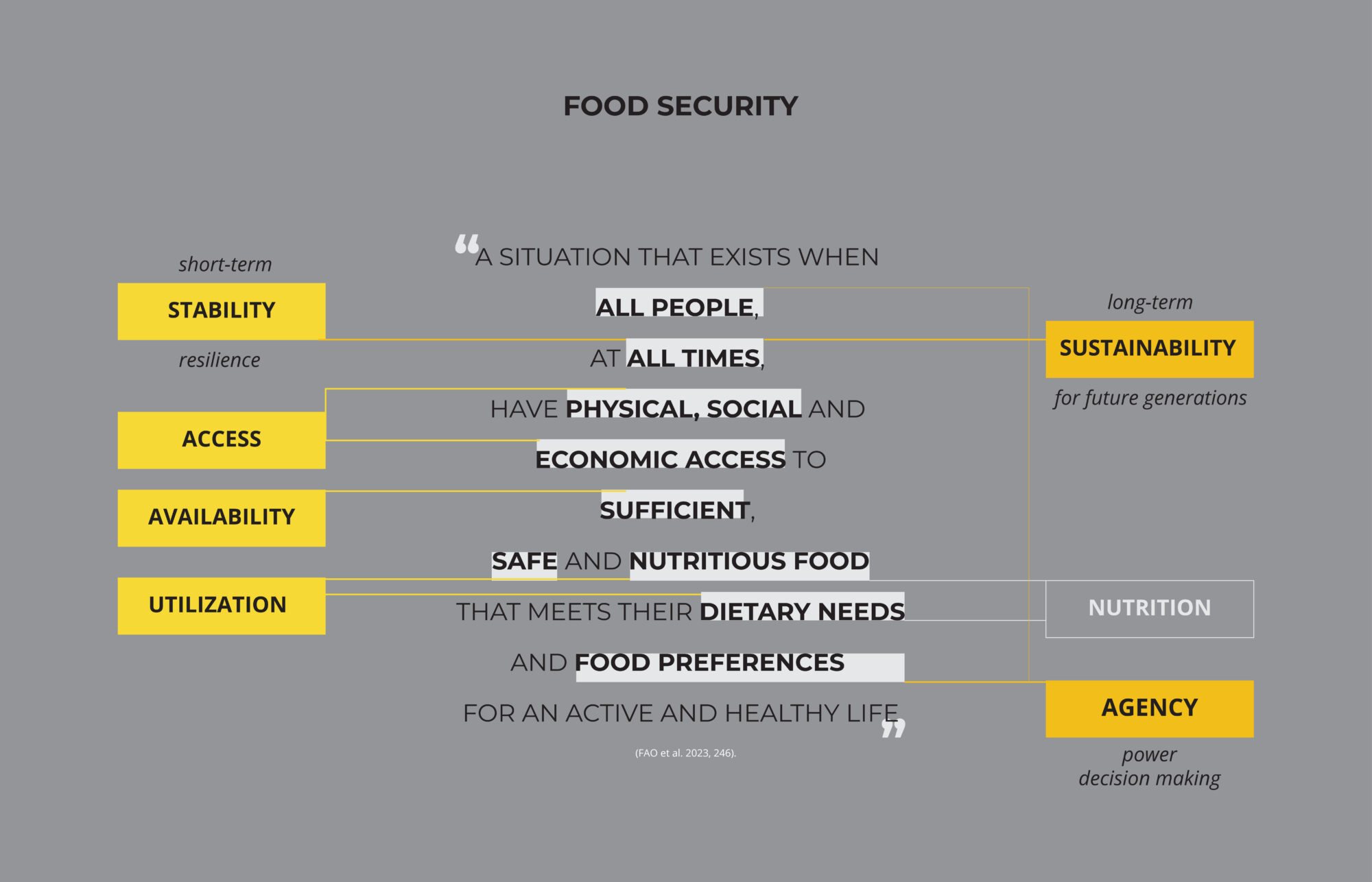 ‘Hunger is not a single sensation in our bellies; it is a grumbling sound felt globally as a result of our failing system.’ The current system is broken, with hunger being a pillar of this failing structure. Hunger is not solved only with food. Having food and accessing it may not guarantee its lasting availability, and individuals might compromise food quality and quantity, creating an insecure link to food.