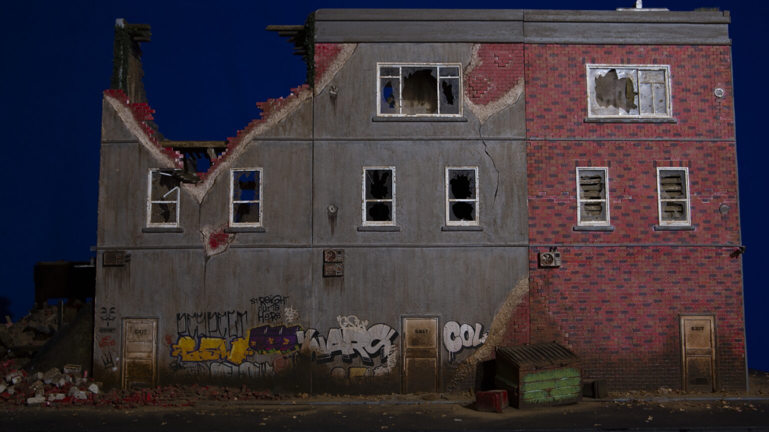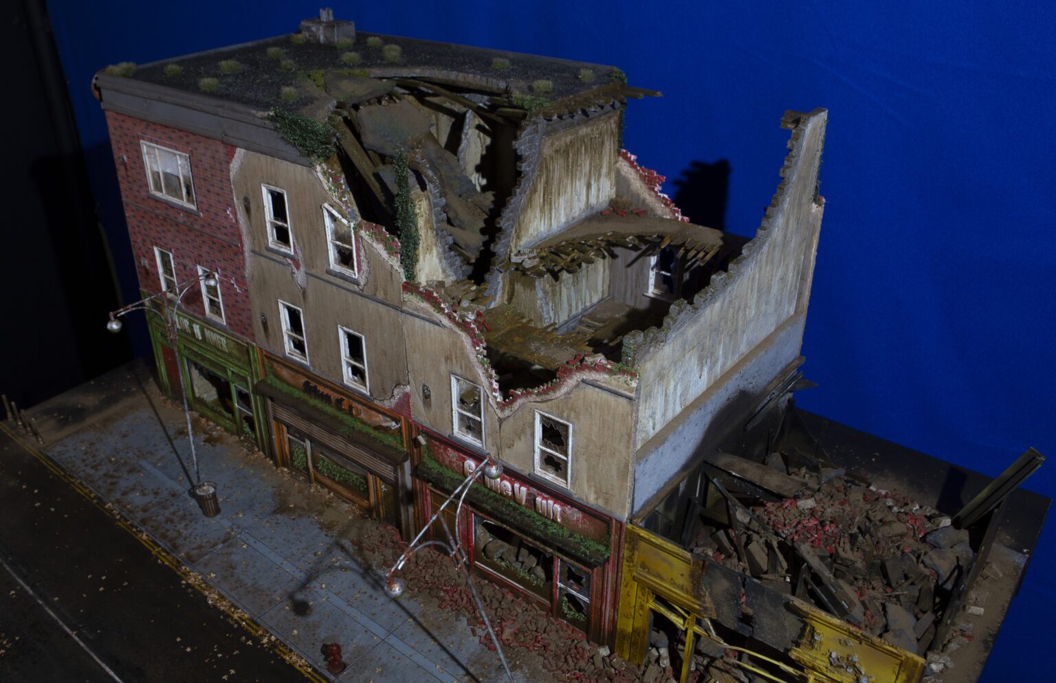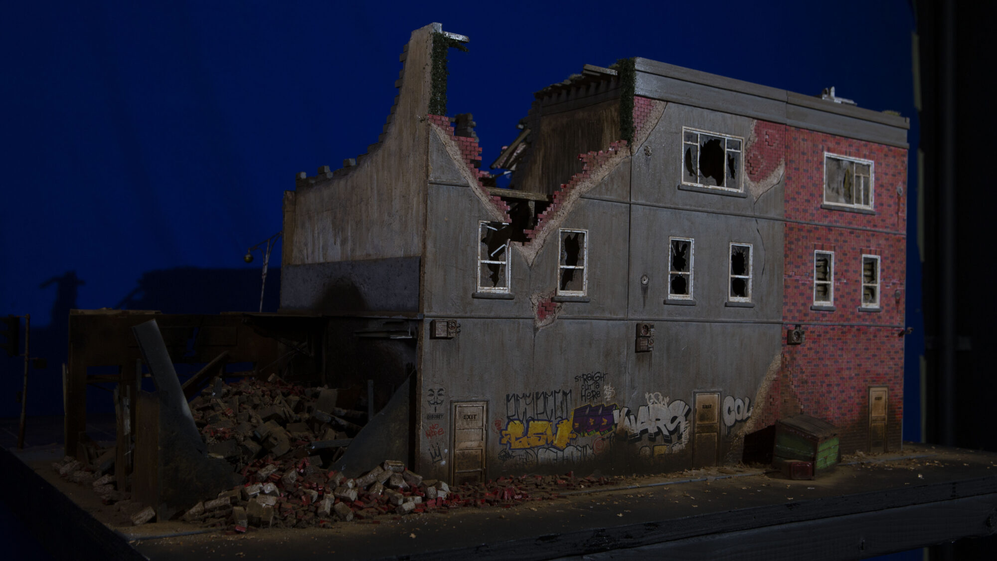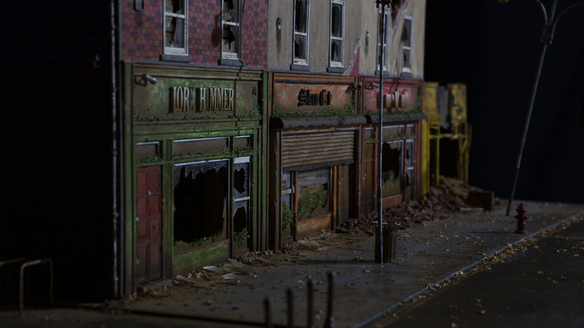 My main project is a 1:28 scaled miniature-modeled building/diorama to be used in a title sequence for an apocalyptic or war-torn-themed motion picture or television program. I also created a 1:20 scaled bedroom for the same purpose. The design of my main model takes inspiration from buildings seen in New York, combined with some elements from Irish architecture. The idea I had for the setting of this world was a devastating war that had taken place 10 years ago leaving only 30% of the world population alive. There is no government or order, just survival by any means. All the cities are ruins and are slowly being taken back by nature and wildlife. For the final part of my project I filmed the two models and created a title sequence featuring them both.