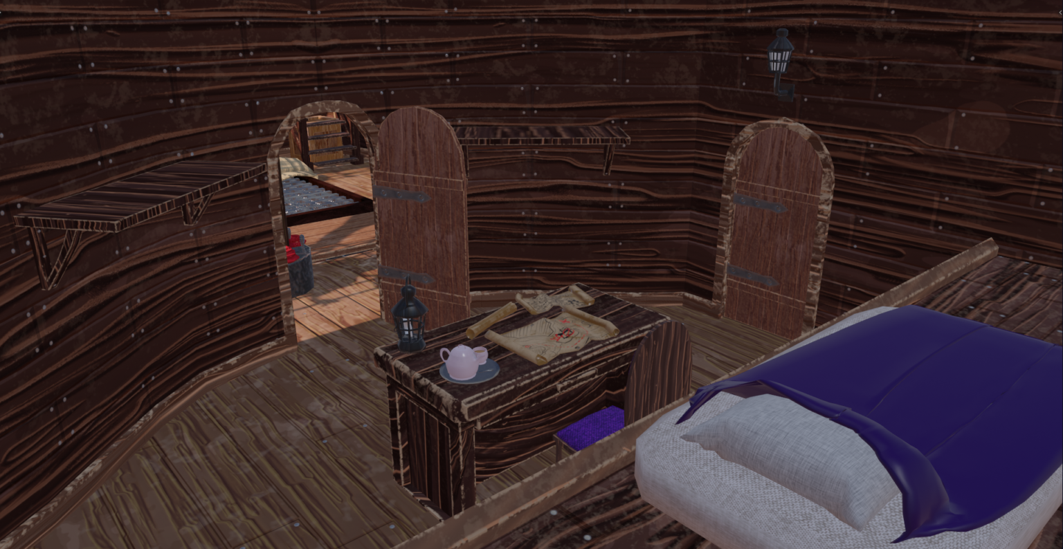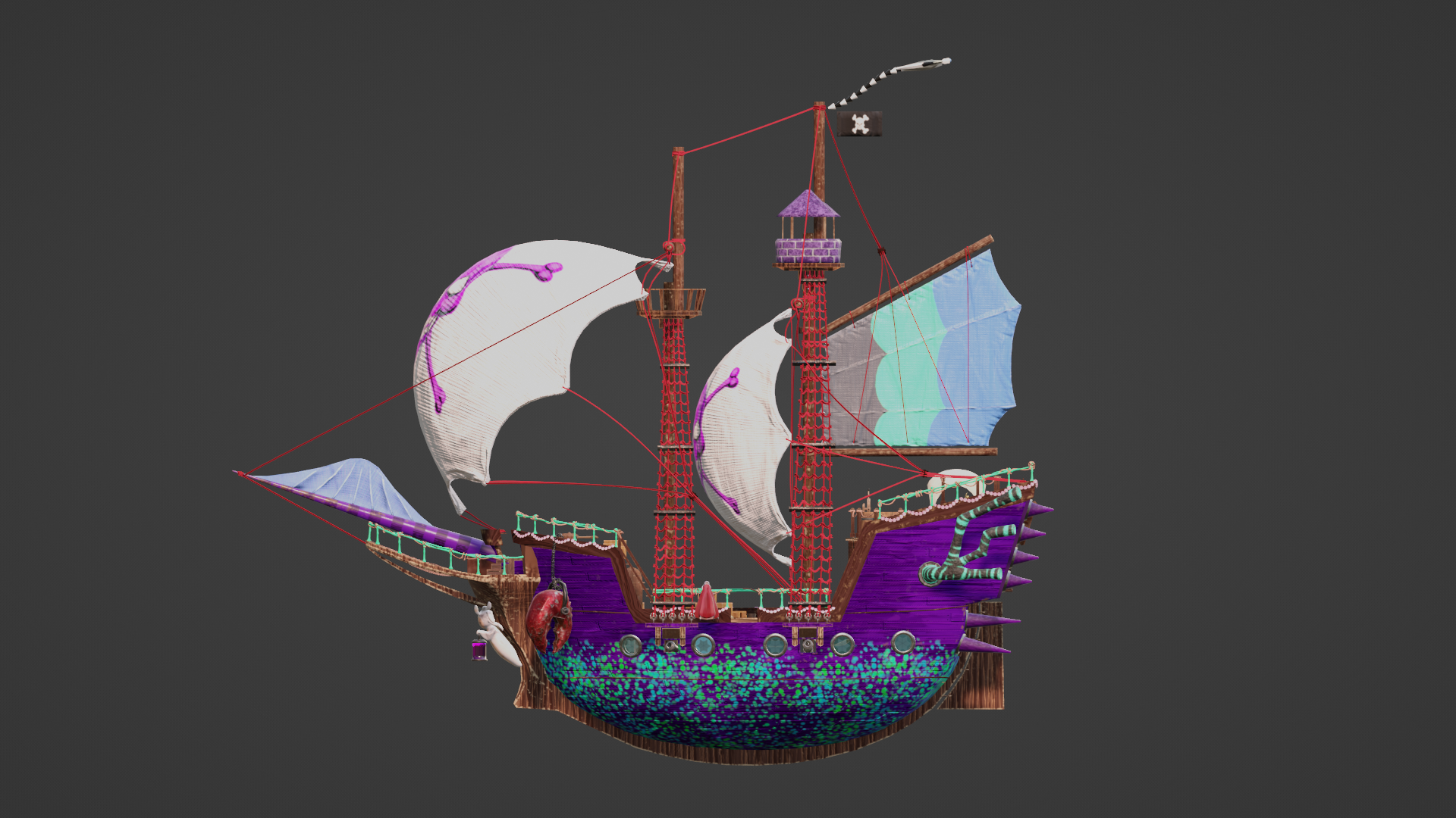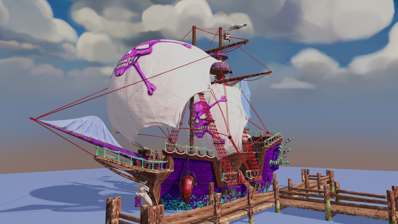 My final project is a short game experience made in Unreal Engine 5. The player, the inspector in this scenario, begins on a pier leading up to an eccentric-looking pirate ship dubbed the ‘Jellyfish Jamboree’. Upon boarding, the player will meet the ship’s captain, Captain Dokuzawa, who cheerily greets the inspector and allows them to traverse the ship to their heart’s content. The player can freely inspect the ship and its many quirks and points of interest, and once they are done exploring, can end the session by once again talking to the captain. This project is a letter of appreciation to character & game design. I thoroughly enjoy immersive games and animated media, and I want to create such things myself in the near future. Assets like the ship itself and the character were modelled in Blender, textured in Adobe Substance Painter, and imported into Unreal Engine 5.