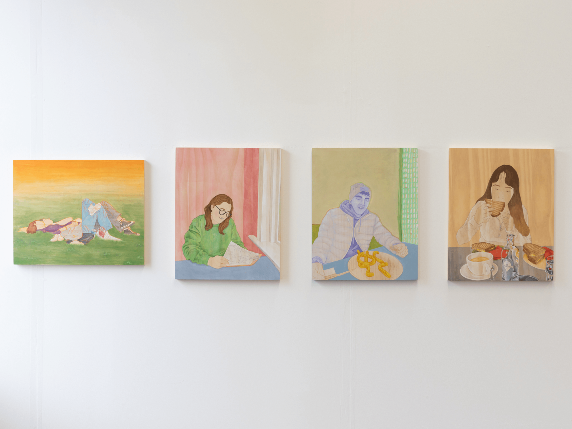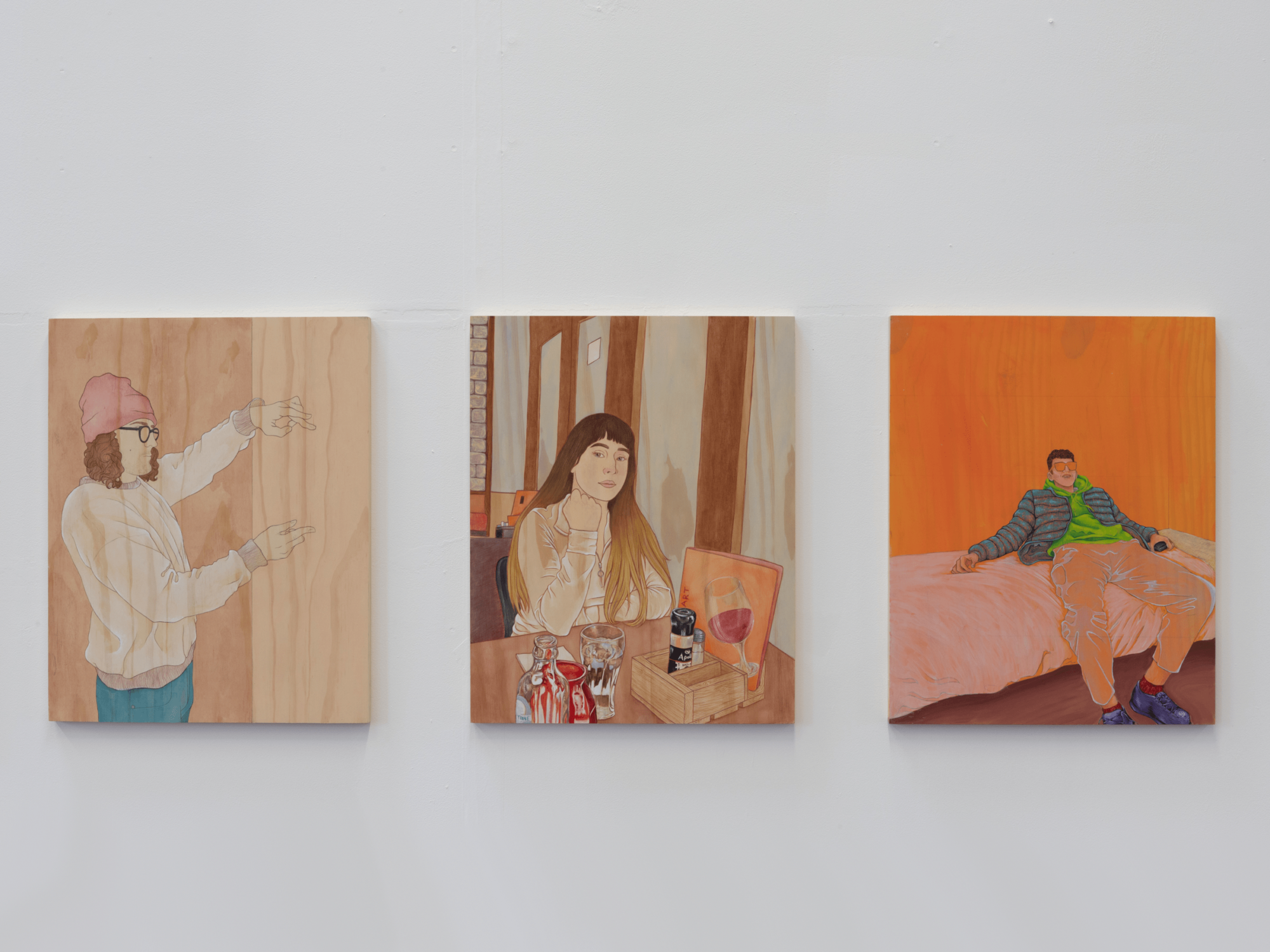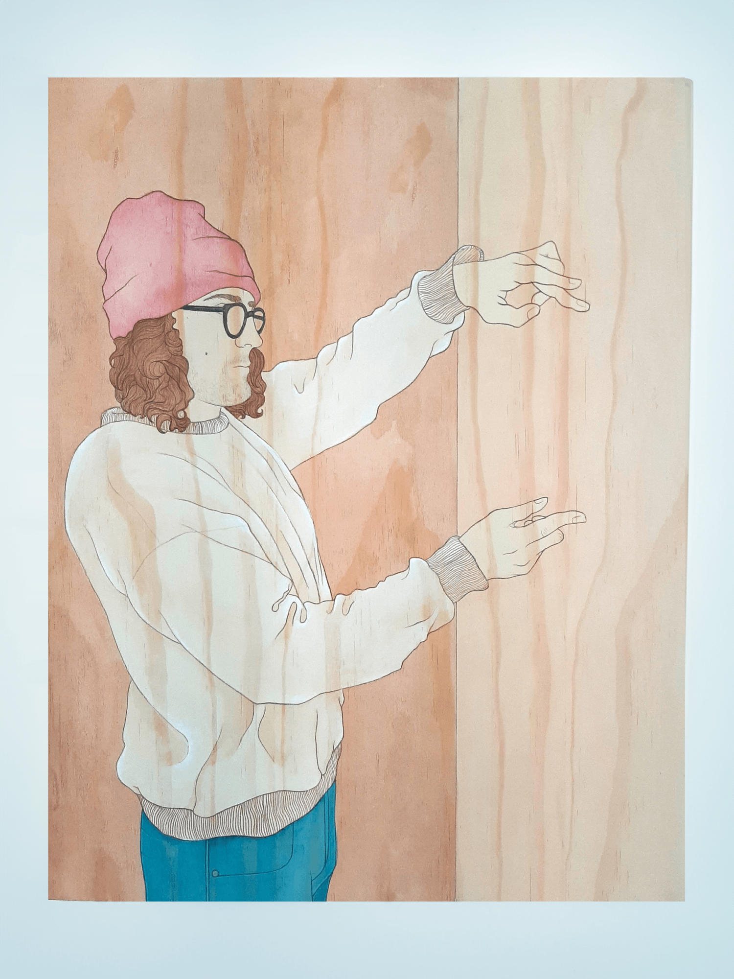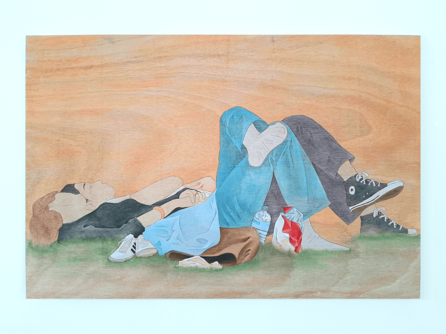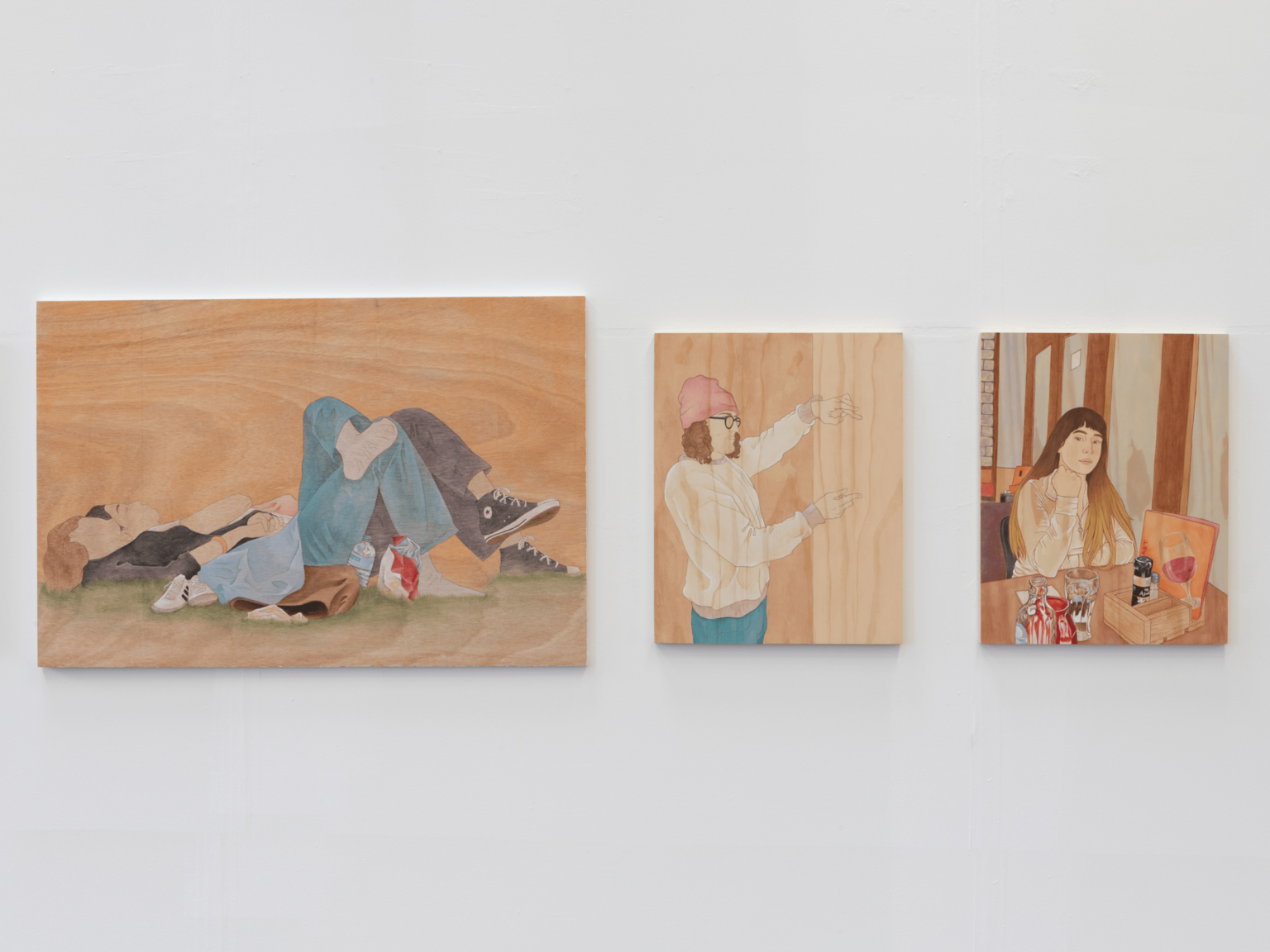 In my work, I aim to disassemble and rebuild candid fleeting moments from the everyday. Working from photographs I have taken throughout my day-to-day, my work manifests moments shared between people, often involving the viewer in the scene before them. I build up washes of acrylic paint to give certain tones of warmth to the final piece, allowing the wood grain to add to the final image without distracting from the simple lines of the figures. I use pencil and ink to create authoritative lines, in my drawings as well as my paintings, that aid in encapsulating the hold that shared time can have. This concept and project mean a great deal to me because it shows small kindnesses, connection, intimacy, and shared laughs which become increasingly important as we, as a society, grow farther from tribe and fire.