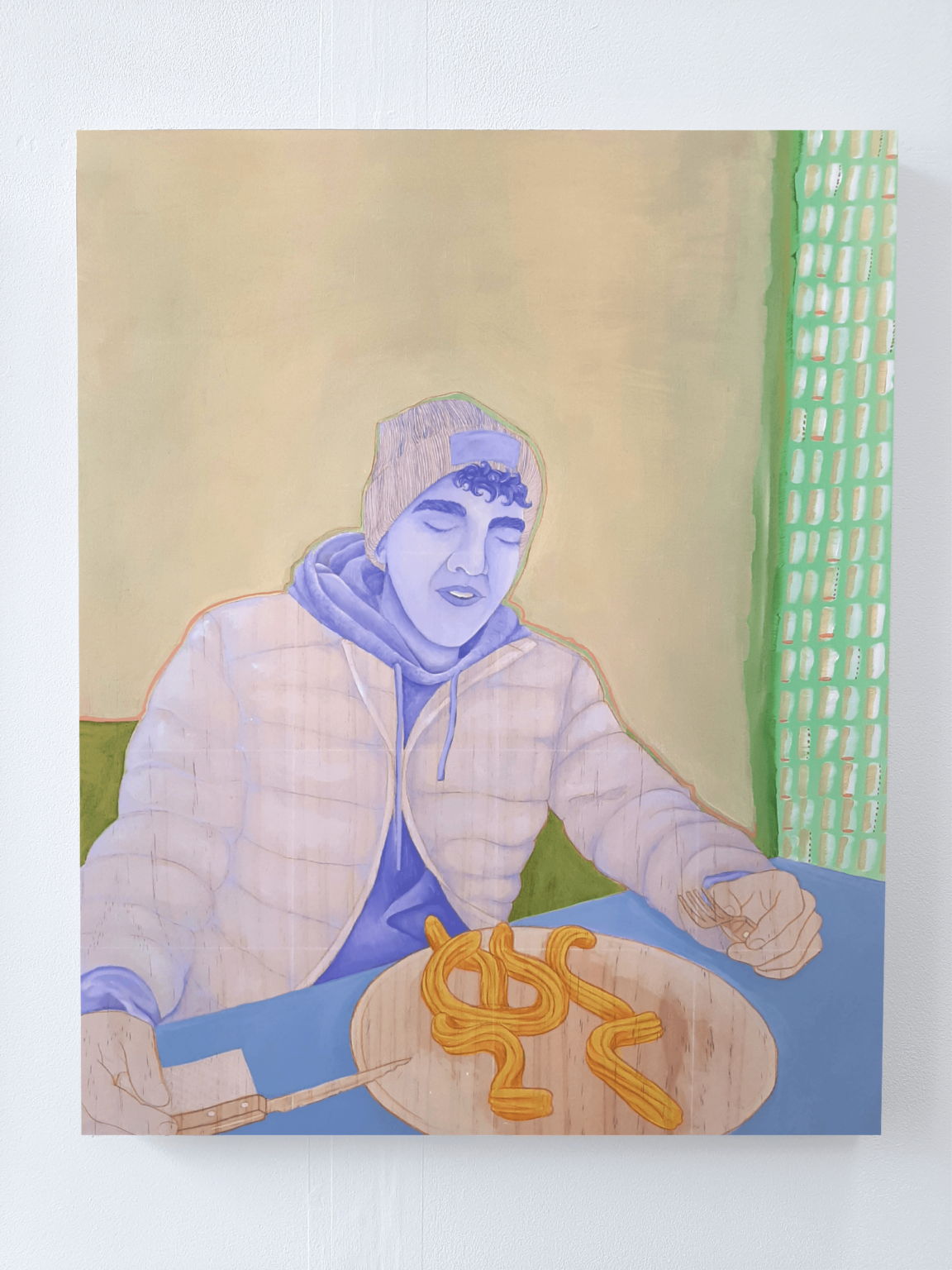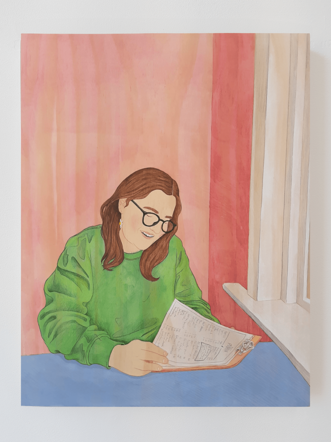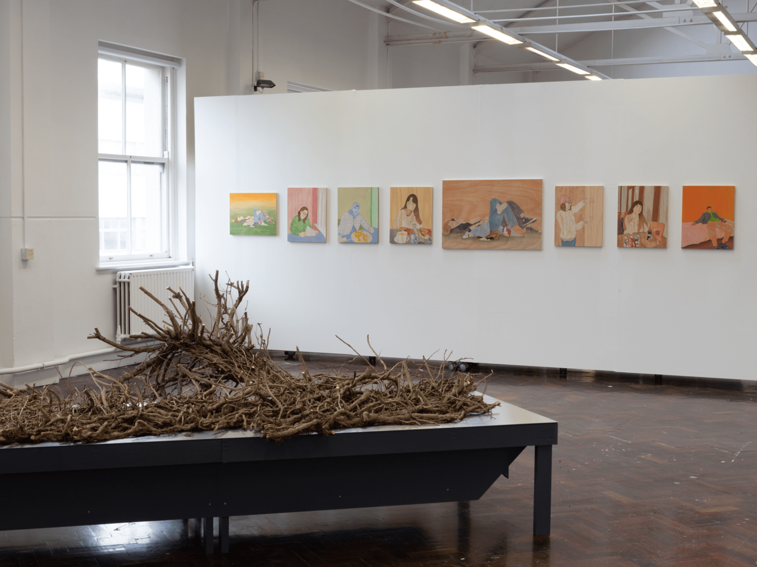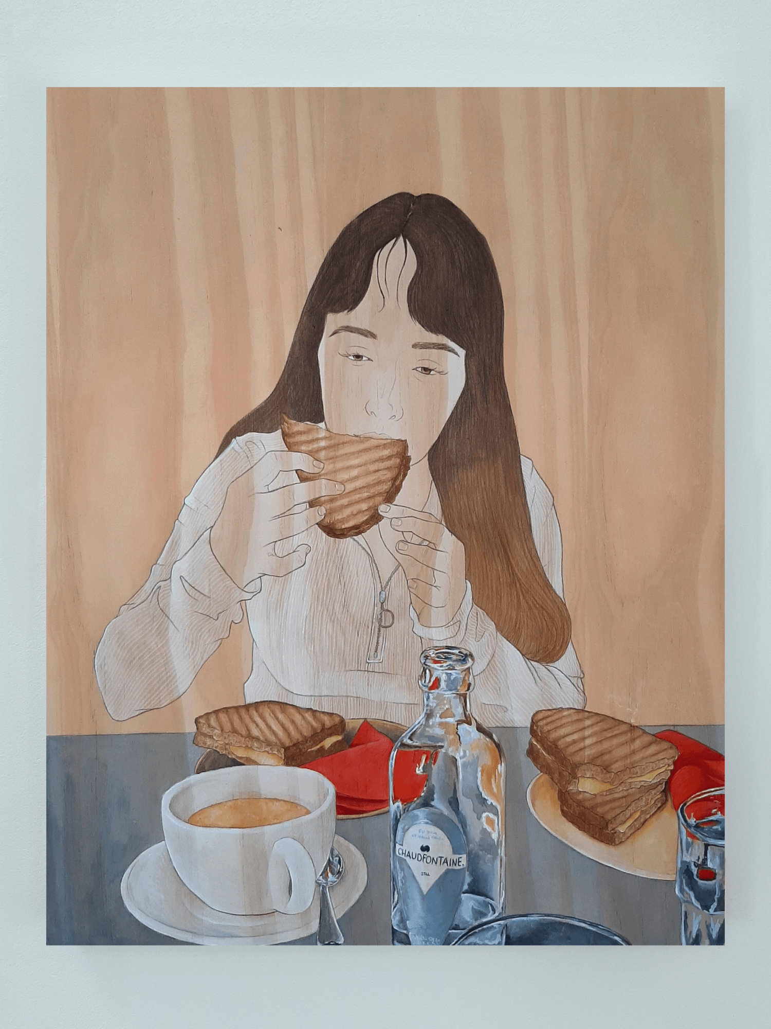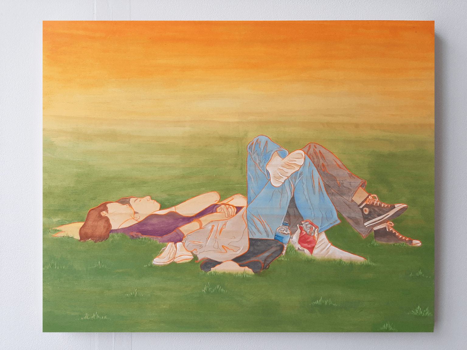 In my work, I aim to disassemble and rebuild candid fleeting moments from the everyday. Working from photographs I have taken throughout my day-to-day, my work manifests moments shared between people, often involving the viewer in the scene before them. I build up washes of acrylic paint to give certain tones of warmth to the final piece, allowing the wood grain to add to the final image without distracting from the simple lines of the figures. I use pencil and ink to create authoritative lines, in my drawings as well as my paintings, that aid in encapsulating the hold that shared time can have. This concept and project mean a great deal to me because it shows small kindnesses, connection, intimacy, and shared laughs which become increasingly important as we, as a society, grow farther from tribe and fire.