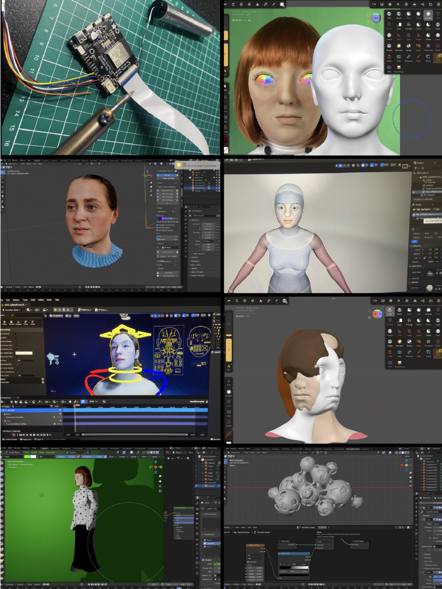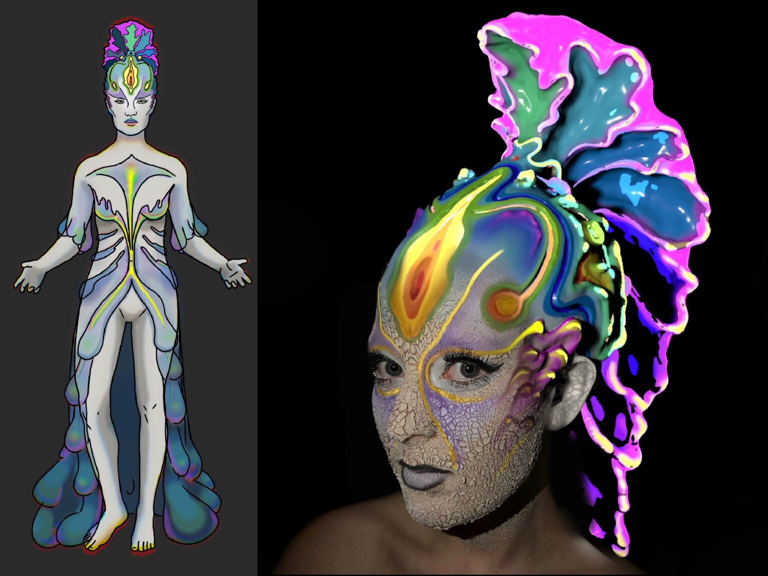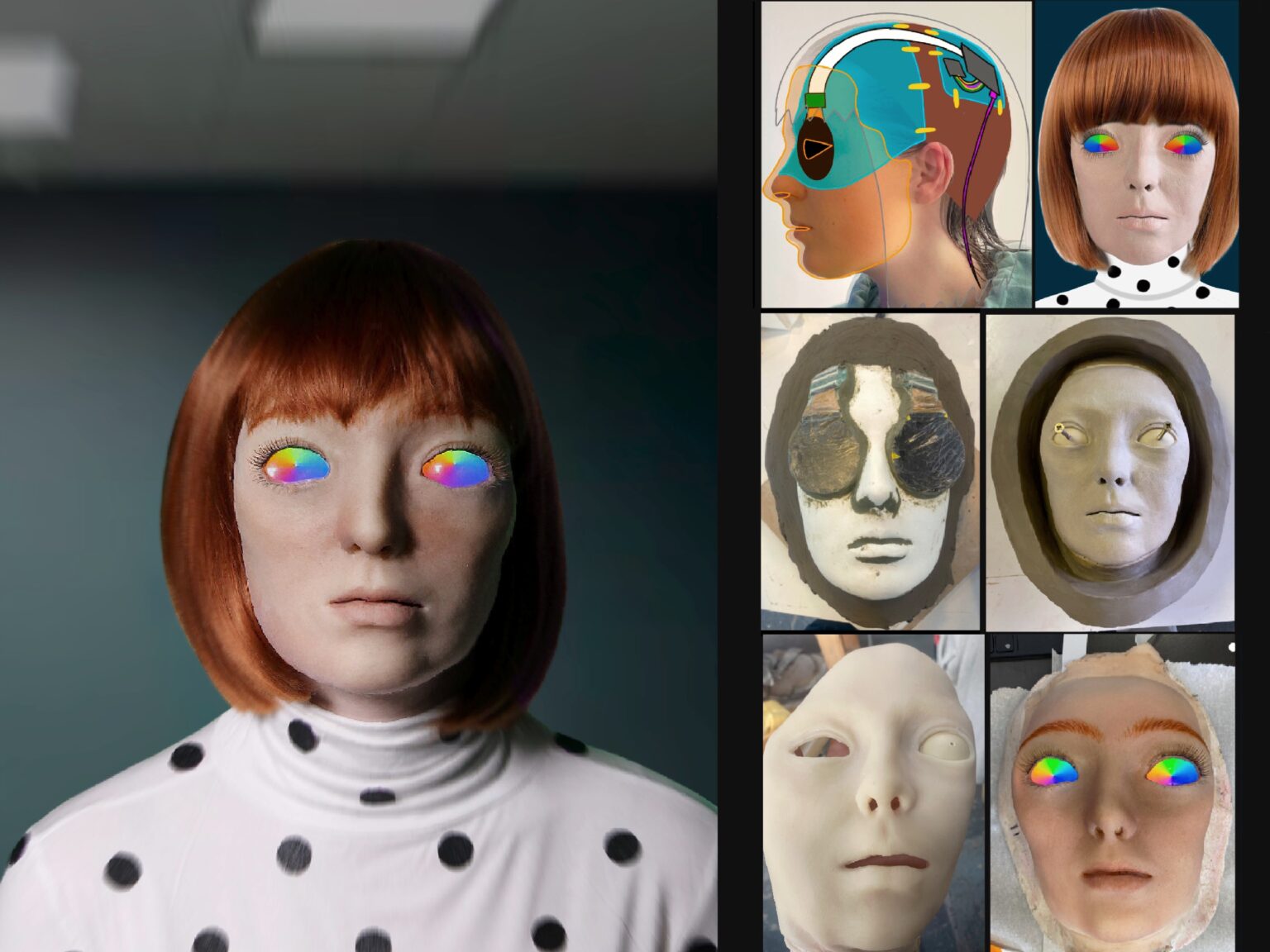 My Major Project is an exploration of findings from my thesis on the effect of the Uncanny Valley in 21st century charcter design. Having observed emerging technologies in areas of augmented reality and brain-computer interfaces I explored how advances in artificial intelligence technology might effect human evolution and present as a character. For this project I looked at the stengthening symbiotic relationship between humans and technology and questions if a human body altered with technology, specifically artificial intelligence, lies in the realm of human or in the uncanny valley. I used a combination of silicone prosthetics and 3d models to create the evolution of a character as her body becomes a vessel for an Ai system to grow, learn and navigate the world.