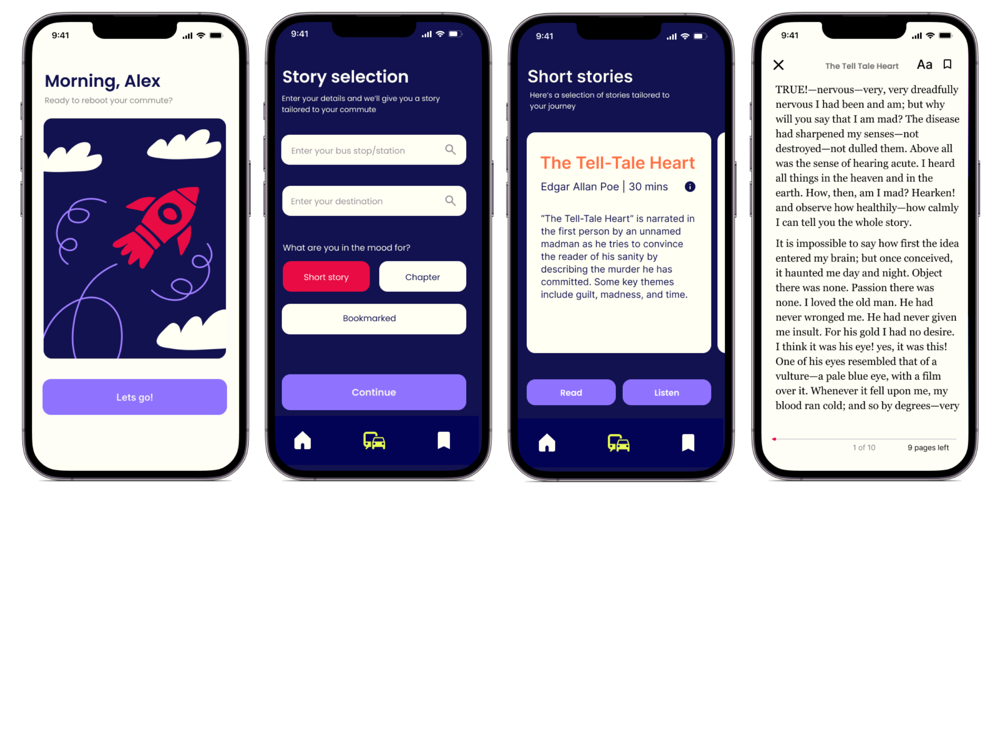 StoryLine is an app that aims to encourage public transport users to utilise their travel time in a more productive and meaningful way by reading curated short stories or chapters from a novel. By offering an alternative to time usually spent mindlessly scrolling on social media, the app encourages users to enrich their minds and make their commute more enjoyable. This provides a refreshing break from passive consumption, putting magic into the mundane.