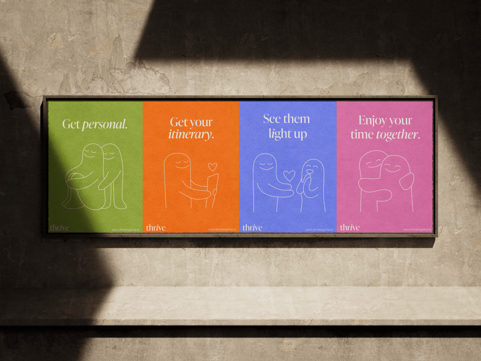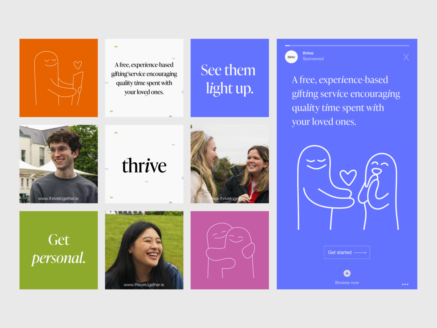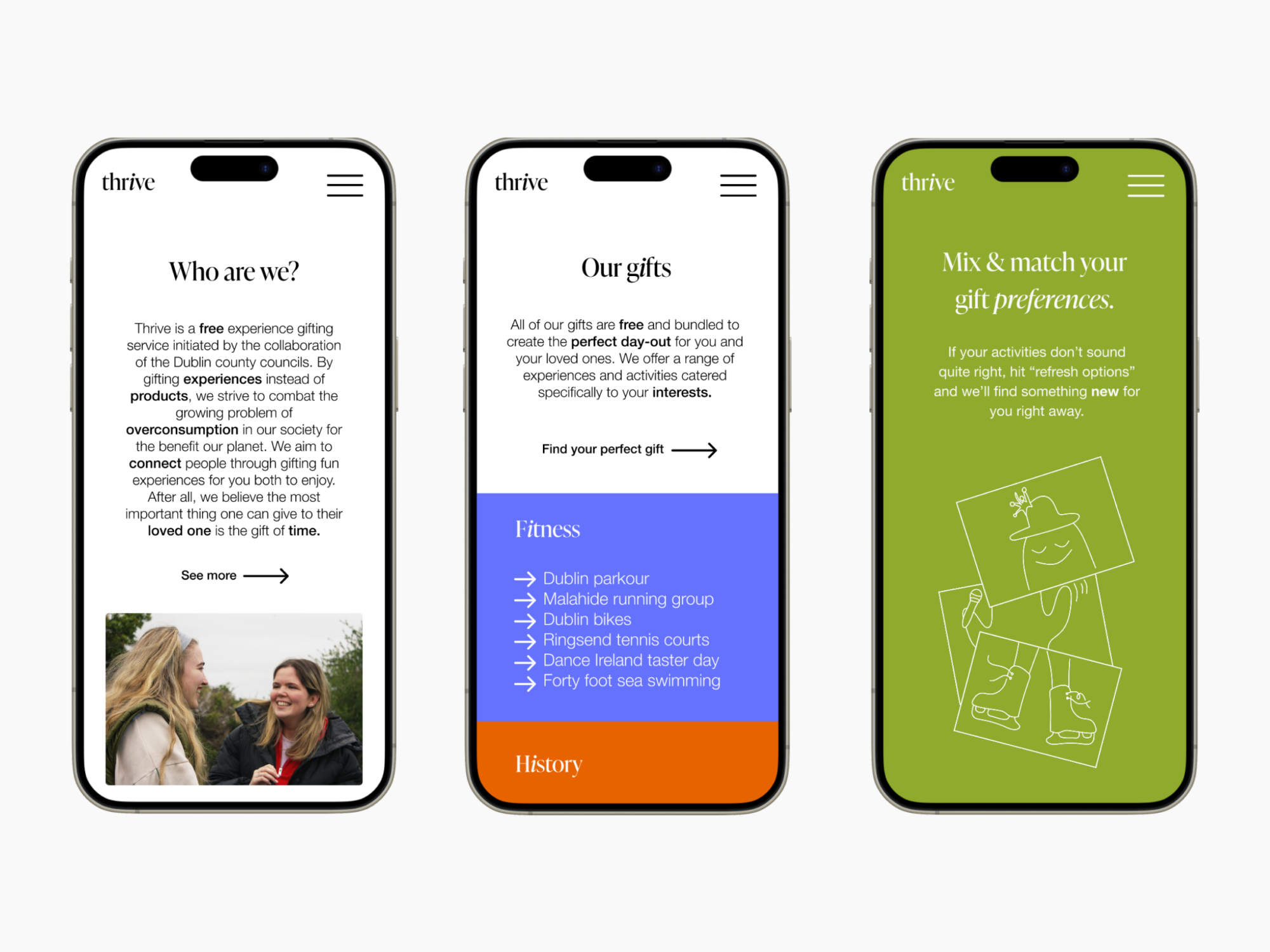 Thrive is a free experience gifting service initiated by the collaboration of the Dublin county councils. The service curates an itinerary of free activities, such as cliff walks, live music sessions, and food markets. The key values of this service are sustainability and personal connection, specifically among young adults. Gifting experiences is not only more sustainable than gifting products, but also a meaningful way of spending quality time with your loved ones. Thrive gives young people the opportunity to spend time with their friends and family on celebrated occasions, away from technology.