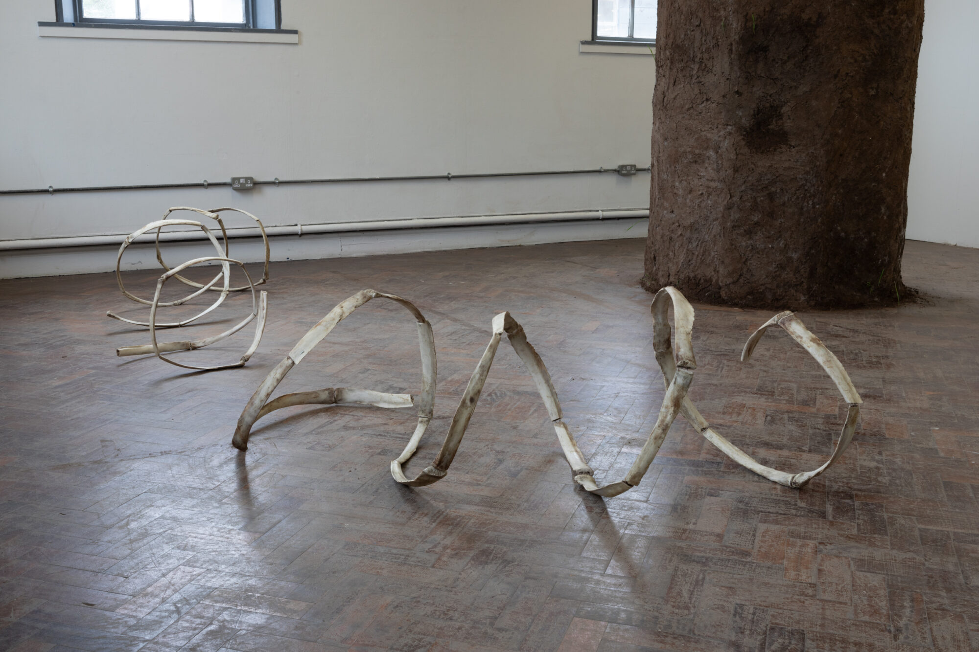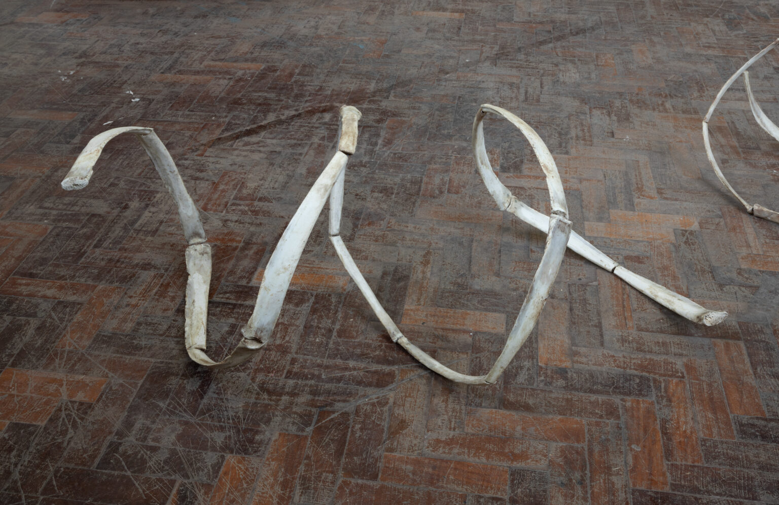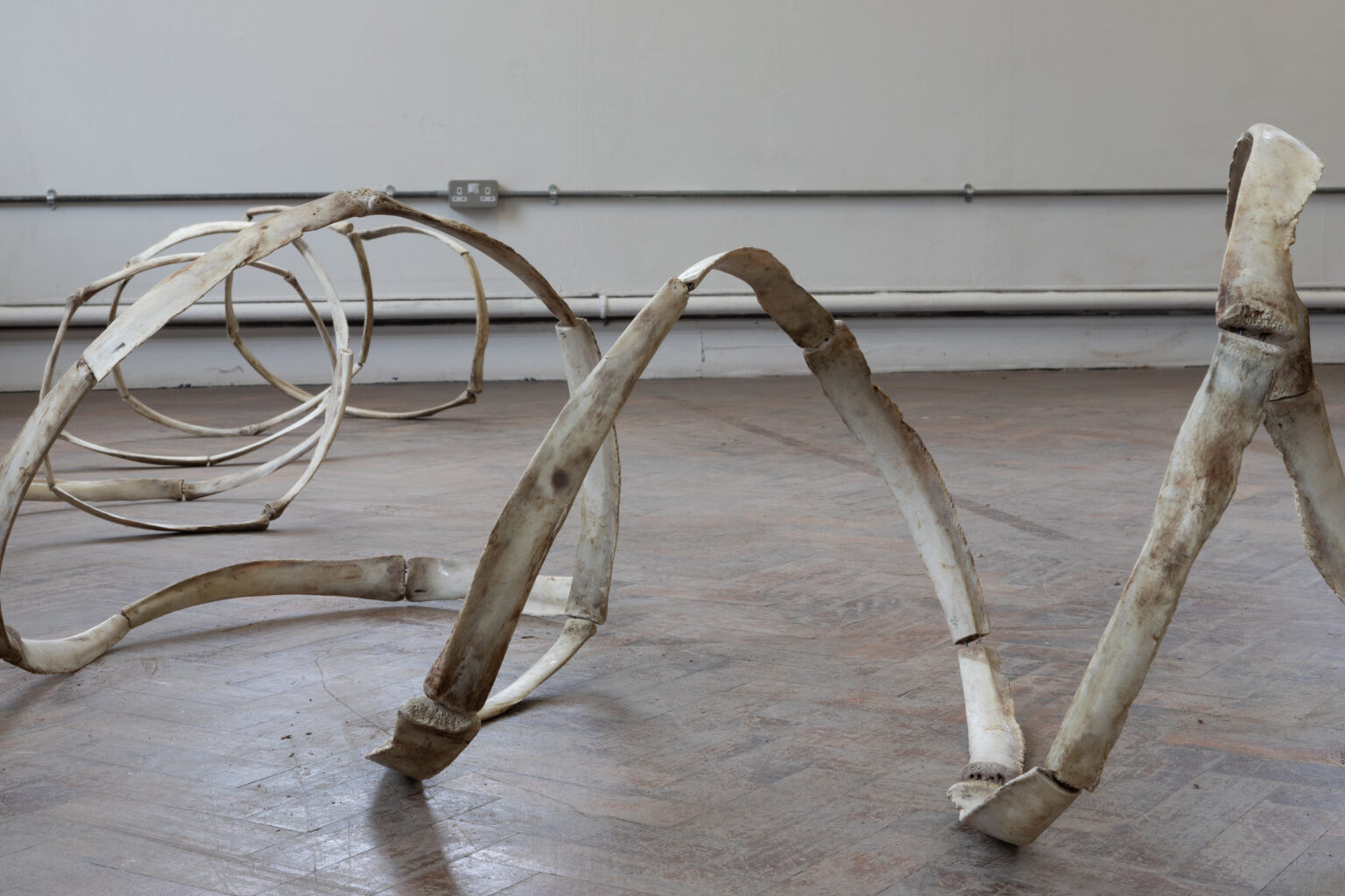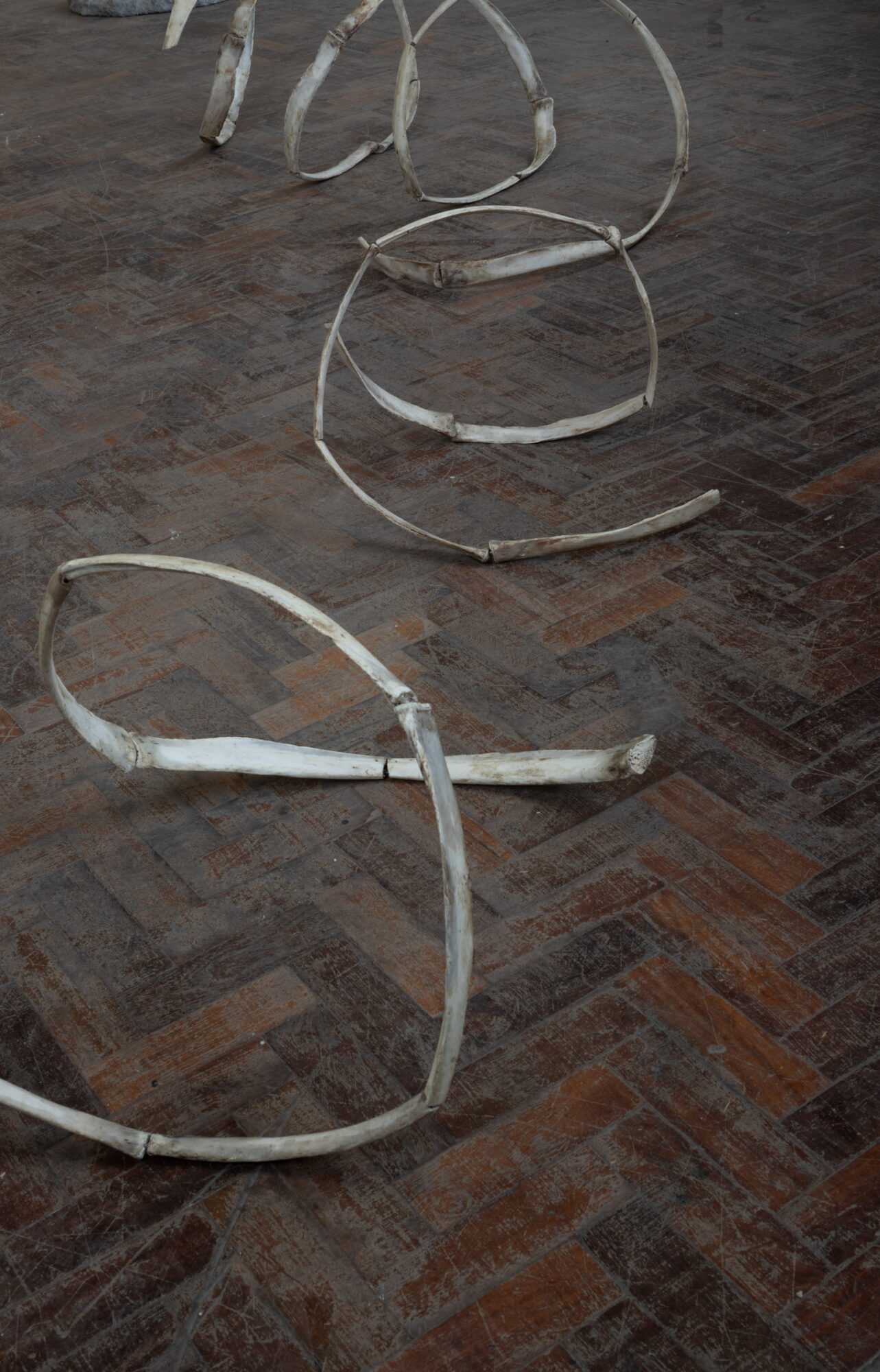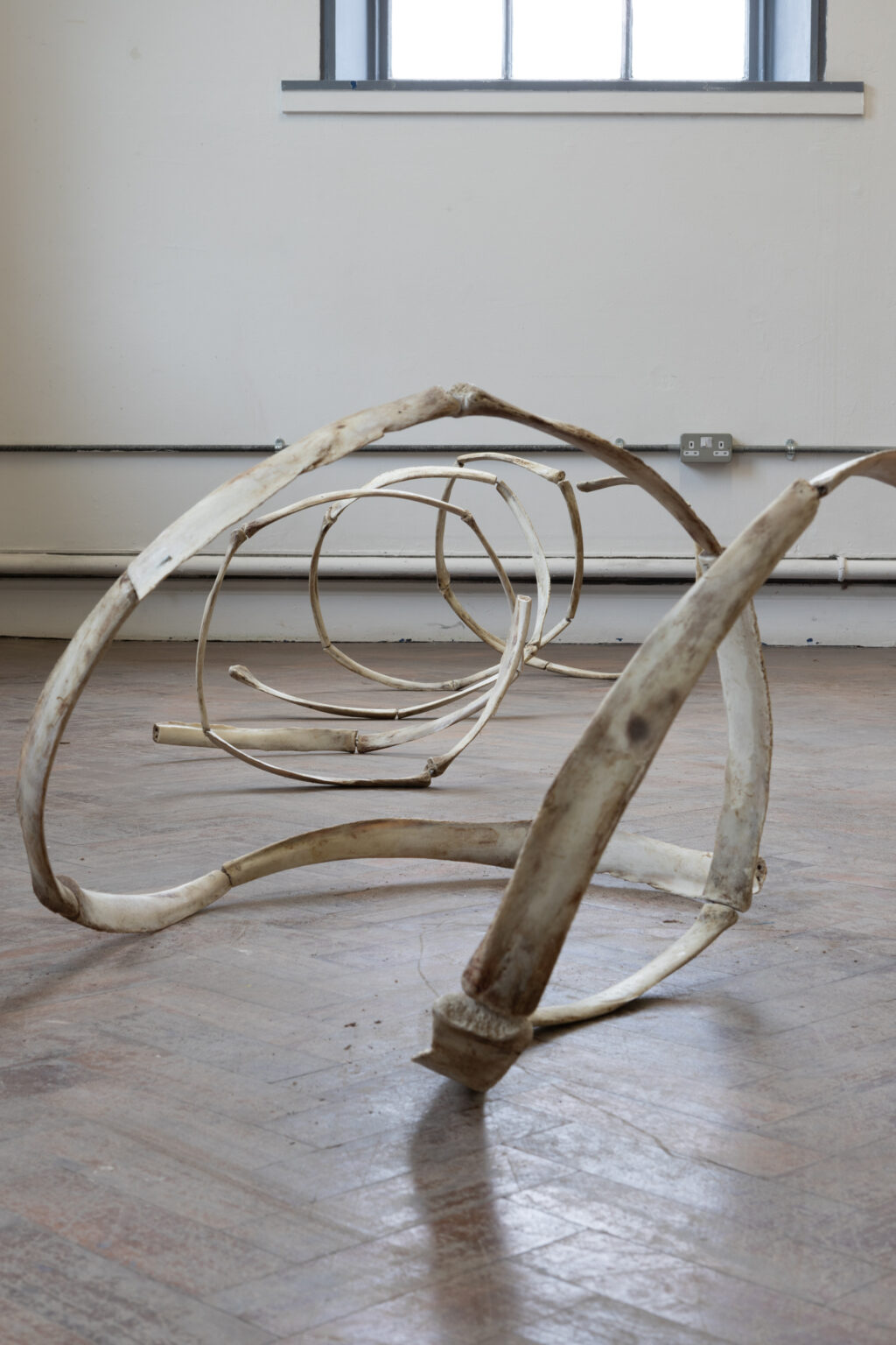The finality of mortality is something that I am discussing in my work through the materials. I was drawn to the idea of using bones that are in the stages of decomposition and beginning a new transitional phase of their existence. In this project, I interpret the bones' natural curvature, creating a piece informed by the materials' organic shape. In a way the bones act as an allegory for existentialism, specifically examining the linear existence paved in society which contrasts the cyclical nature on the material that is exhibiting it.