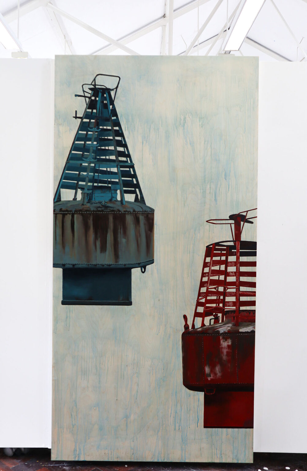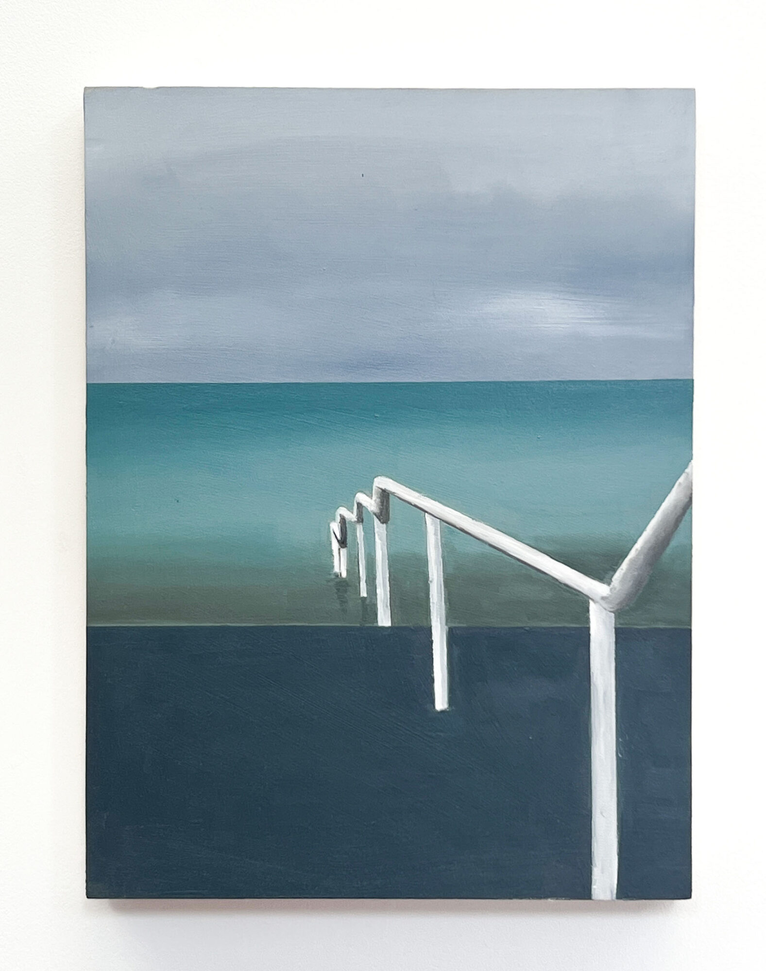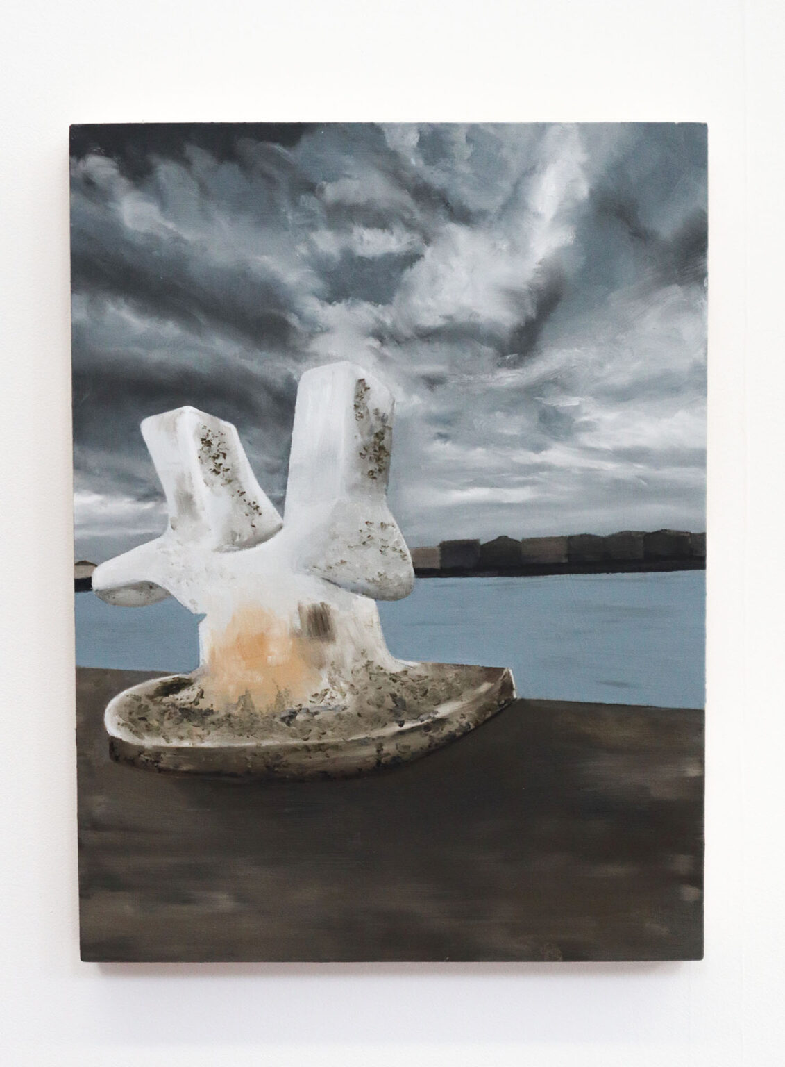 All my life I have been fascinated by the sea. John Masefield’s rhythmic poem “Sea fever” with its repeated “I must go down to the seas again…” resonates deeply with me. In this project I wanted to explore an element of humanity’s relationship with the sea, that of anchorage. By focusing on this idea many questions emerged. What is it that anchors us to the land but allows interaction with the sea? Are these objects markers of time, or ways we can utilise the sea? I examined these questions by working on birch wood panels, using both acrylic and oil paint. In some paintings the abstract background represents the sea and the light layers of paint allow the wood grain to appear, giving another dimension to the sea. In others, the scenes are flattened to create a sense of calm and tranquility.