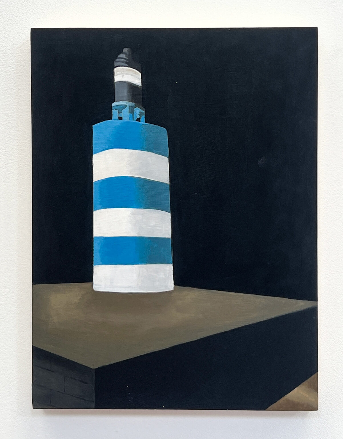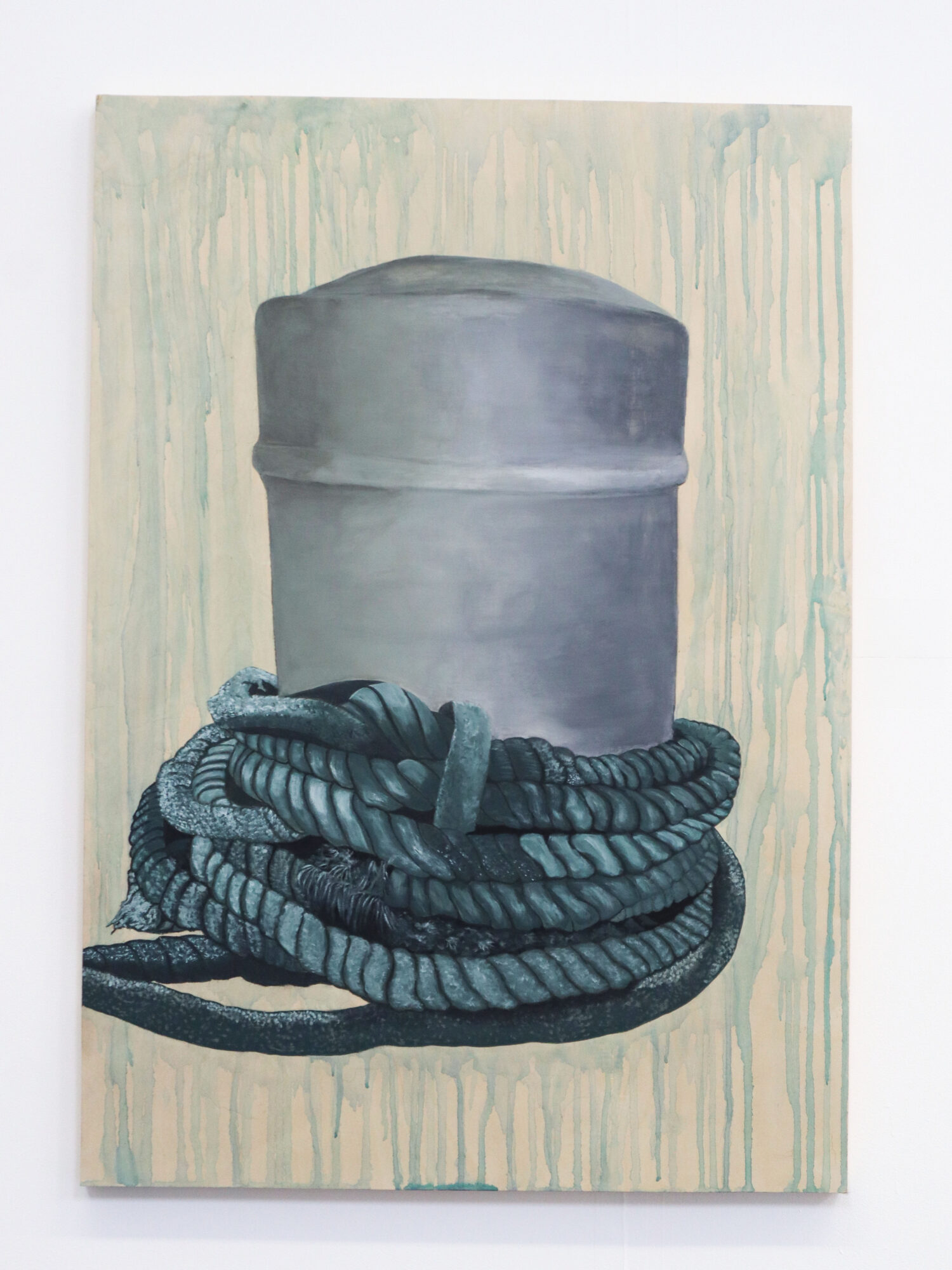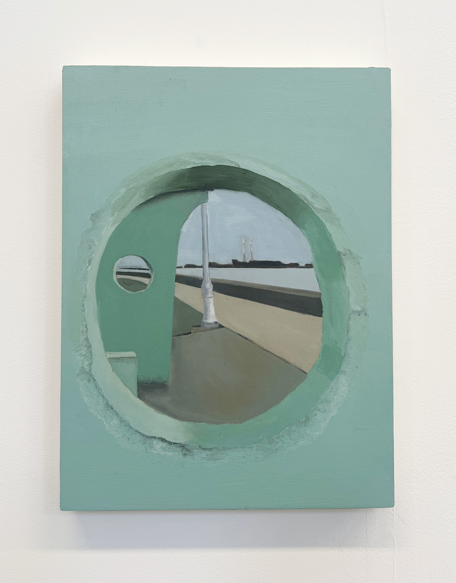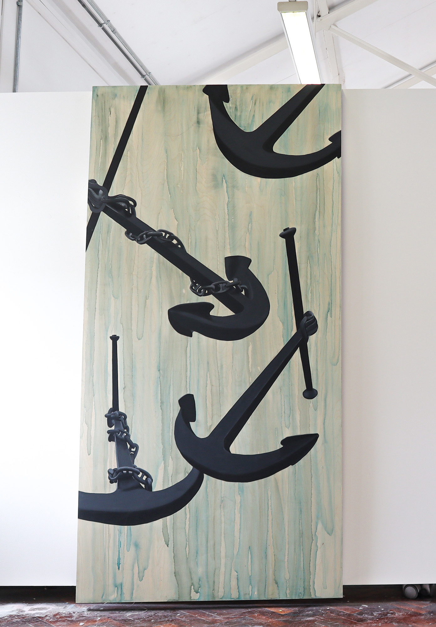 All my life I have been fascinated by the sea. John Masefield’s rhythmic poem “Sea fever” with its repeated “I must go down to the seas again…” resonates deeply with me. In this project I wanted to explore an element of humanity’s relationship with the sea, that of anchorage. By focusing on this idea many questions emerged. What is it that anchors us to the land but allows interaction with the sea? Are these objects markers of time, or ways we can utilise the sea? I examined these questions by working on birch wood panels, using both acrylic and oil paint. In some paintings the abstract background represents the sea and the light layers of paint allow the wood grain to appear, giving another dimension to the sea. In others, the scenes are flattened to create a sense of calm and tranquility.
