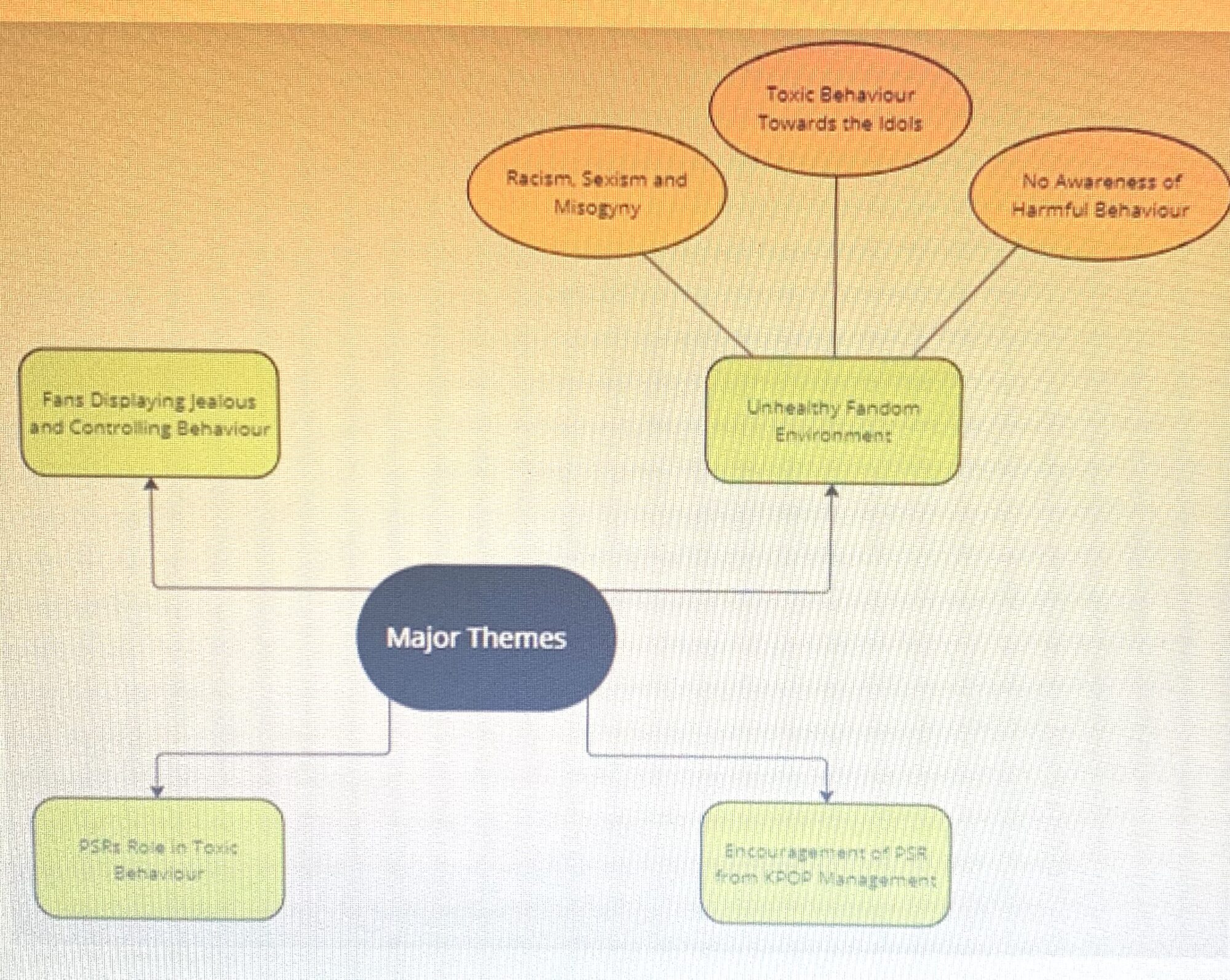 The primary findings arising from the study were that there is an unhealthy environment within the K-POP fandom, and that K-POP management actively encourage parasocial relationships as management monetarily benefit from fans engaging in PSRs. The method of PSR encouragement can result in a toxic fan culture. Additionally, fans can become jealous and controlling over the K-POP idols, as fans believe themselves entitled to unfiltered access to the idols’ lives.